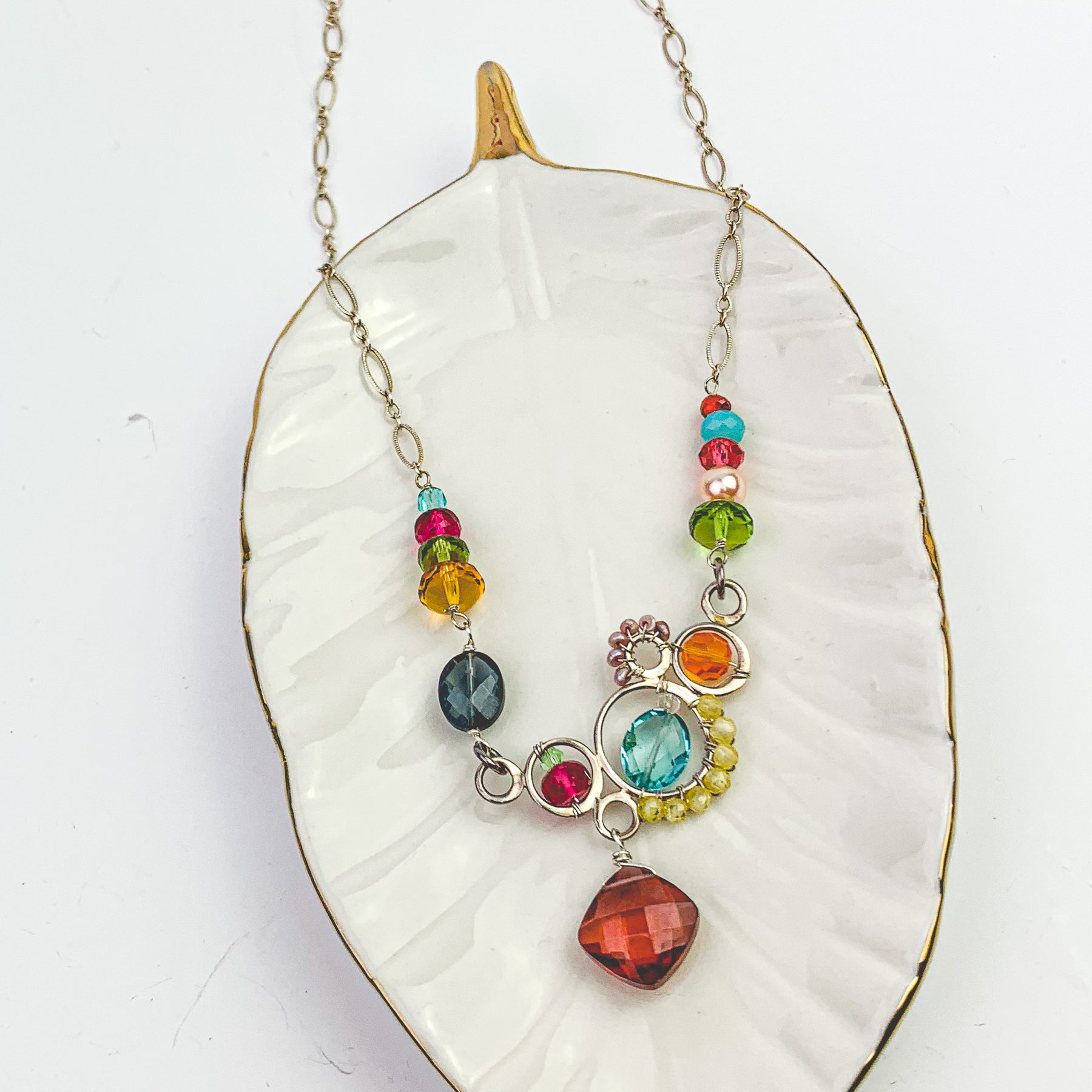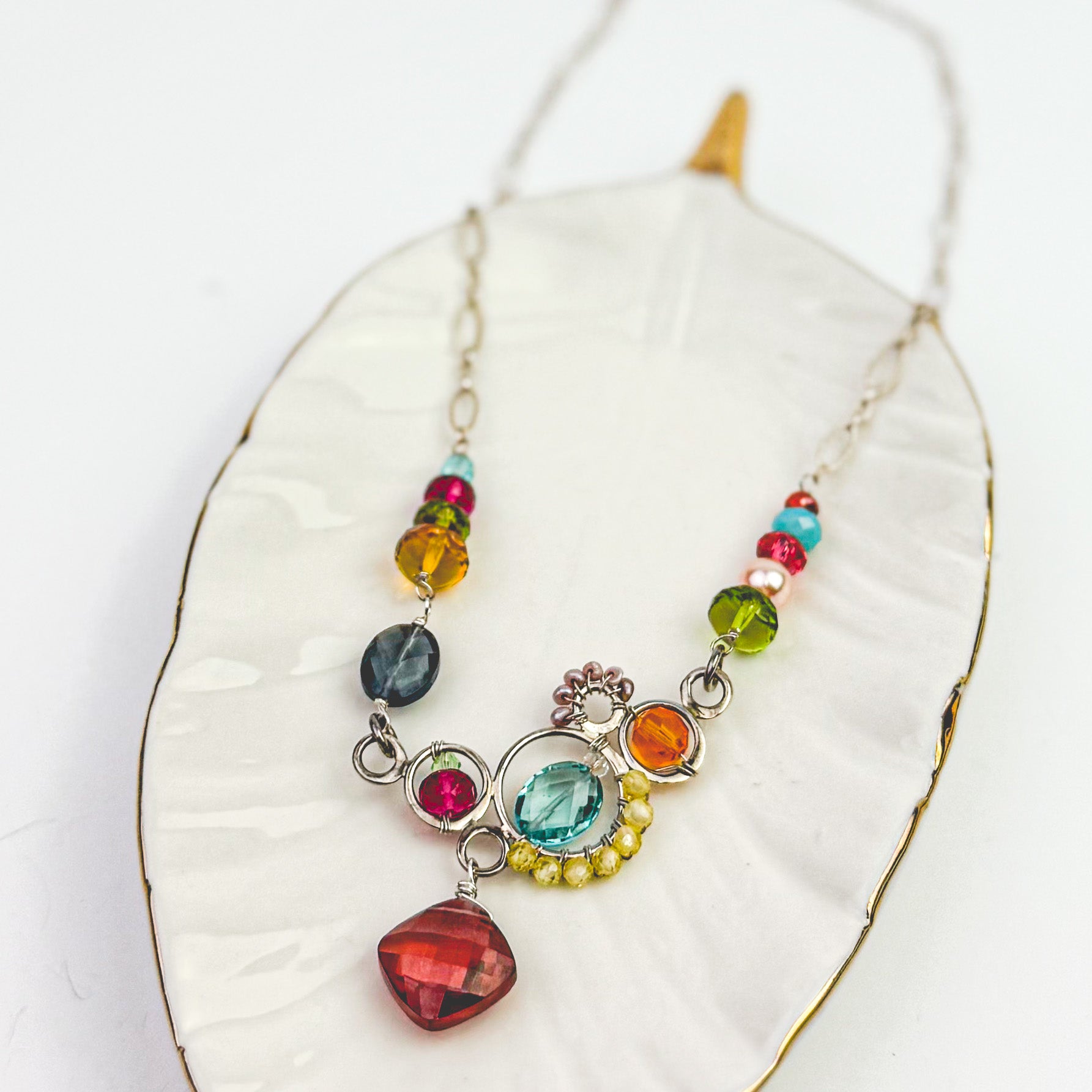 An exquisite one-of-a-kind jewelry set by Anatoli, featuring a luminous hand-carved mother of pearl centerpiece framed in sterling silver with rich 18K gold vermeil accents. The round pendant, approximately the size of a quarter, creates a soft yet confident focal point with beautiful presence without feeling oversized.