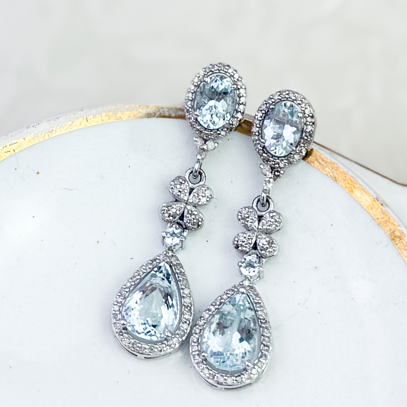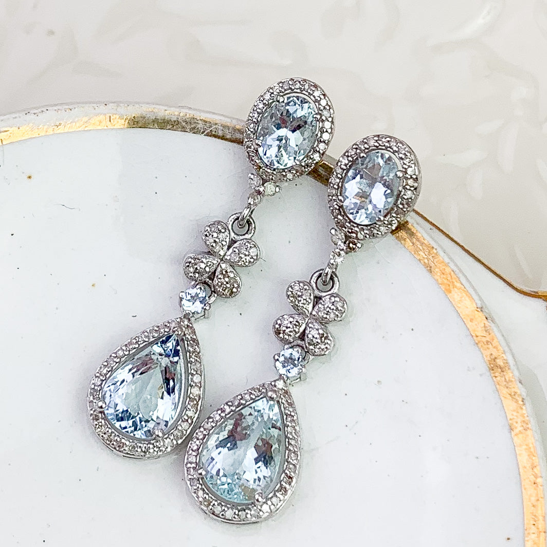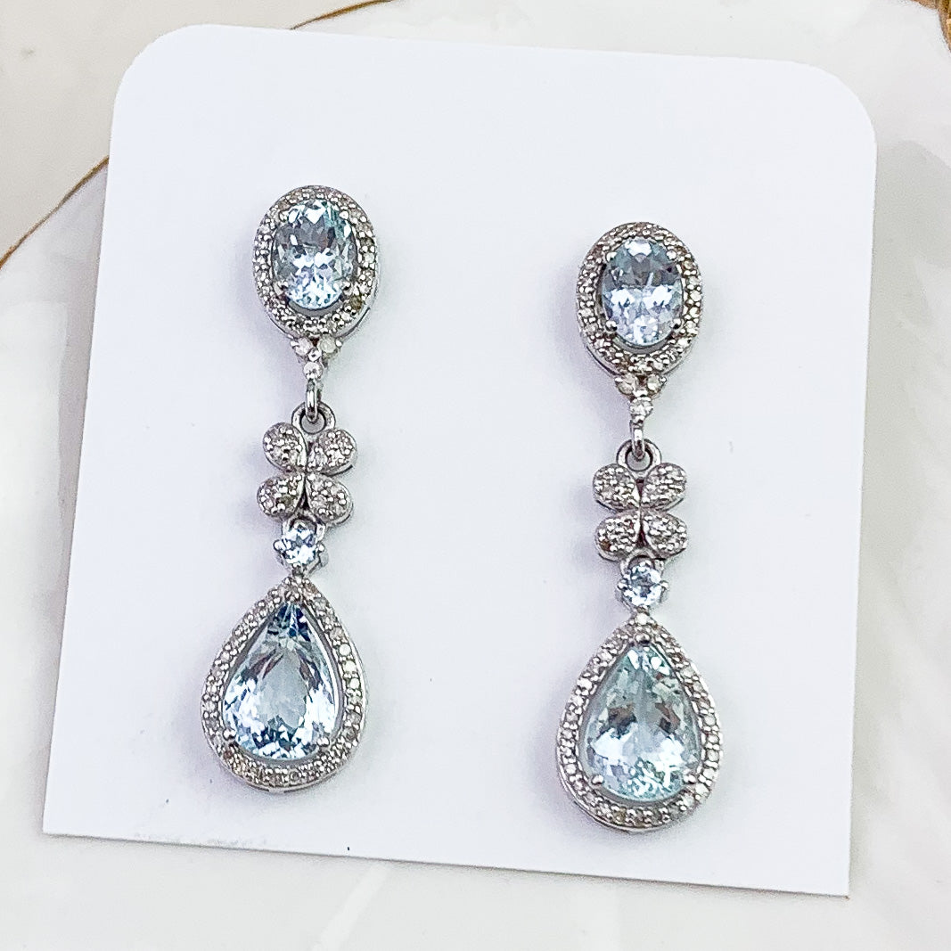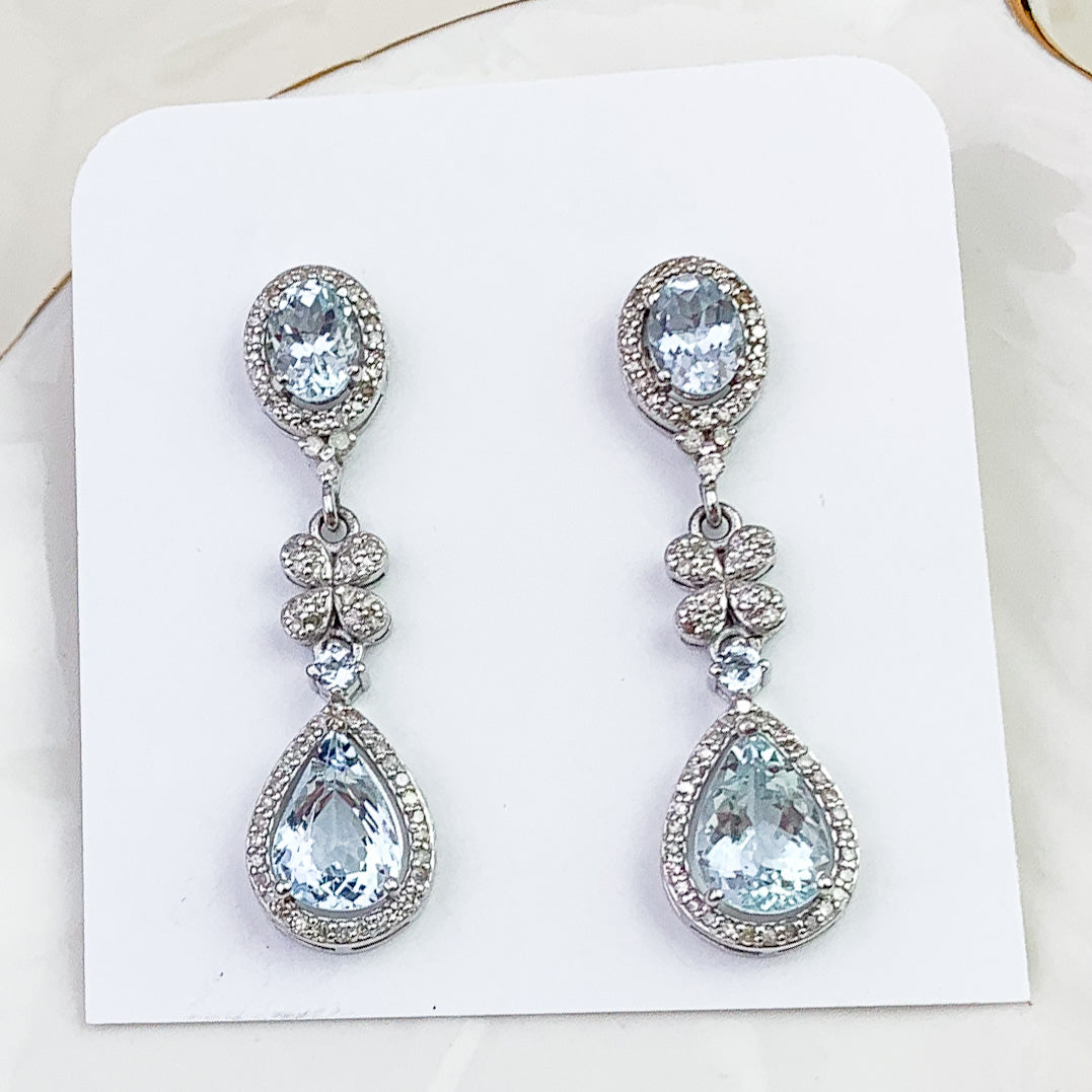 Refined Aquamarine and Diamond drop earrings featuring approximately gorgeous Aquamarine accented with Diamonds. Set in sterling silver, with the post component in gold for comfort and durability. A soft icy blue tone makes these easy to wear for both everyday and occasion dressing.
