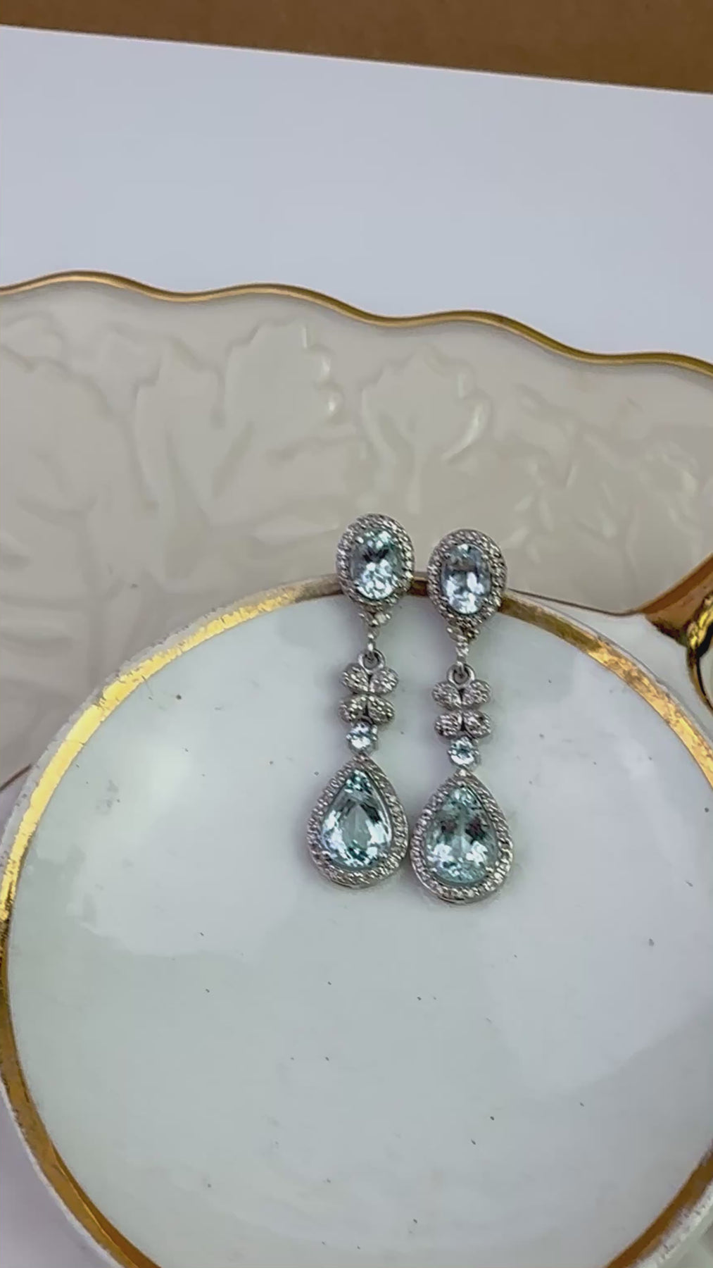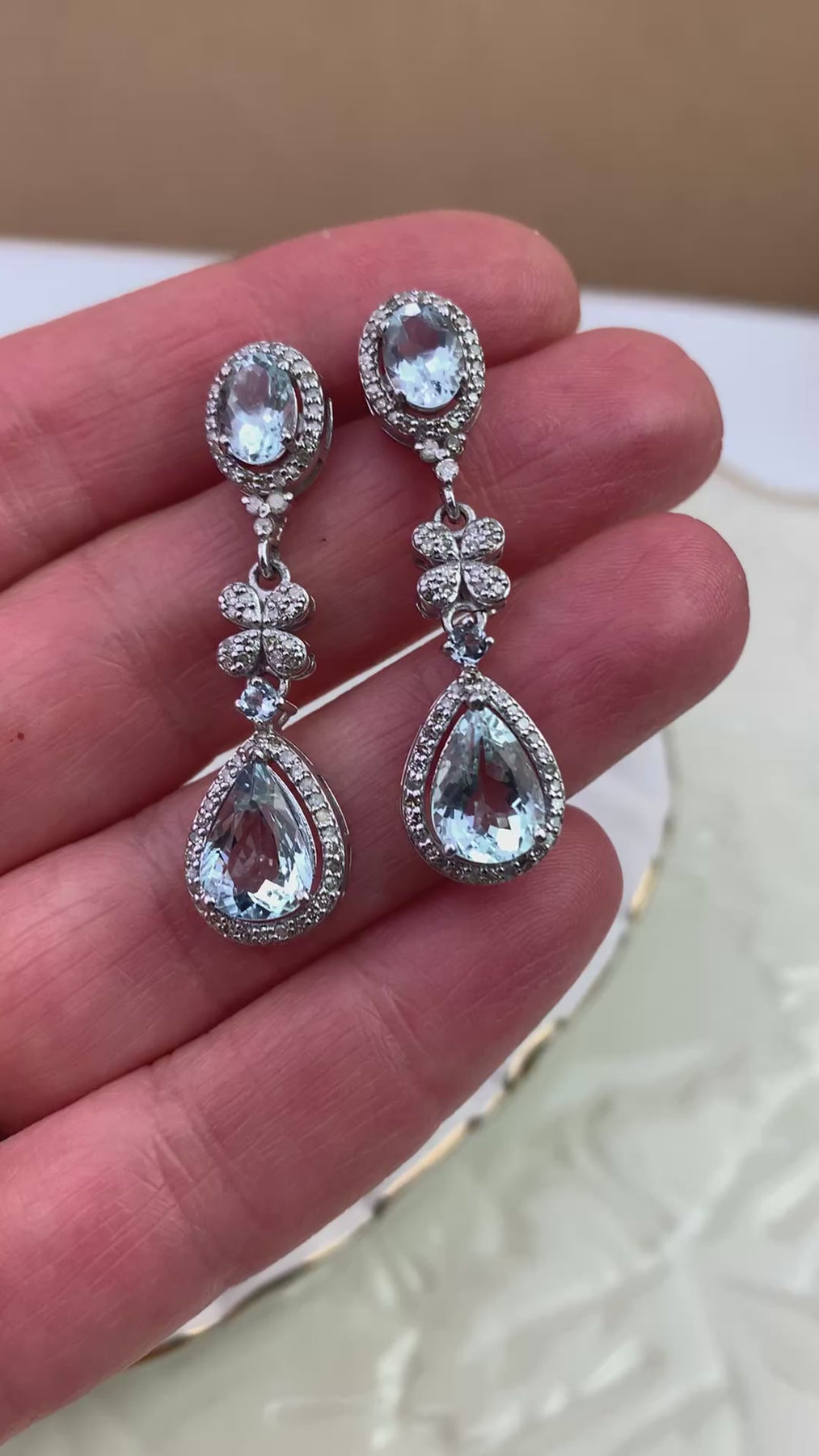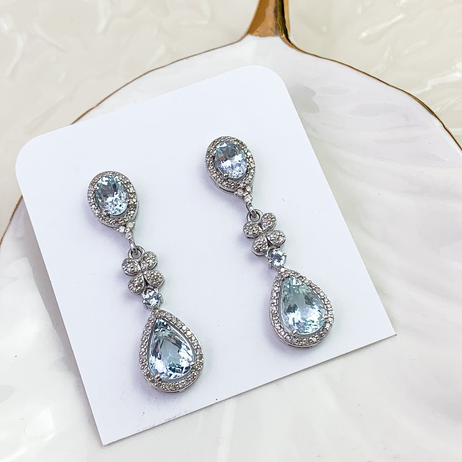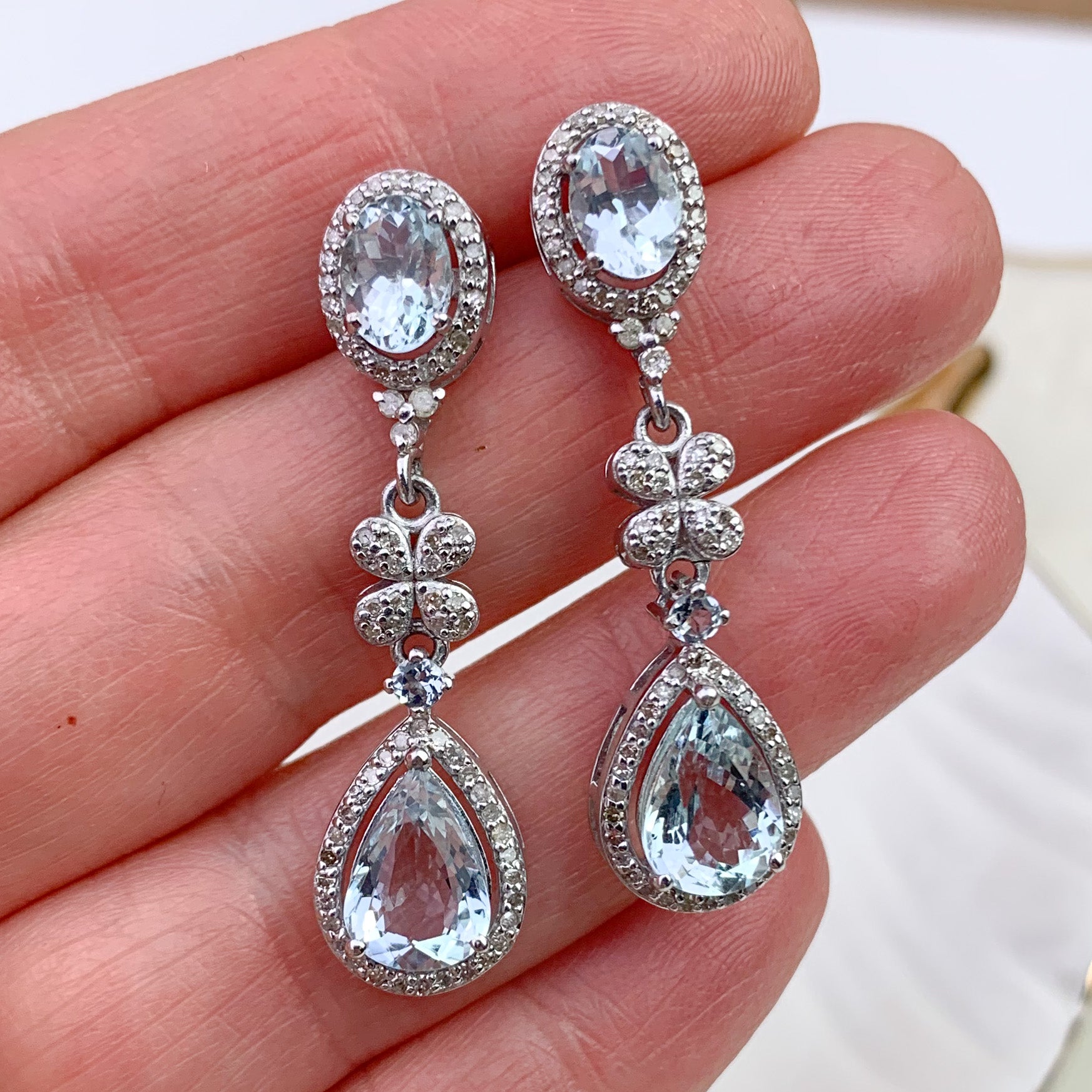 Refined Aquamarine and Diamond drop earrings featuring approximately gorgeous Aquamarine accented with Diamonds. Set in sterling silver, with the post component in gold for comfort and durability. A soft icy blue tone makes these easy to wear for both everyday and occasion dressing.