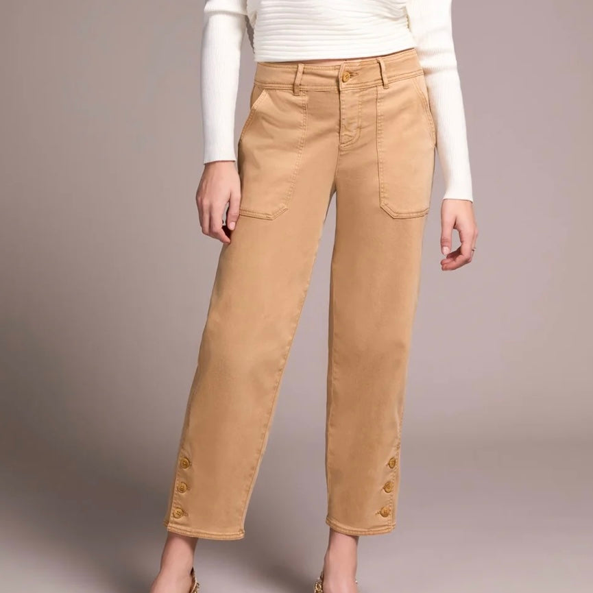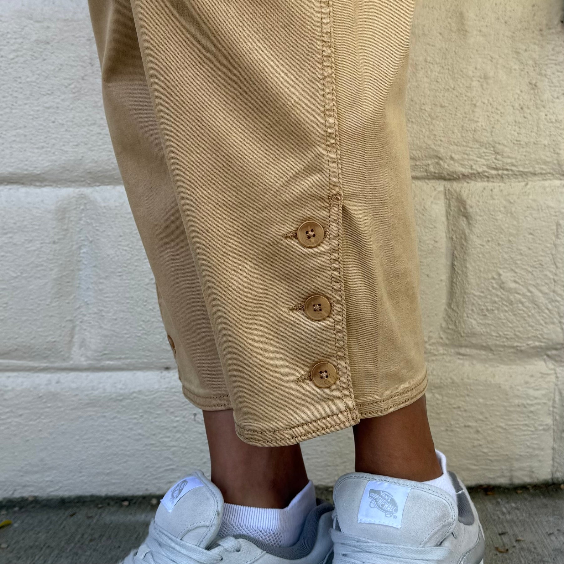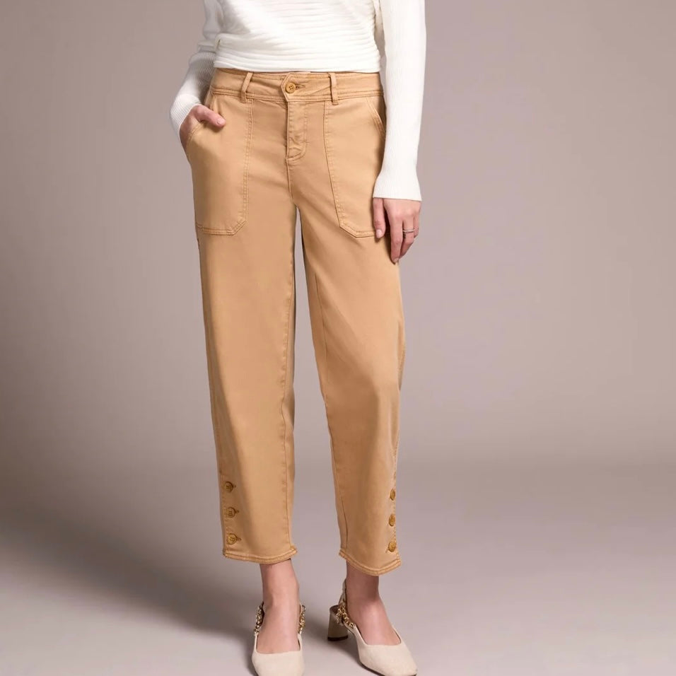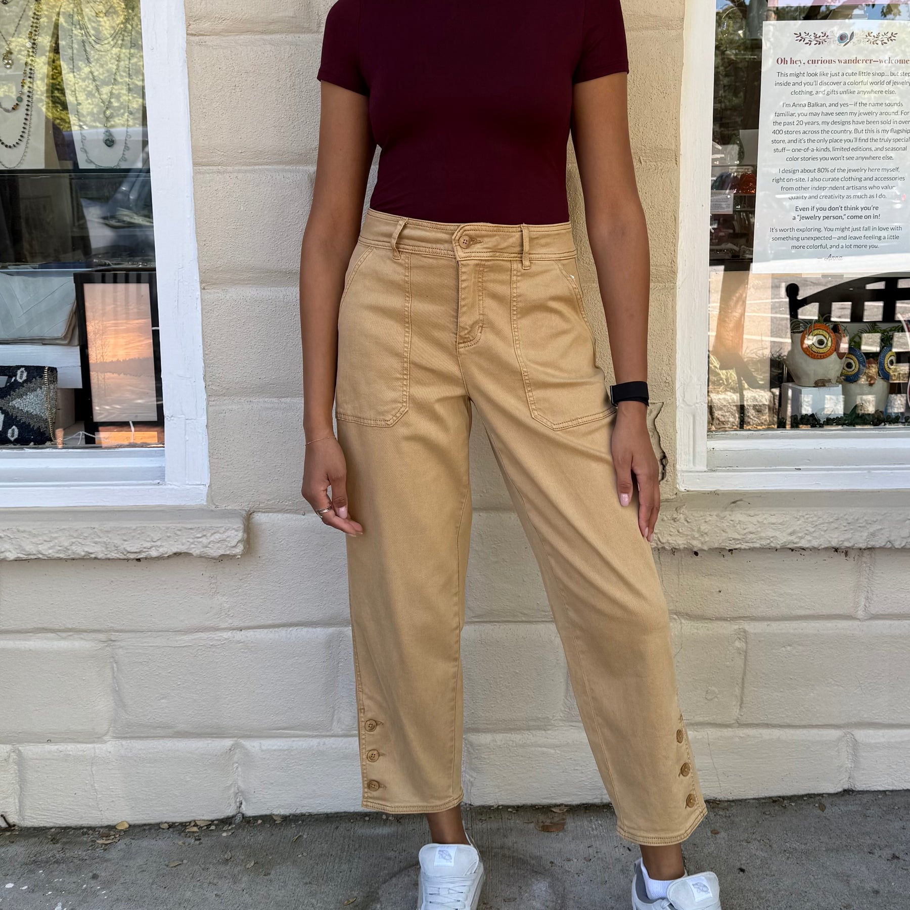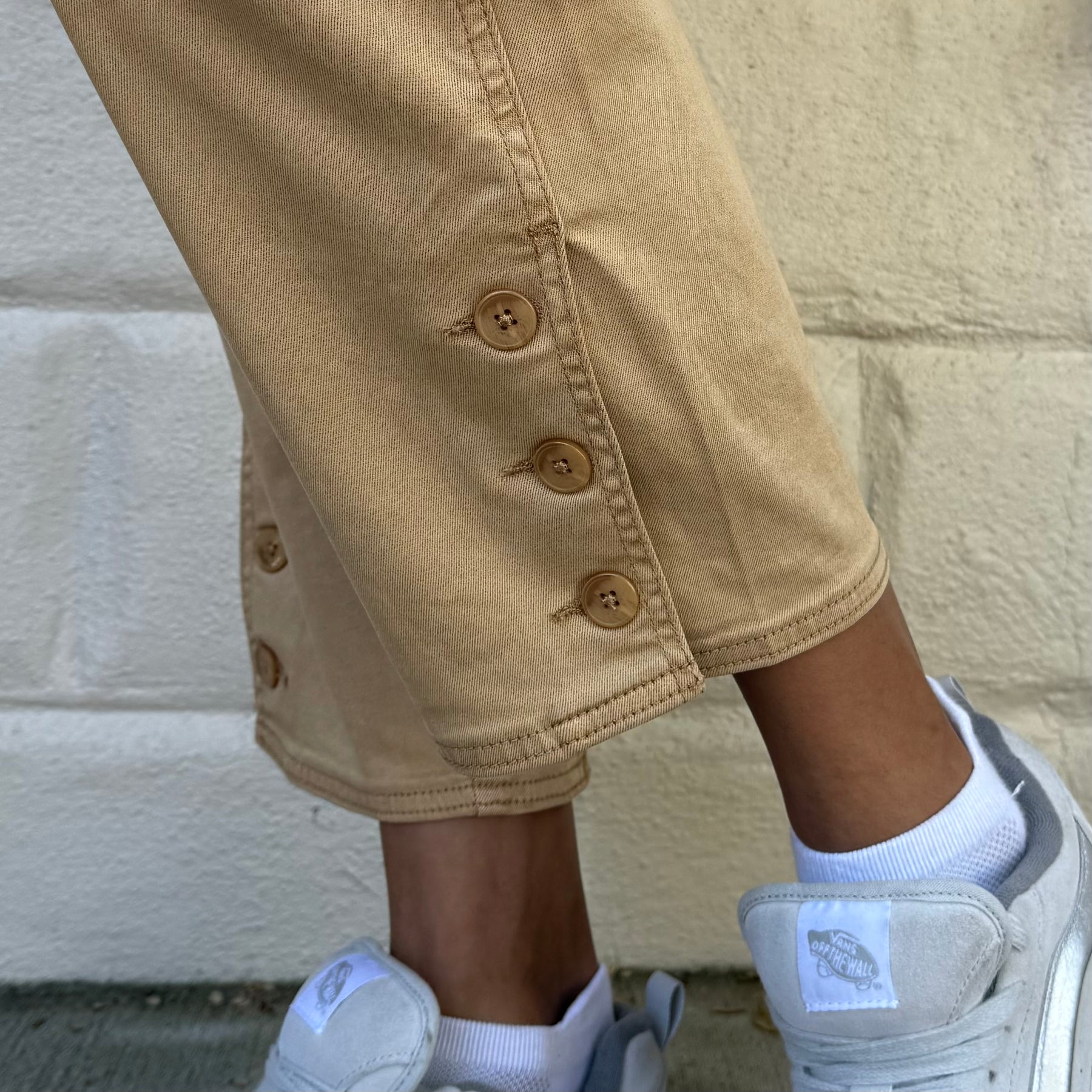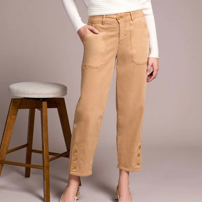 Embrace casual chic in these relaxed ankle pants, crafted from soft, stretchy twill fabric for ultimate comfort. The ankle-length cut keeps them cool for warmer days, while a hem vent with button detail adds a touch of sophistication. Functional front porkchop pockets and a back patch pocket provide convenient storage without sacrificing style.