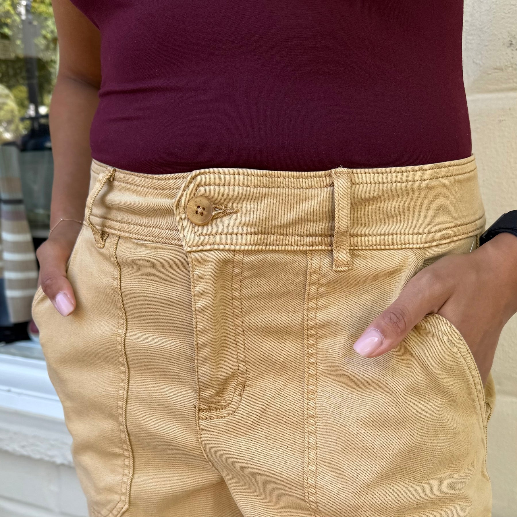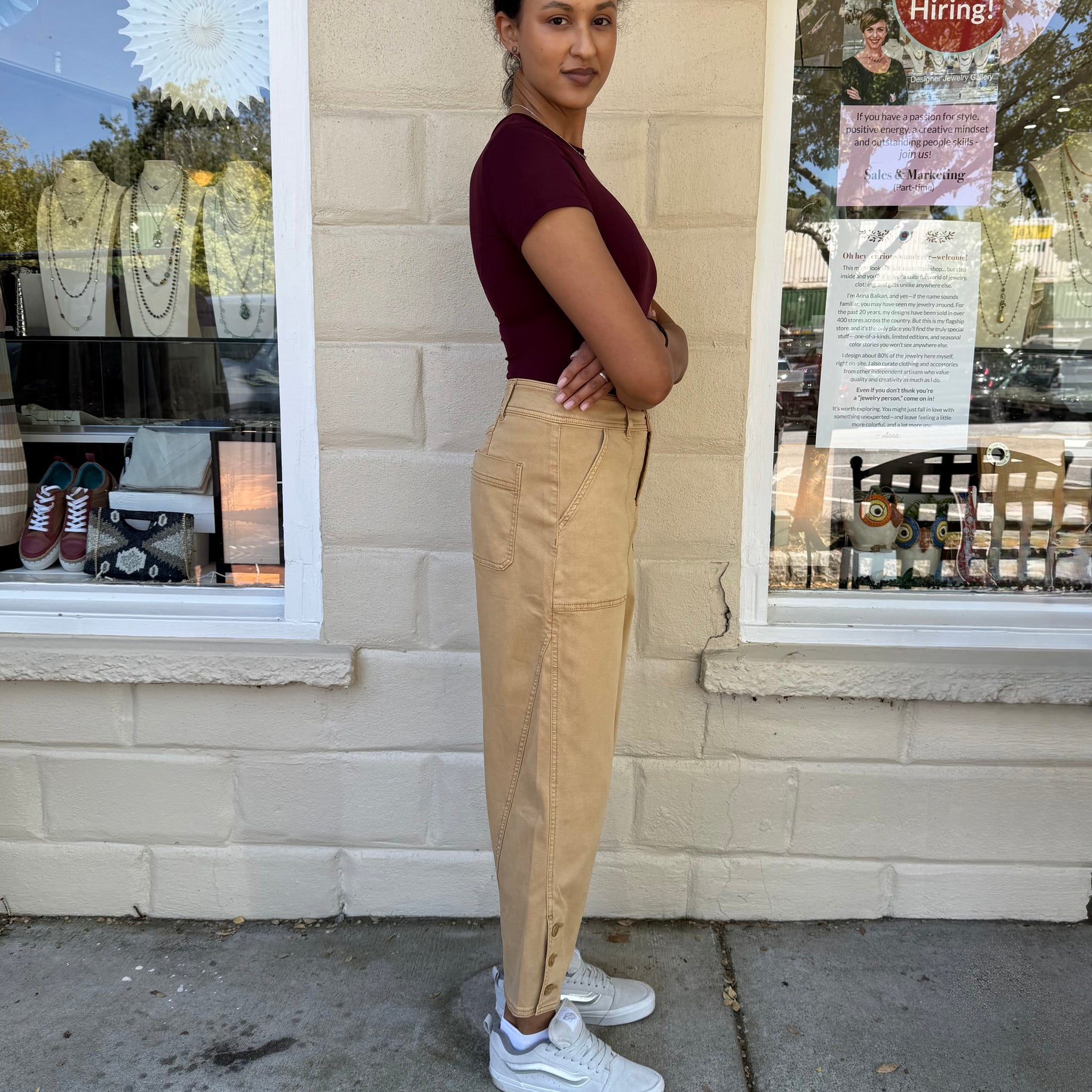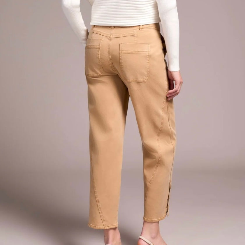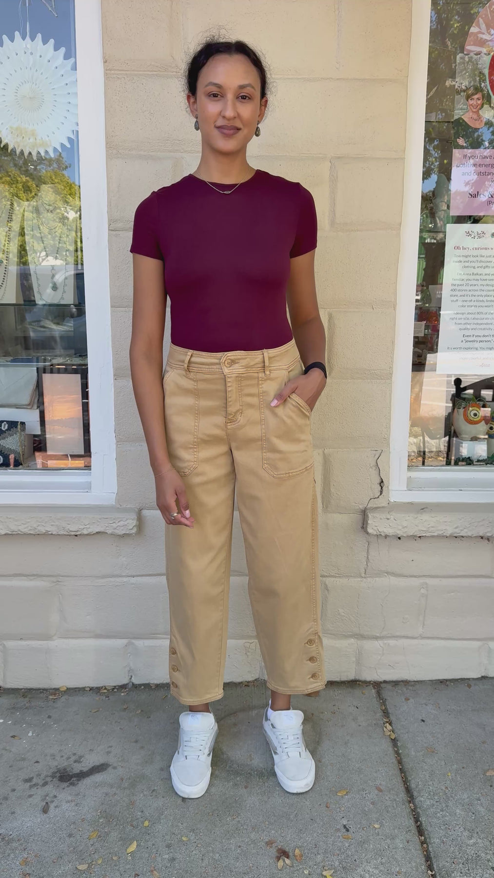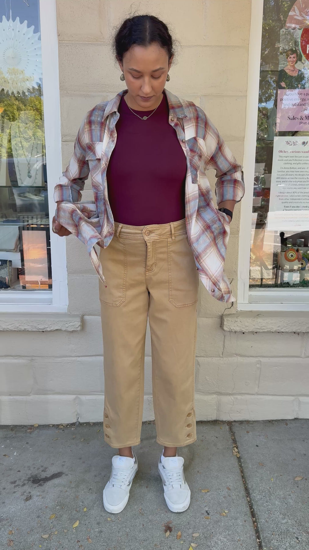 Embrace casual chic in these relaxed ankle pants, crafted from soft, stretchy twill fabric for ultimate comfort. The ankle-length cut keeps them cool for warmer days, while a hem vent with button detail adds a touch of sophistication. Functional front porkchop pockets and a back patch pocket provide convenient storage without sacrificing style.