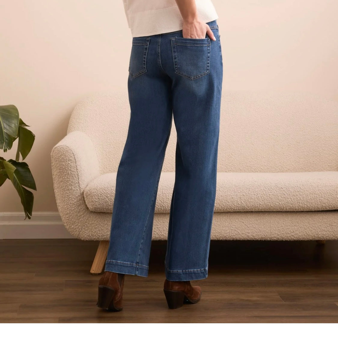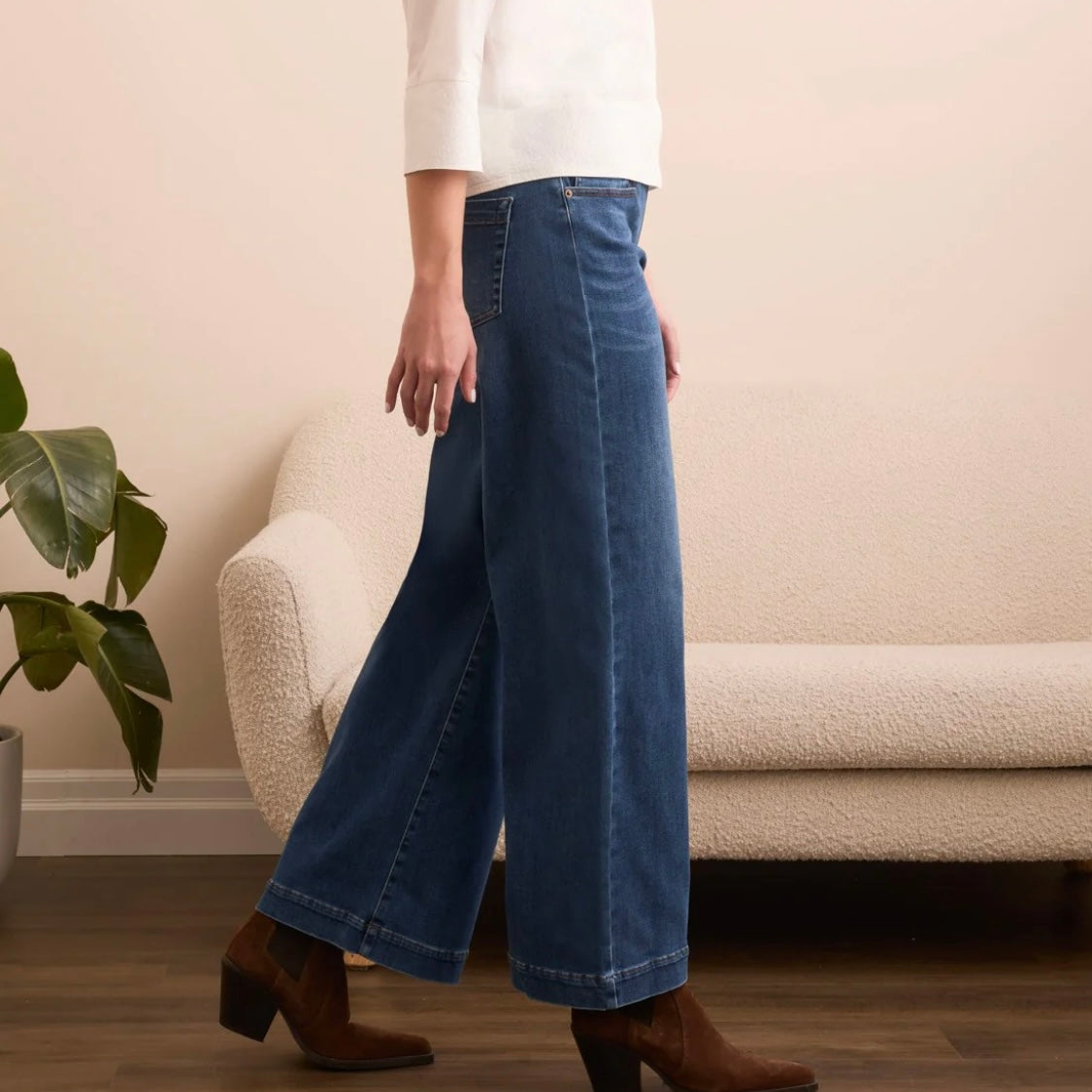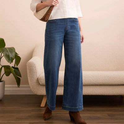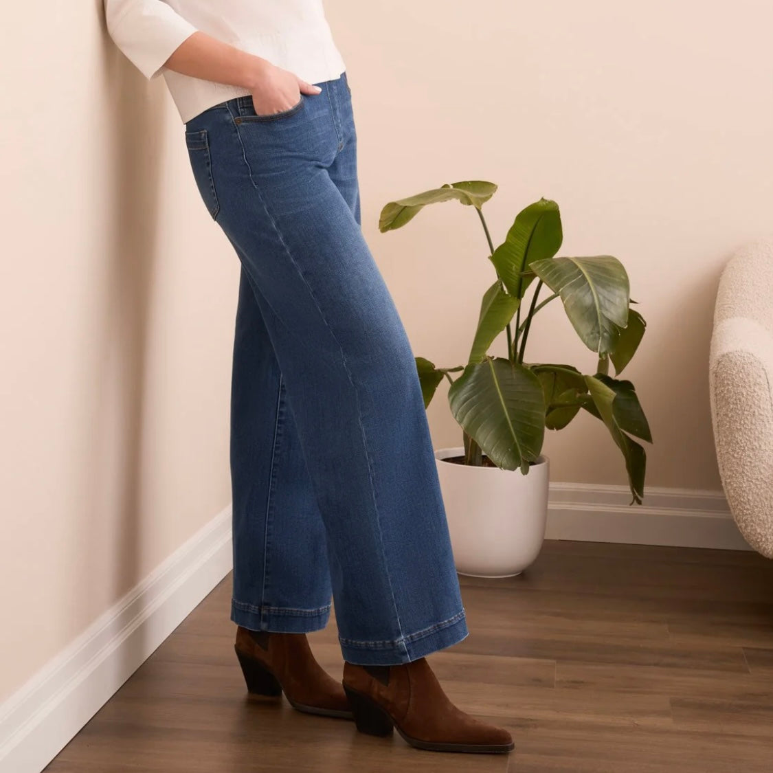 Elevate your casual style with these jeans, featuring a relaxed wide-leg fit and a flattering mid-rise cut. Crafted from premium stretch denim, they offer ultimate comfort and shape retention, keeping you chic all day. The pull-on waist makes for easy wear, while the inner elastic ensures a smooth, customized fit that complements your silhouette.
