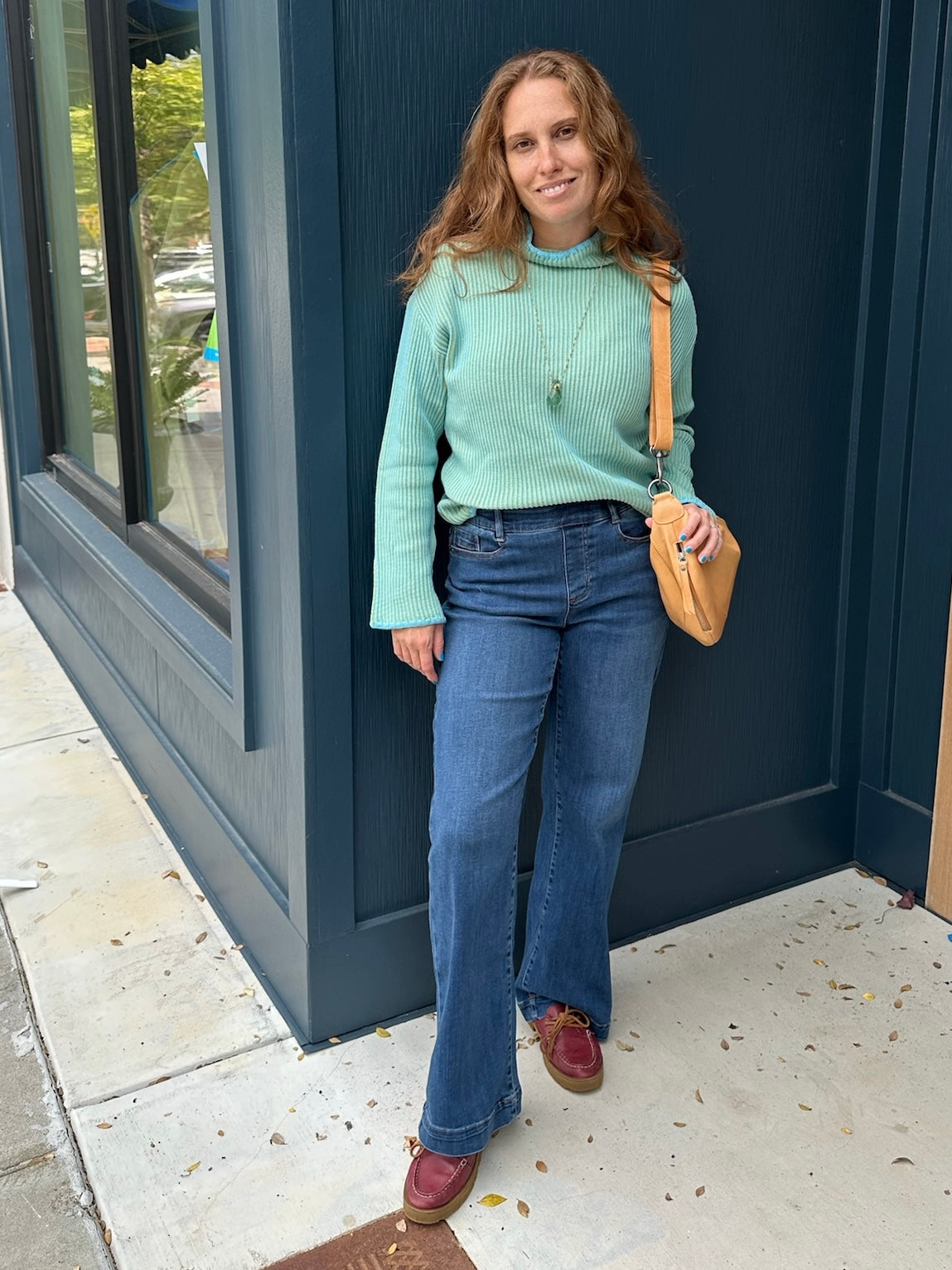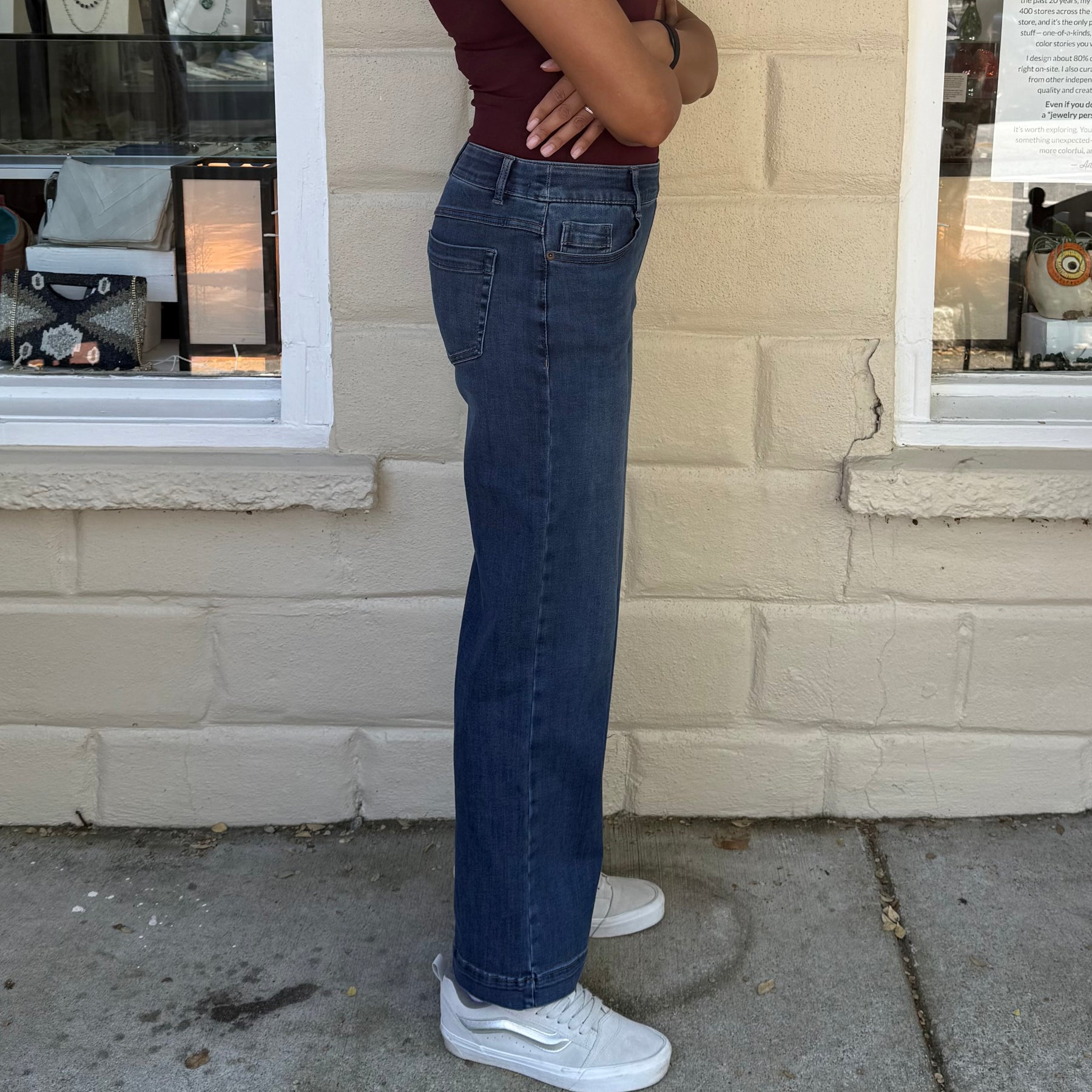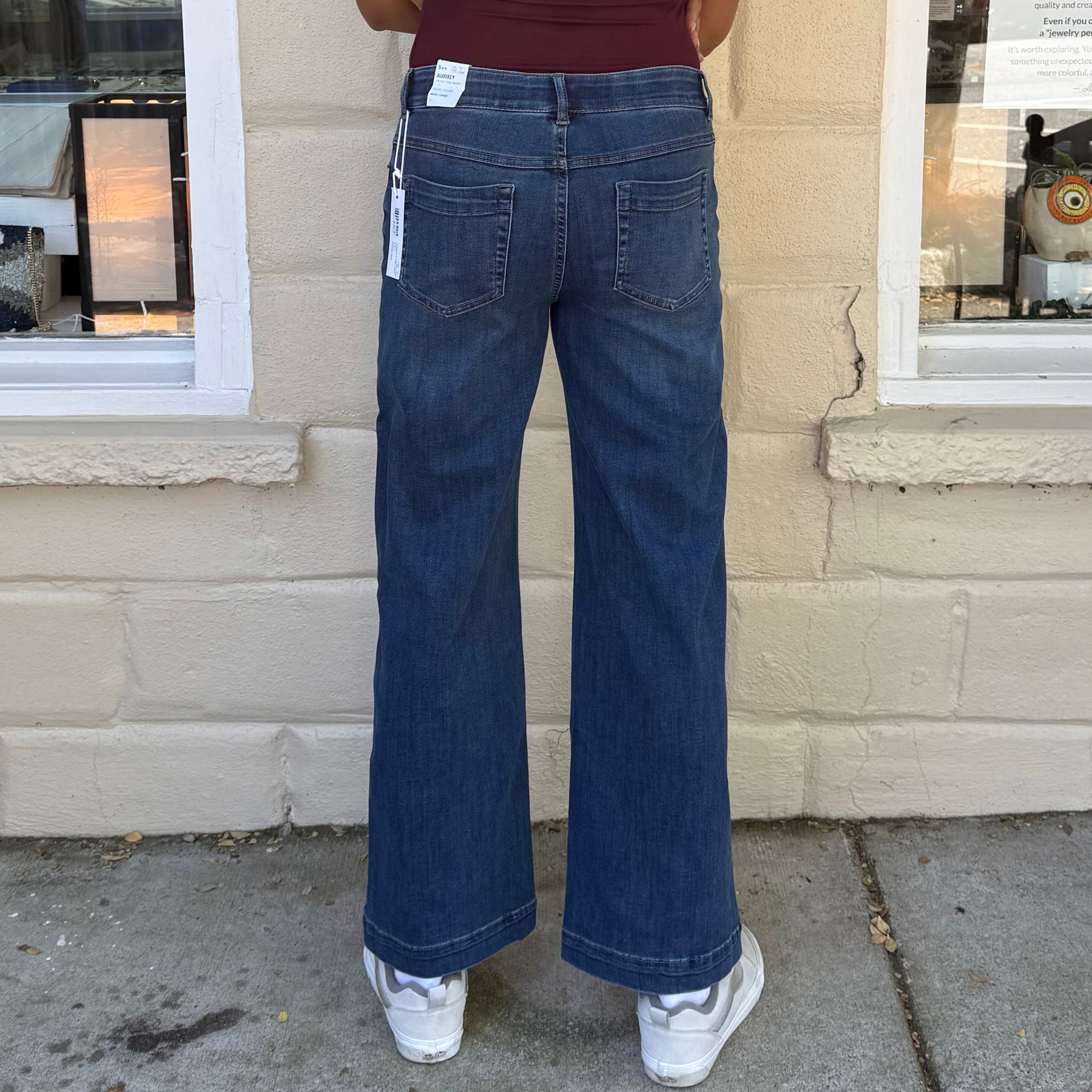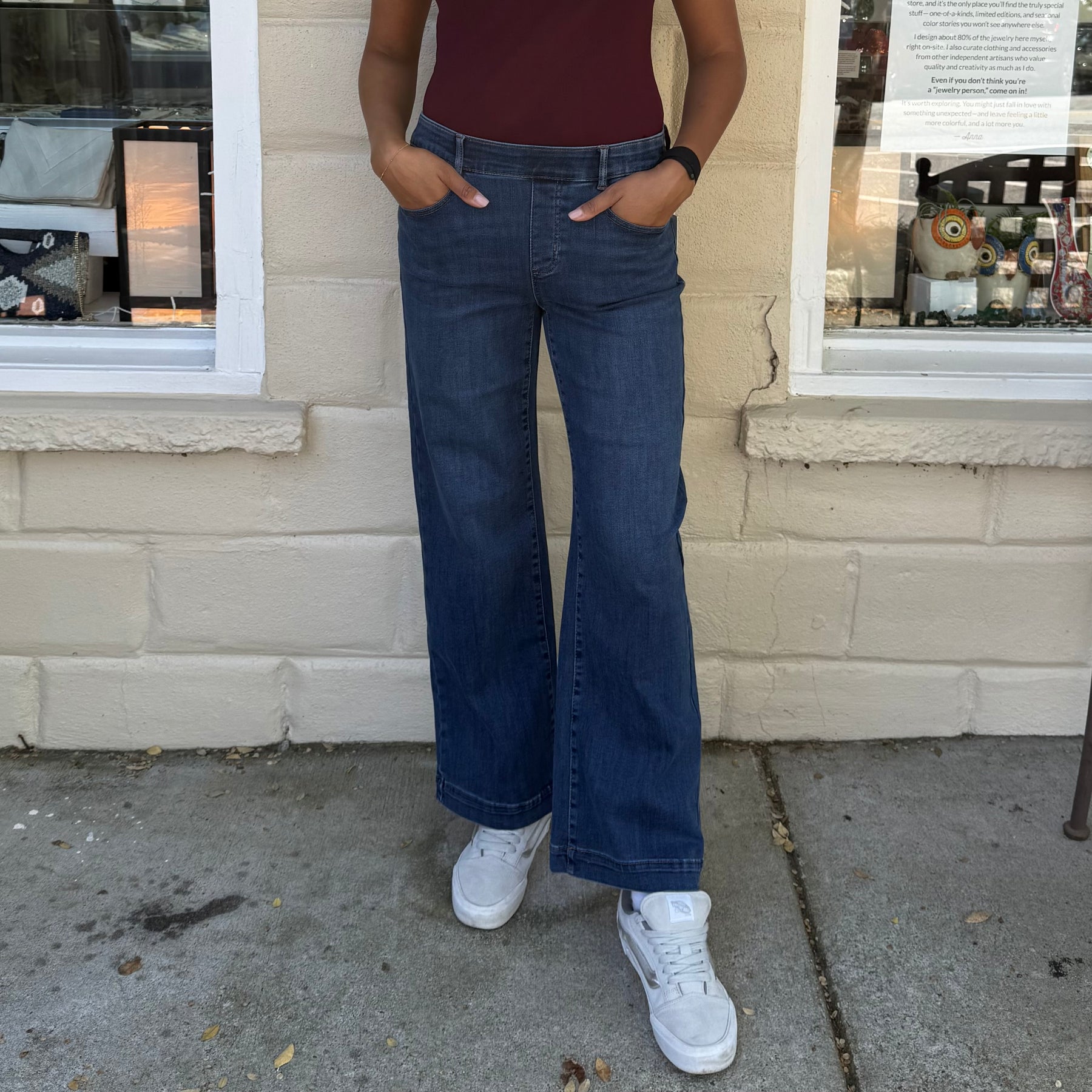 Elevate your casual style with these jeans, featuring a relaxed wide-leg fit and a flattering mid-rise cut. Crafted from premium stretch denim, they offer ultimate comfort and shape retention, keeping you chic all day. The pull-on waist makes for easy wear, while the inner elastic ensures a smooth, customized fit that complements your silhouette.