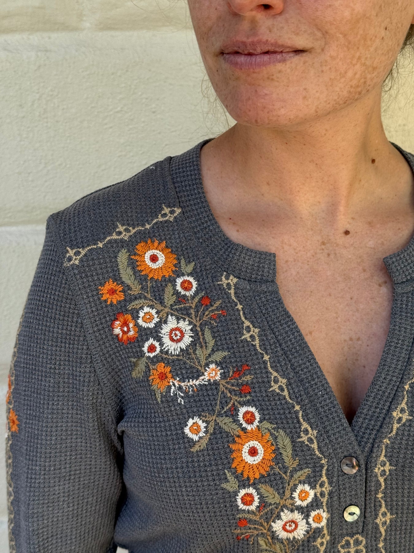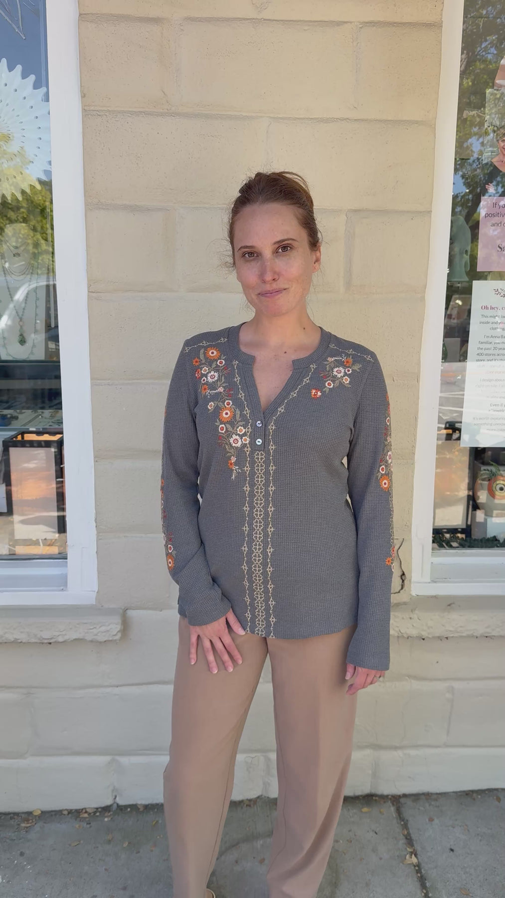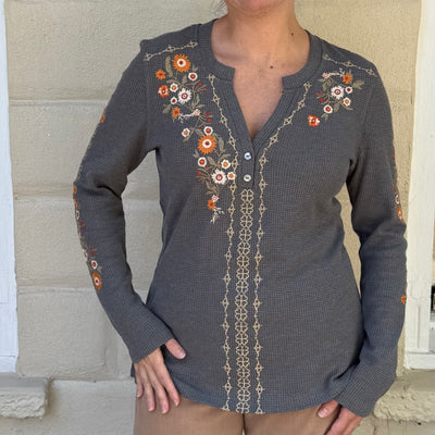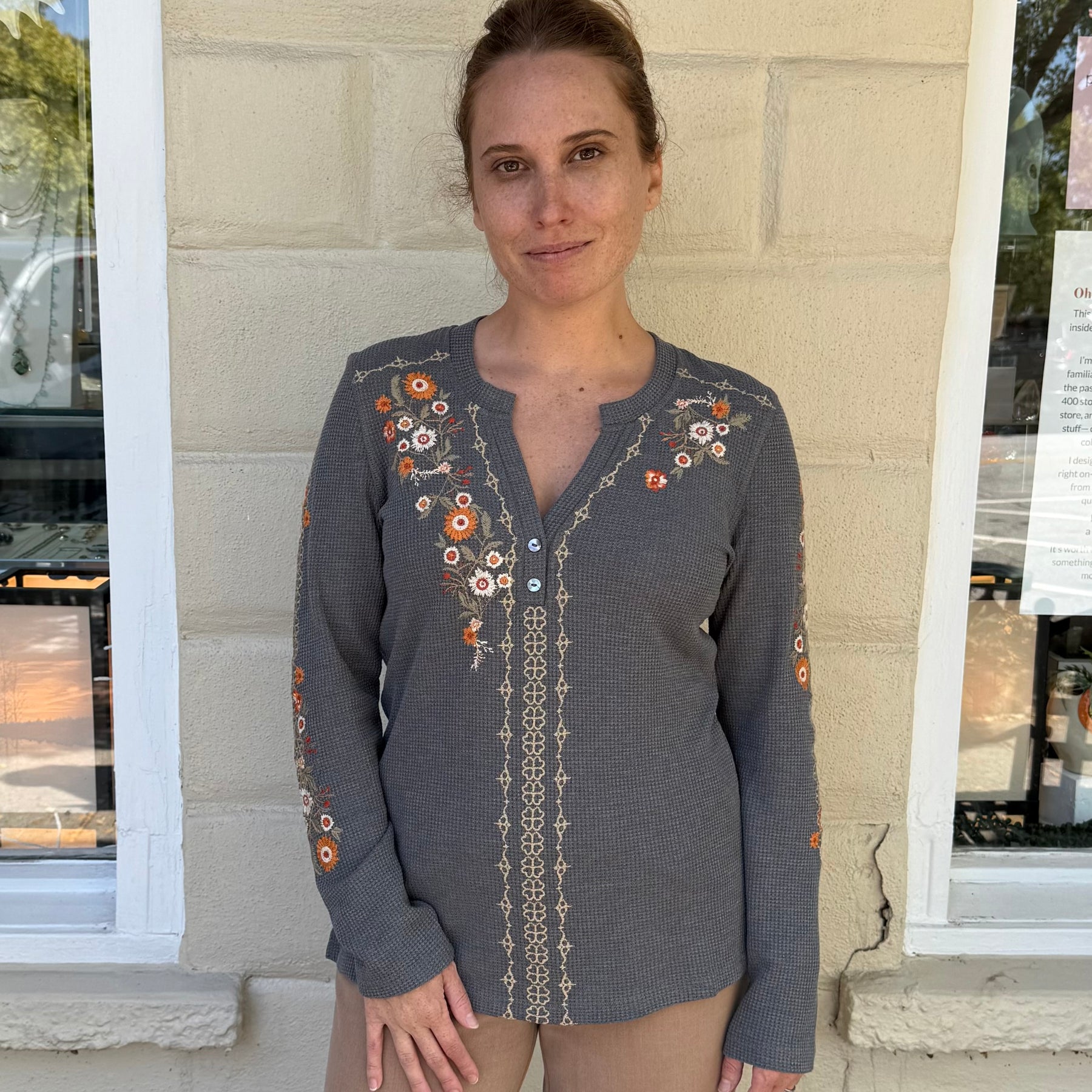 Bring a touch of bohemian romance into your wardrobe with the Paparazzi Thermal Embroidered Knit Shirt. Crafted in a soft thermal knit blend, this top is designed with a round neckline, partial henley button front, and long sleeves for effortless layering. Intricate floral embroidery graces the back and sleeves, while slit sides add comfort and movement.