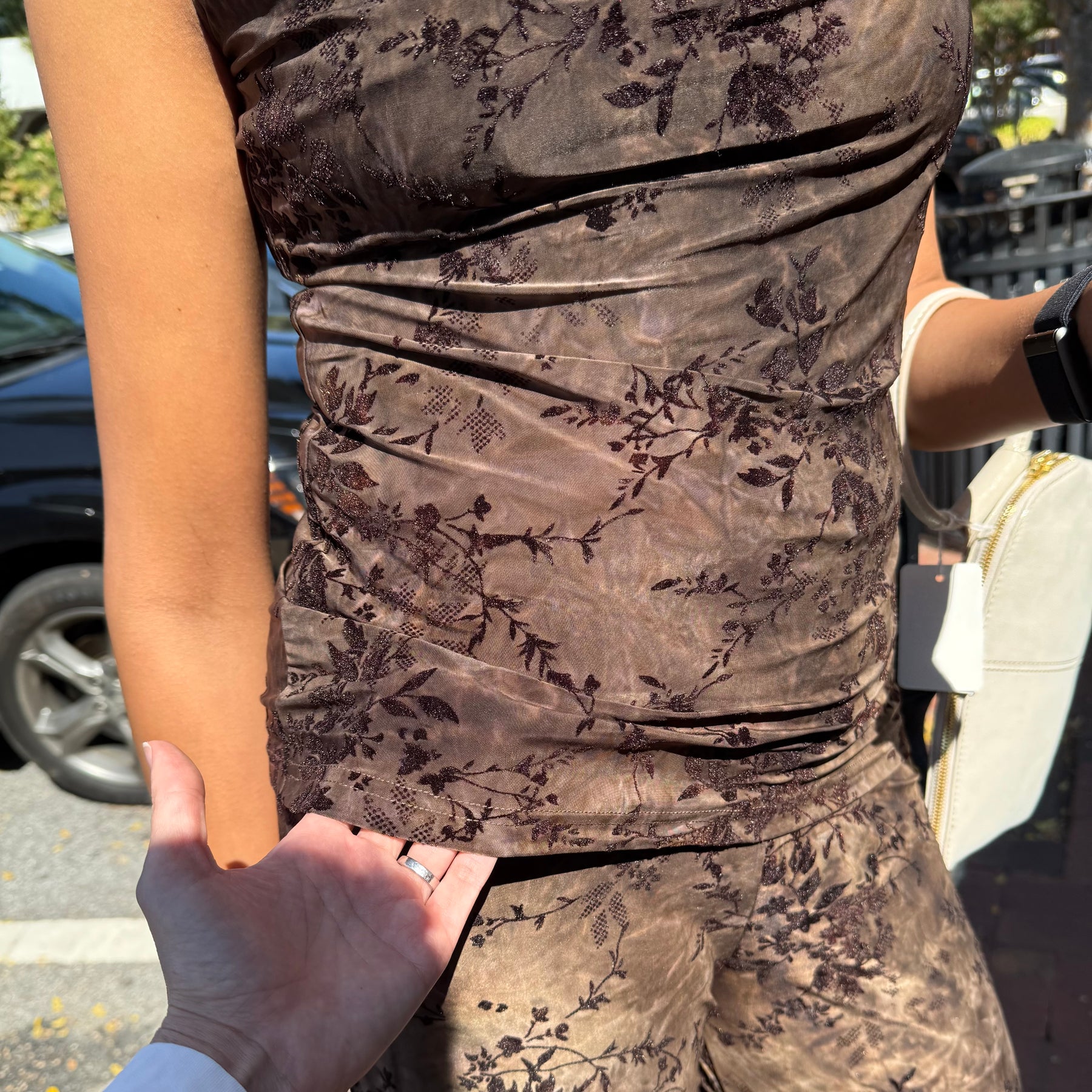 A chic essential for every wardrobe, this Lettuce Hem Mesh Print Top is designed with a flattering V-neckline and ruched front, back, and sides for an easy fit. The delicate lettuce hem adds a feminine touch, while the lightweight mesh makes it a great layering piece under jackets, cardigans, or even slip dresses.
