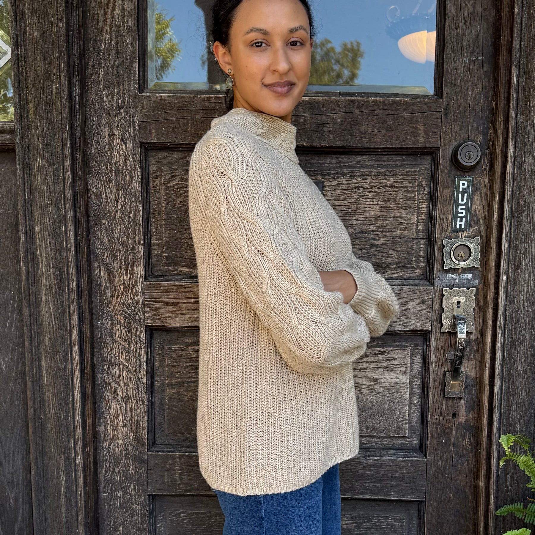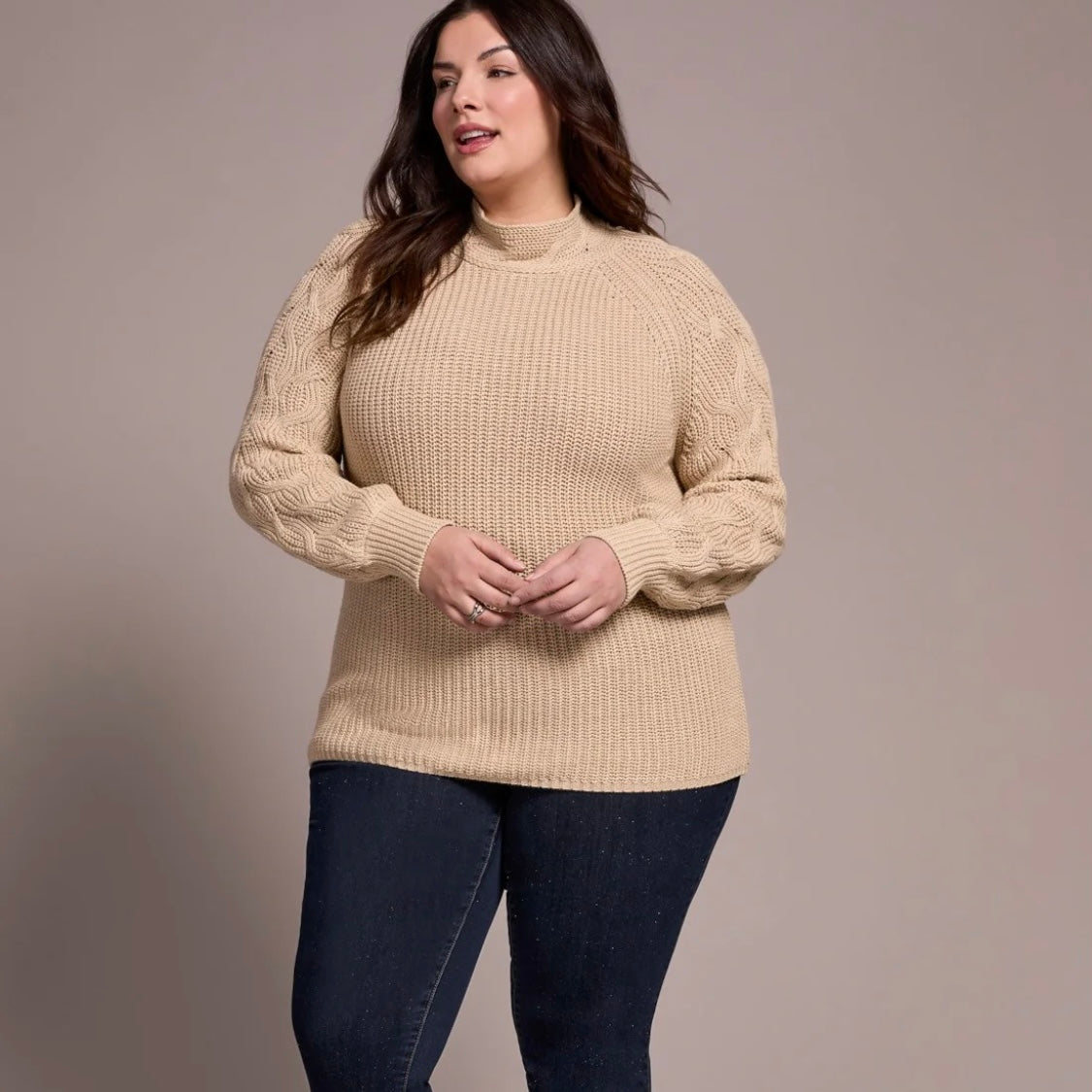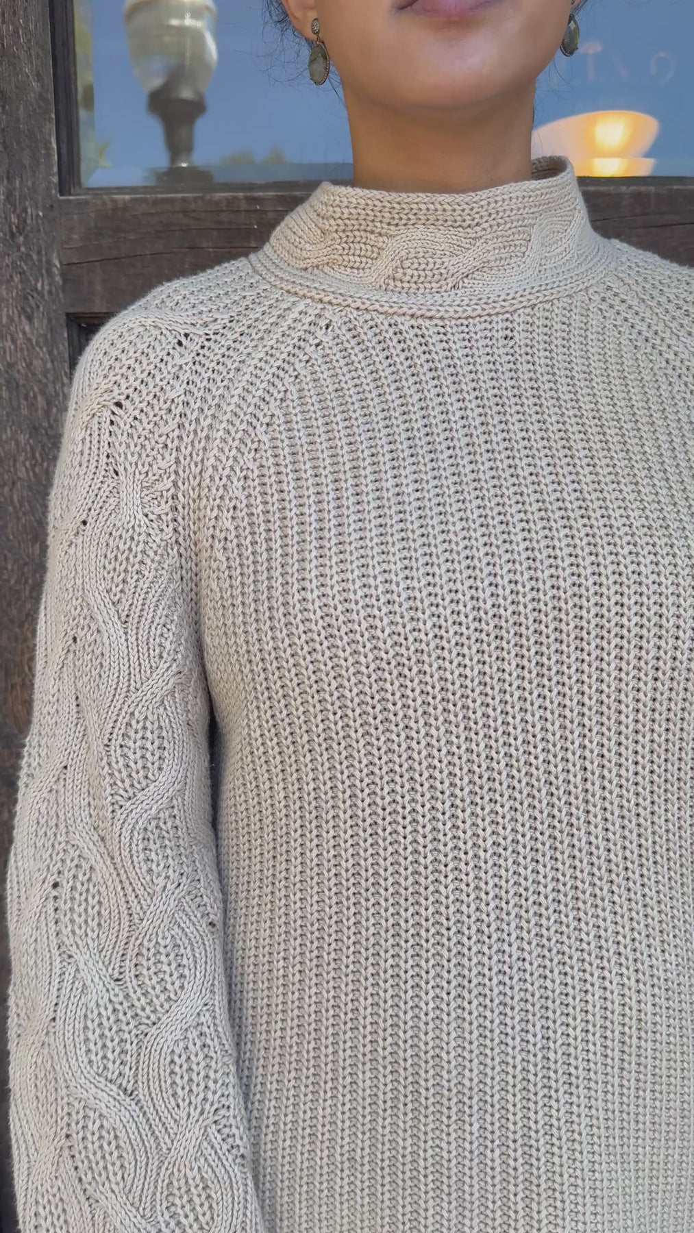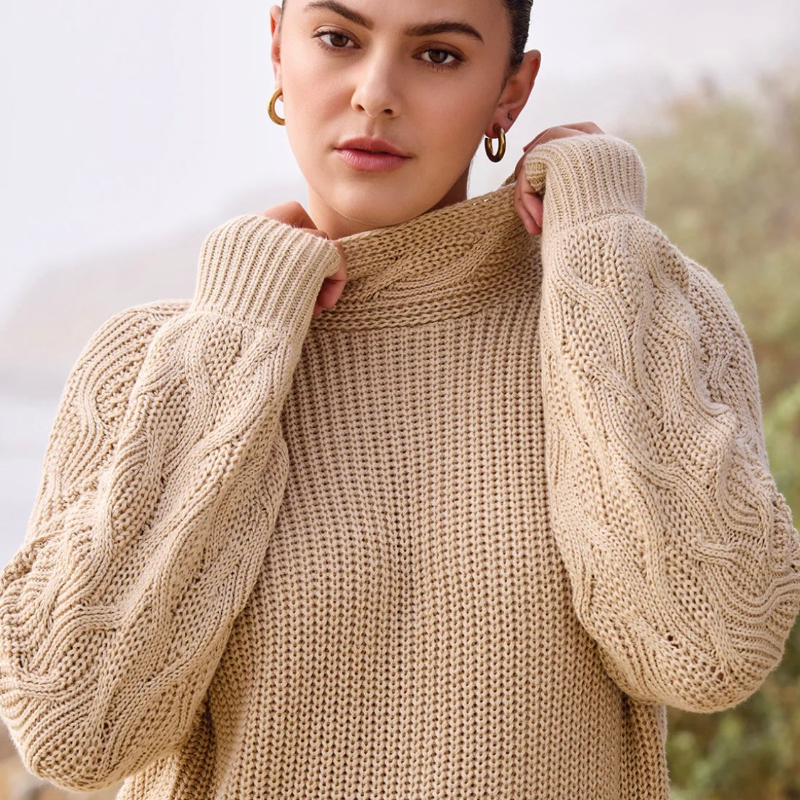 Mock neck Long sleeves Fitted cuffs Cable knit Combed cotton