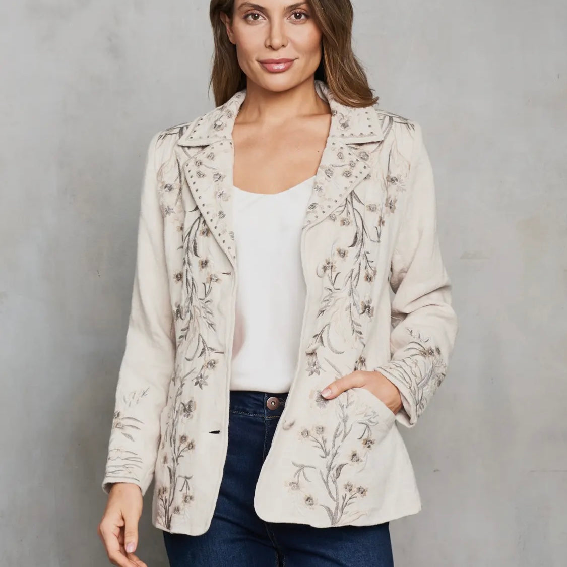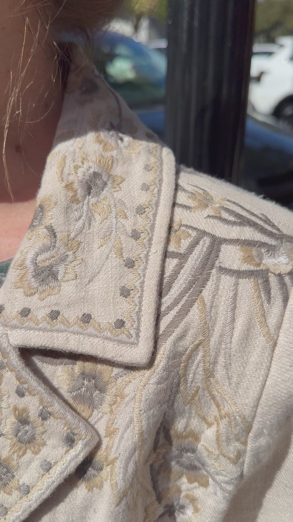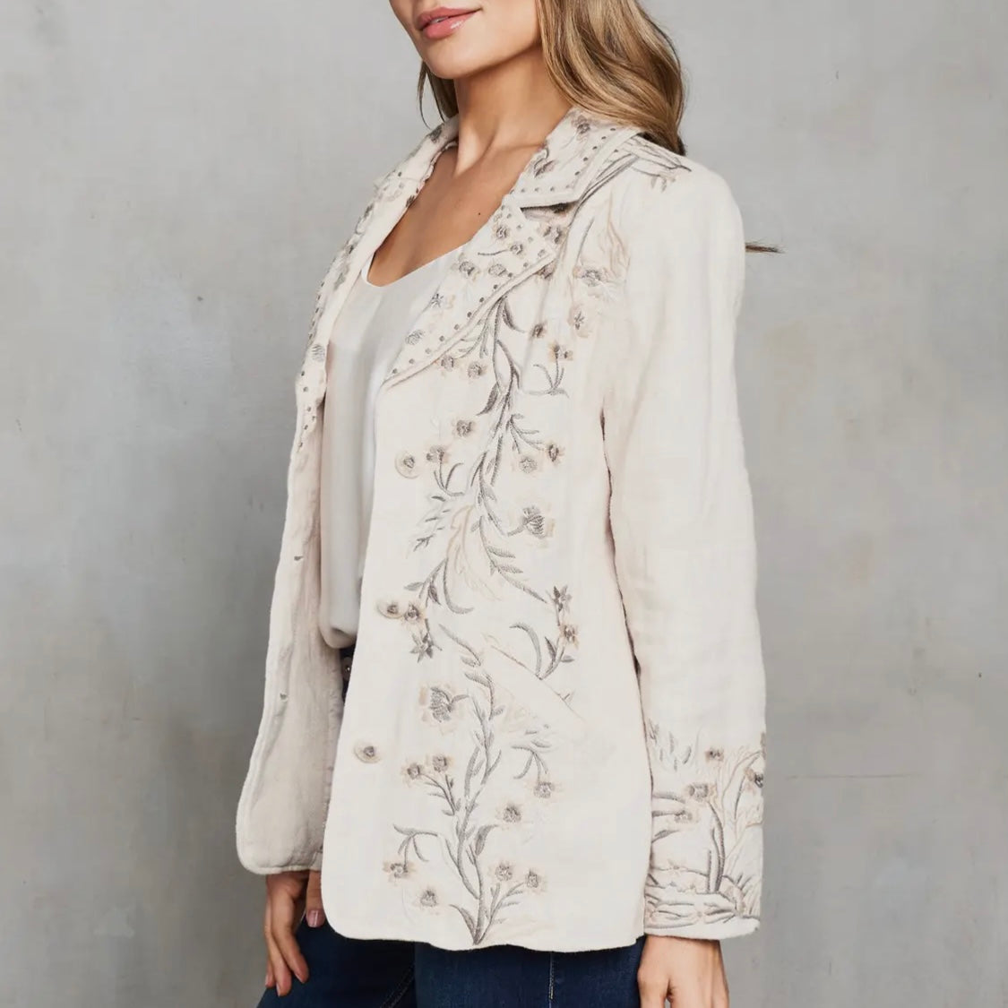 The tailored silhouette brings polish, while the whimsical embroidery adds a touch of artistry—making it perfect for everything from a career look to a boho-chic evening out. Pair it with trousers for the office or denim for a romantic, relaxed vibe.