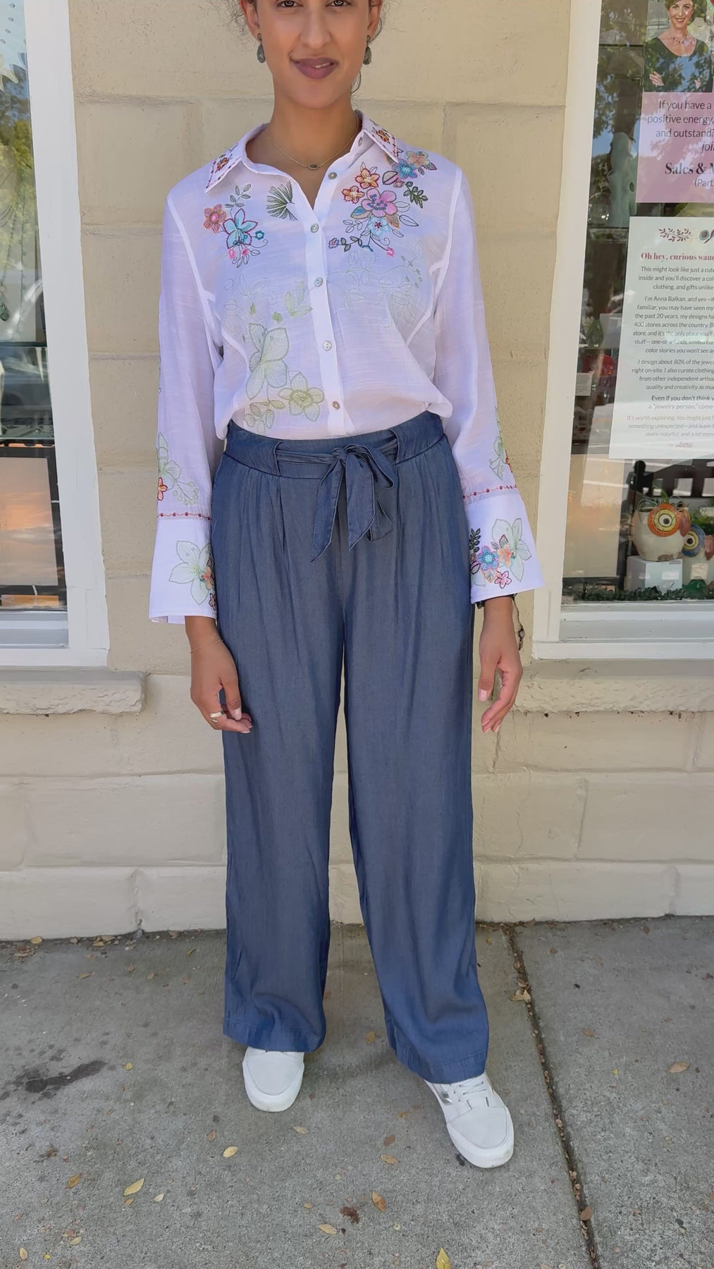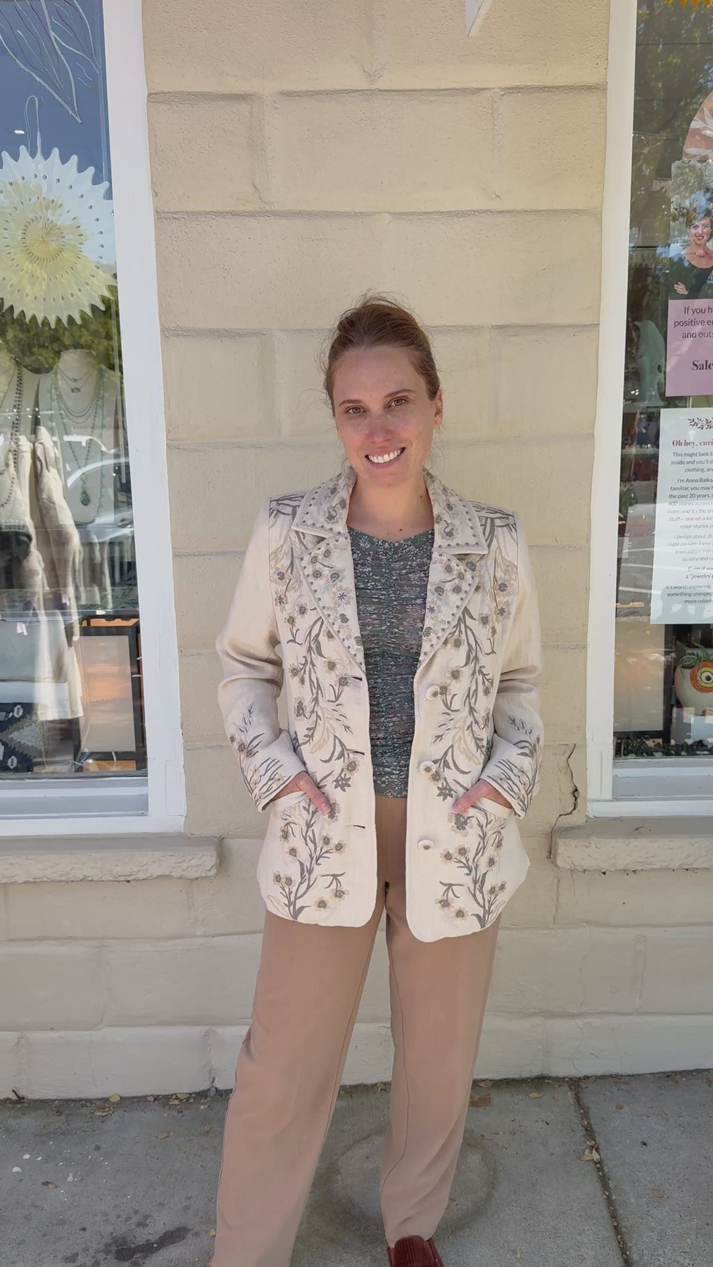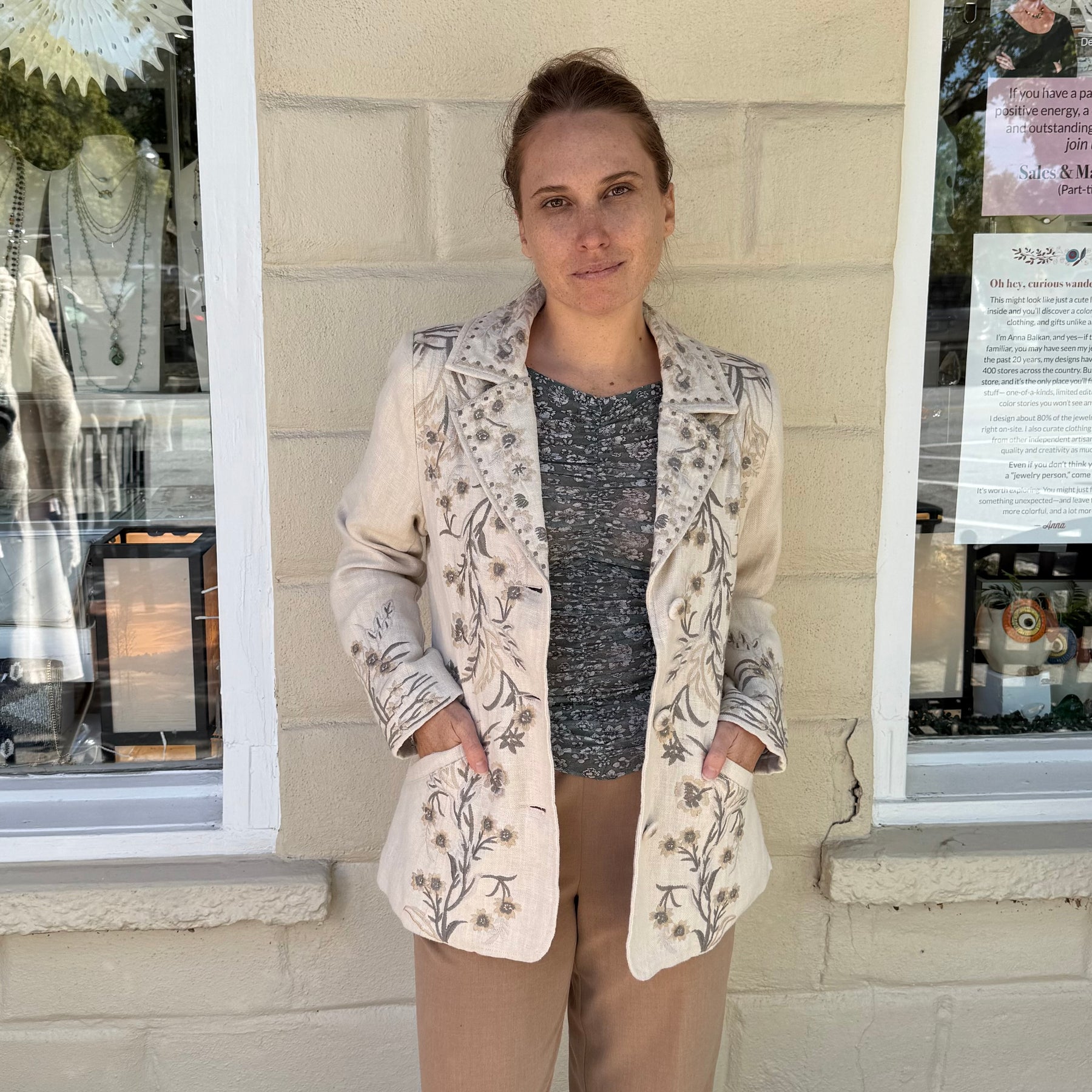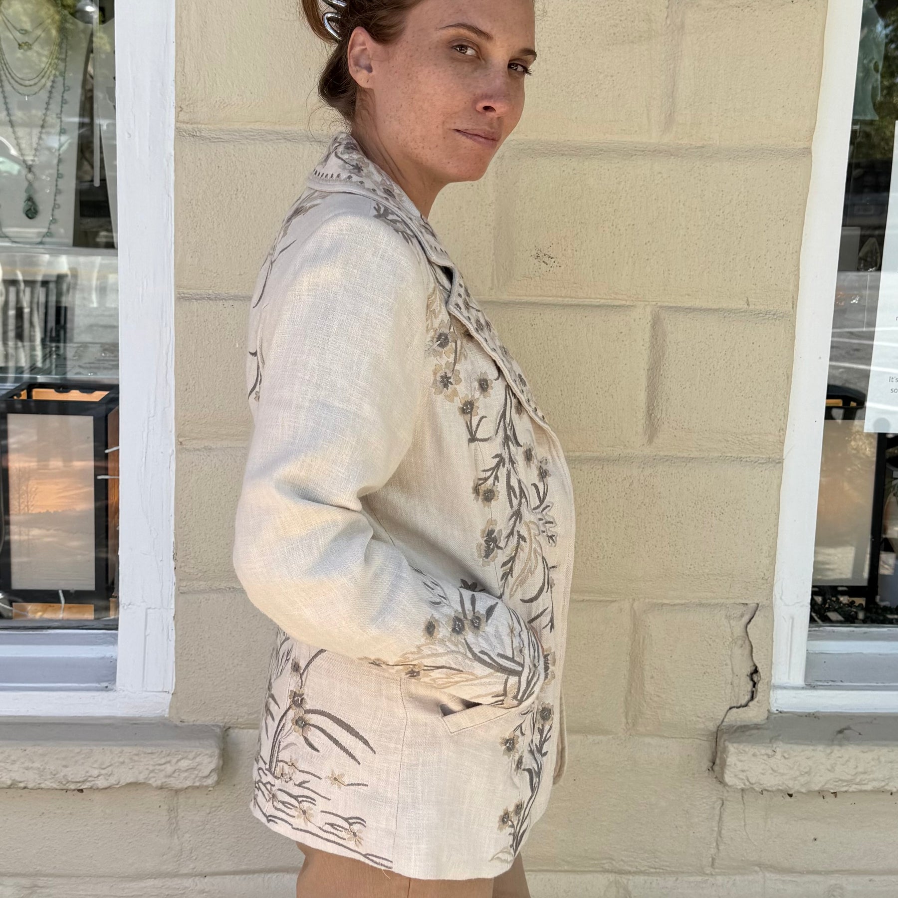 The tailored silhouette brings polish, while the whimsical embroidery adds a touch of artistry—making it perfect for everything from a career look to a boho-chic evening out. Pair it with trousers for the office or denim for a romantic, relaxed vibe.