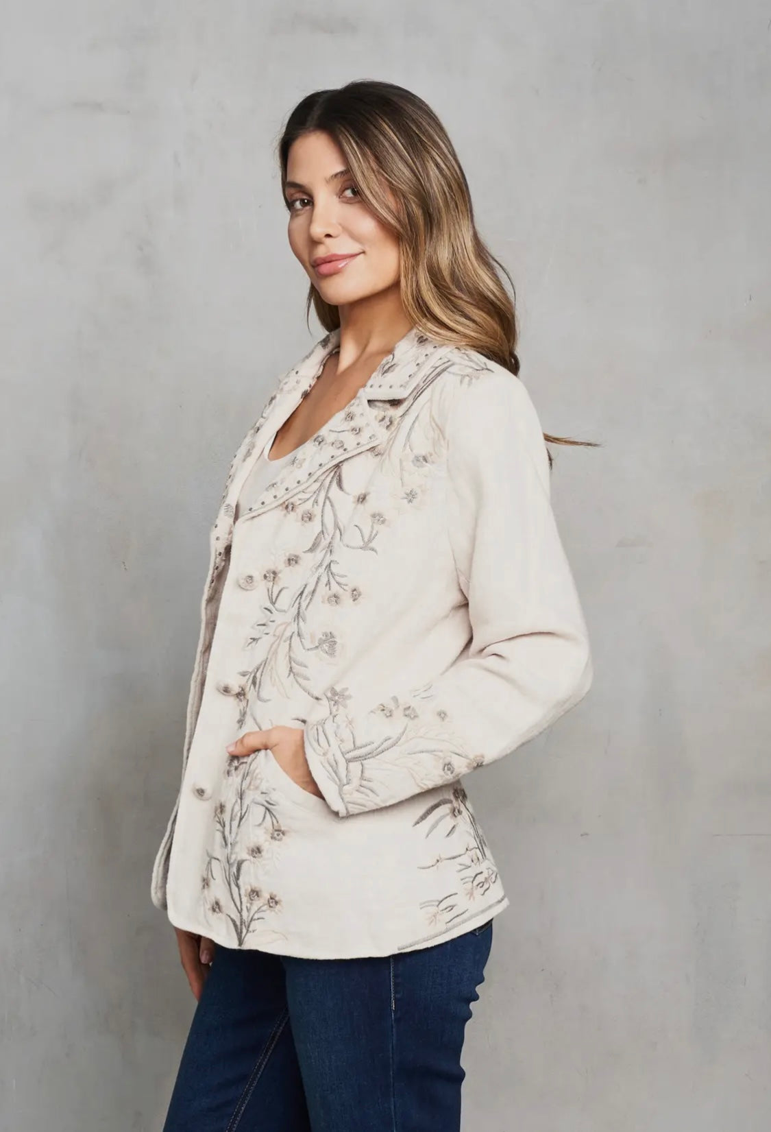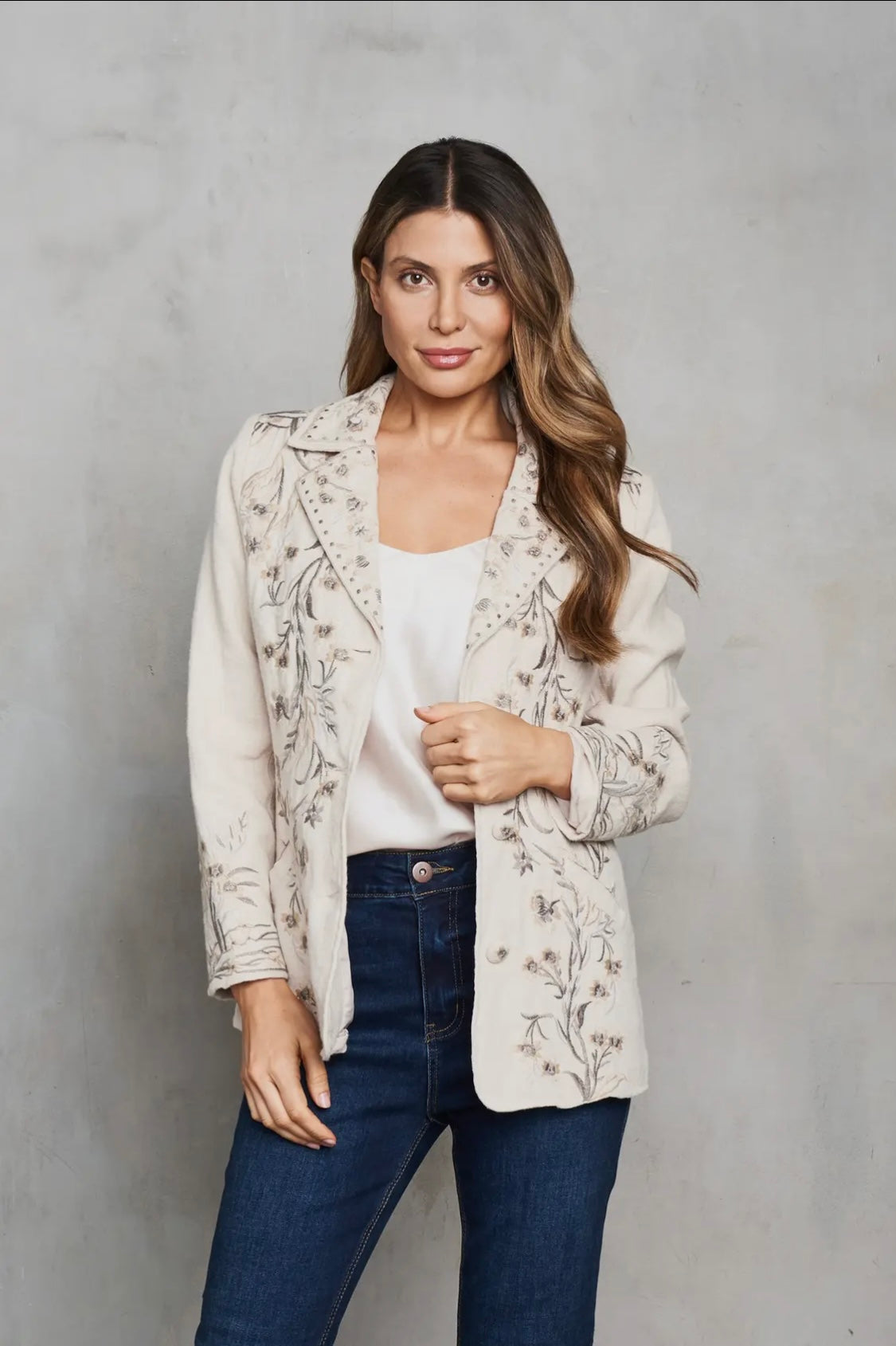 This embroidered herringbone blazer by Paparazzi is where timeless tailoring meets romantic detail. Crafted in a beautifully neutral herringbone weave, this single-breasted blazer features a classic notch collar, delicate floral embroidery with soft hints of blue and gold on the front and back, and motif embroidery along the sleeves. Convenient pockets make it as practical as it is elegant.