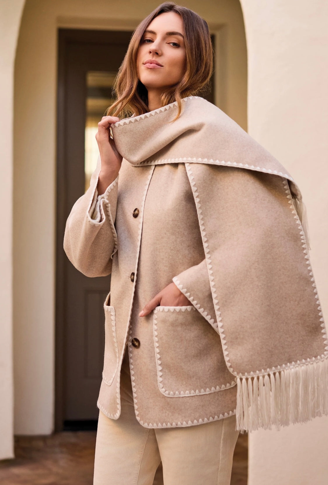 Gravitate toward this versatile knit coat designed for transitional seasons. Lightweight yet cozy, it blends comfort and style for everyday wear. The detachable scarf gracefully accents the neckline, while shell stitching adds sophisticated detail to the flowing silhouette. Long bell sleeves provide refined coverage, and oversized buttons complete the look with modern charm.