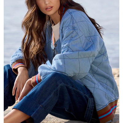 It’s like a cloud! Runs big. Reach for this cozy bomber when you need an oversized layer that combines warmth and style. The lightweight denim features a vintage wash for a timeless, well-loved look. Contrasting ribbed detailing at the neck, cuffs, and hem adds a bold touch, while side pockets combine style and functionality.