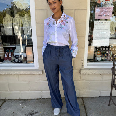 This cotton-blend embroidered button-down is the perfect mix of effortless and versatile. Available in a soft, flattering pink or crisp white with two embroidery styles, it’s designed to be worn as a classic shirt or styled open as a lightweight shrug or jacket. Very Johny Was style look