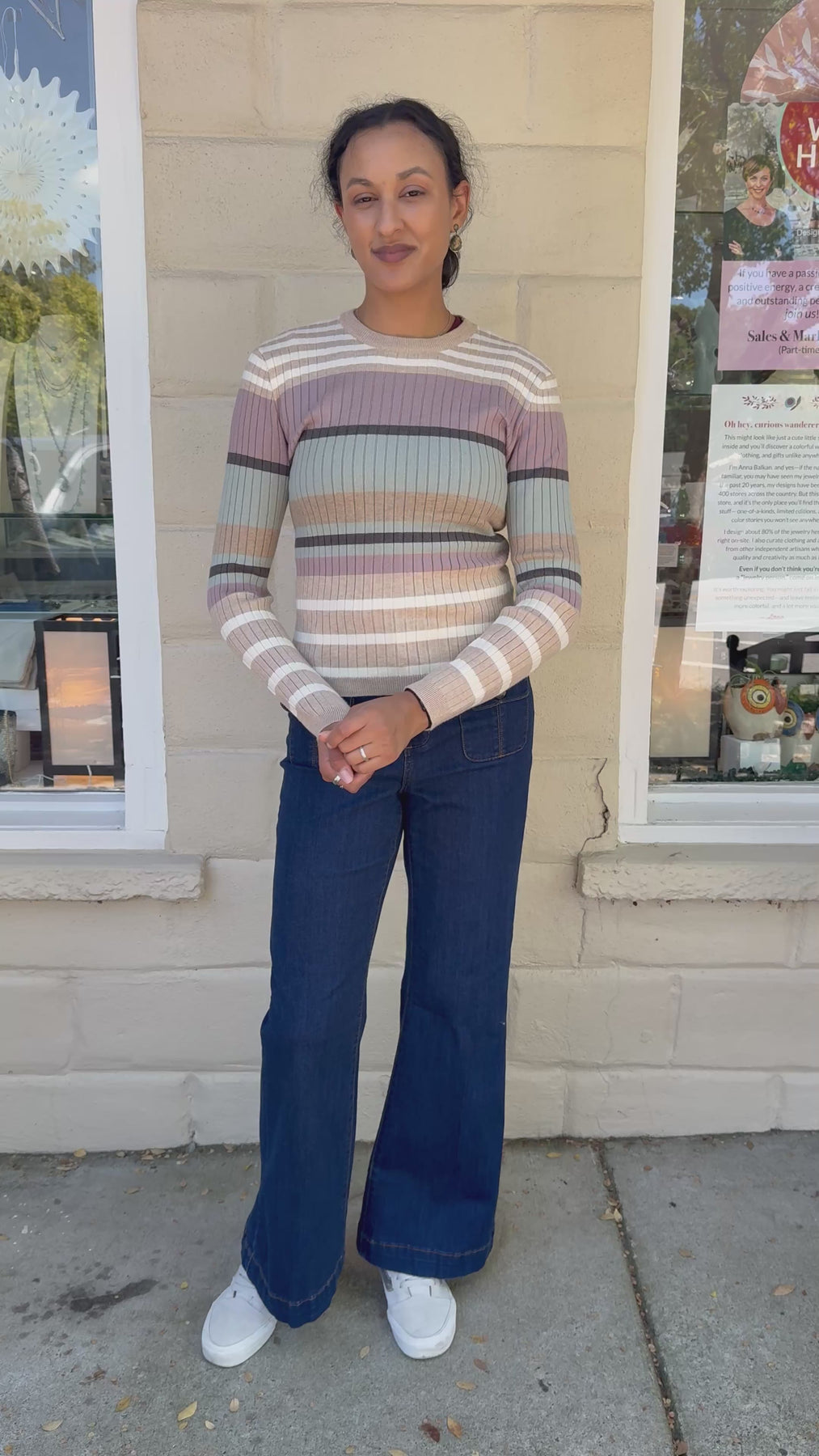 Stay cozy and chic in this boat neck sweater, featuring a playful color block pattern and graceful long bell sleeves. The boat neckline offers a refined, flattering touch, while the blend of lily and slub yarns provides a soft, warm feel perfect for the season.