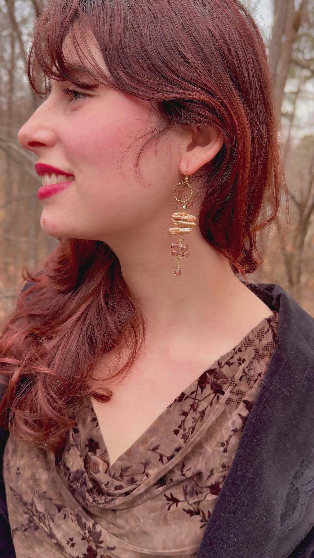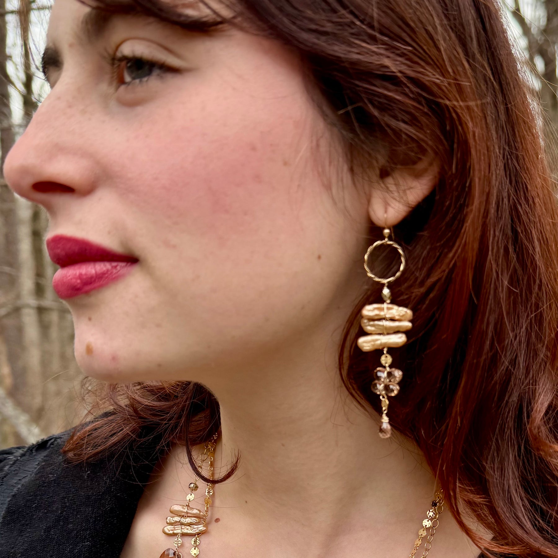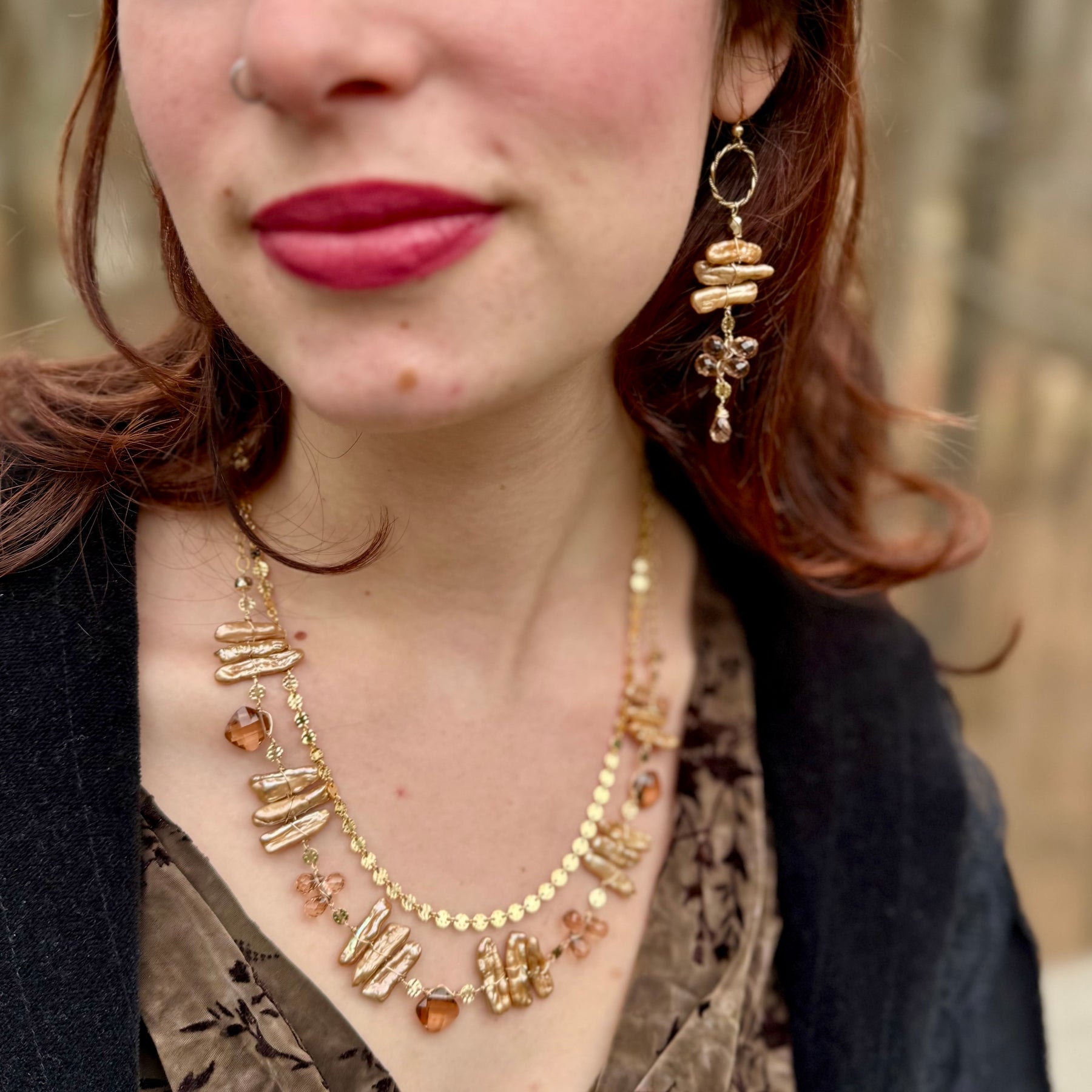 These handcrafted pearl and Tea Topaz earrings blend organic texture with refined sparkle. Elongated freshwater pearls bring natural beauty and glow, while faceted Tea Topaz adds warmth and light-catching brilliance. Designed in 14k gold filled for durability and everyday elegance, these earrings offer graceful length without feeling heavy. Perfect for special occasions or elevated daily wear, they pair beautifully with neutrals, soft metallics, and layered jewelry looks. One of a kind and sold separately from necklaces shown.