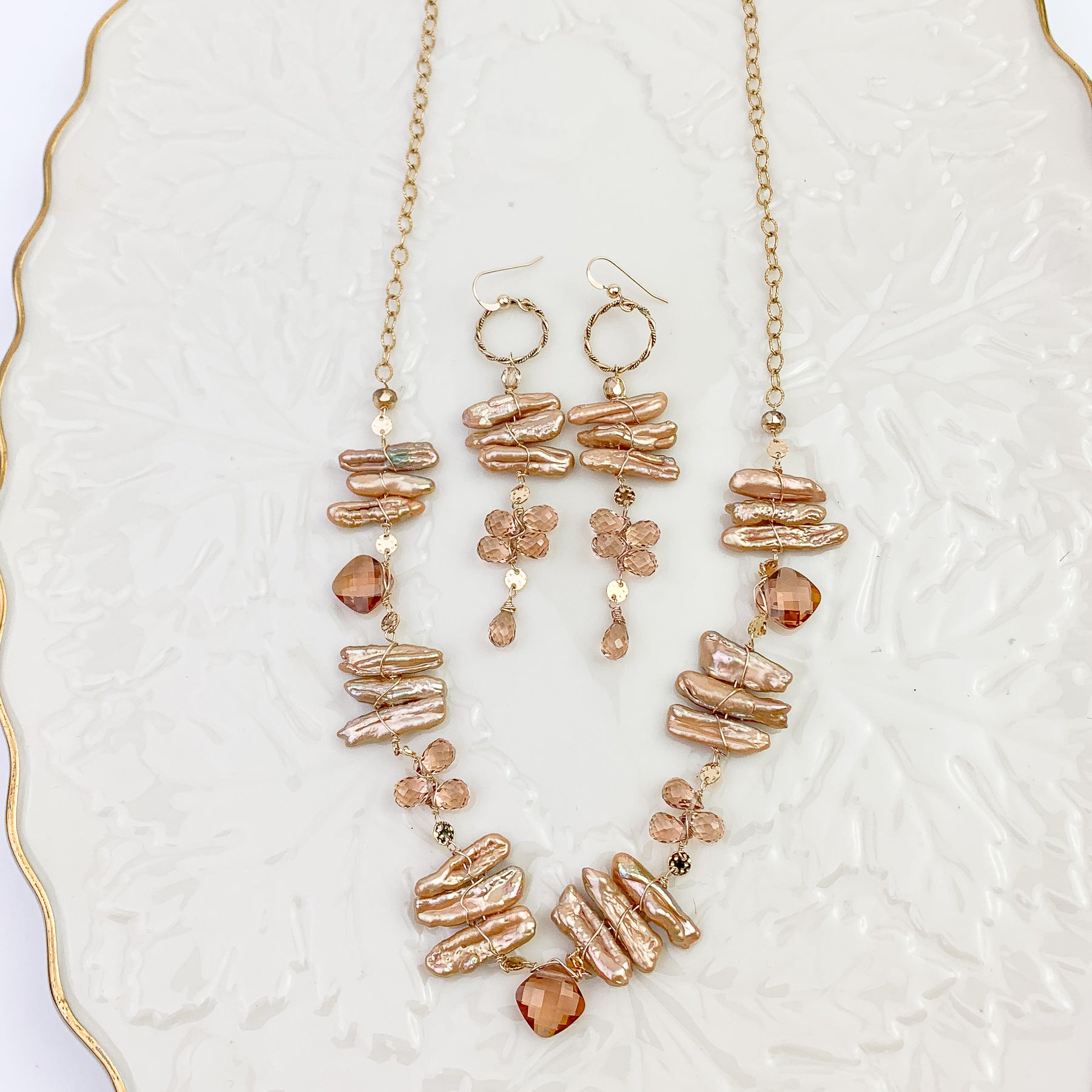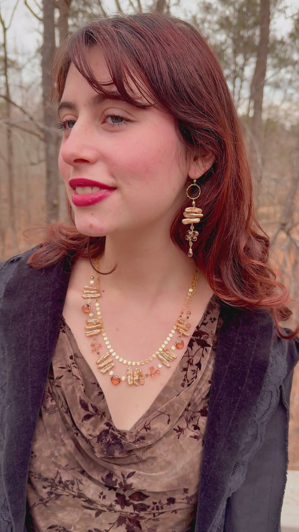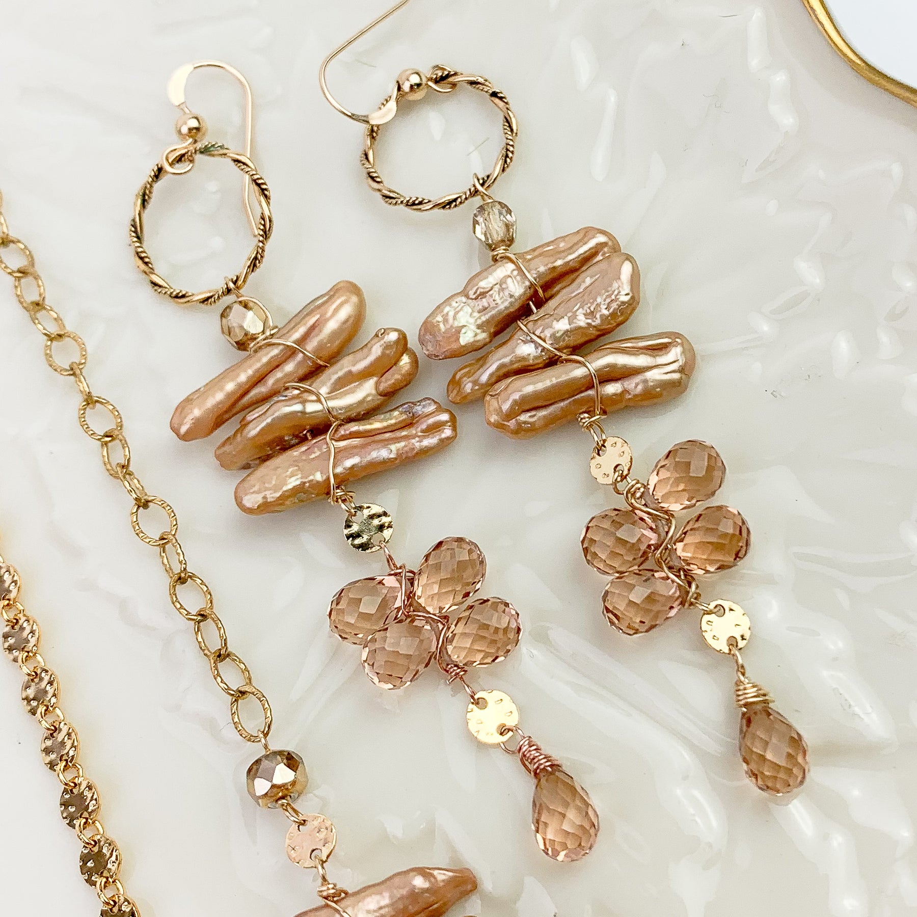 These handcrafted pearl and Tea Topaz earrings blend organic texture with refined sparkle. Elongated freshwater pearls bring natural beauty and glow, while faceted Tea Topaz adds warmth and light-catching brilliance. Designed in 14k gold filled for durability and everyday elegance, these earrings offer graceful length without feeling heavy. Perfect for special occasions or elevated daily wear, they pair beautifully with neutrals, soft metallics, and layered jewelry looks. One of a kind and sold separately from necklaces shown.