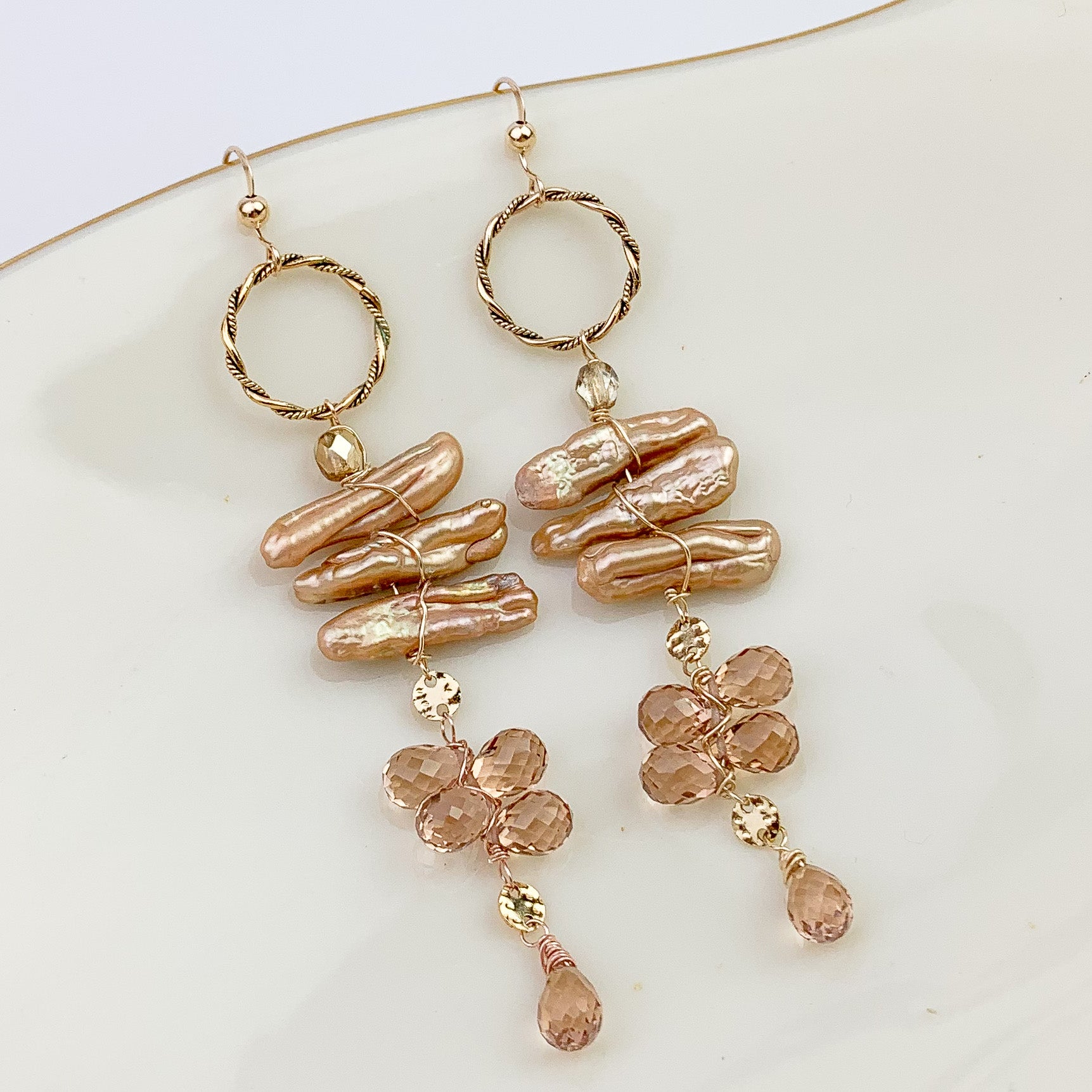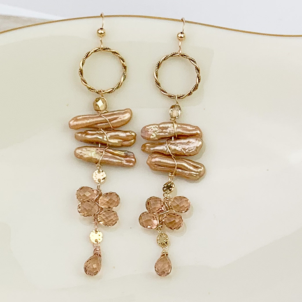 One-of-a-kind drop earrings featuring luminous champagne freshwater pearls and faceted Tea Topaz, finished in 14k gold filled. Elegant movement with warm, soft sparkle. Approximately 3 inches long. Only one pair available.