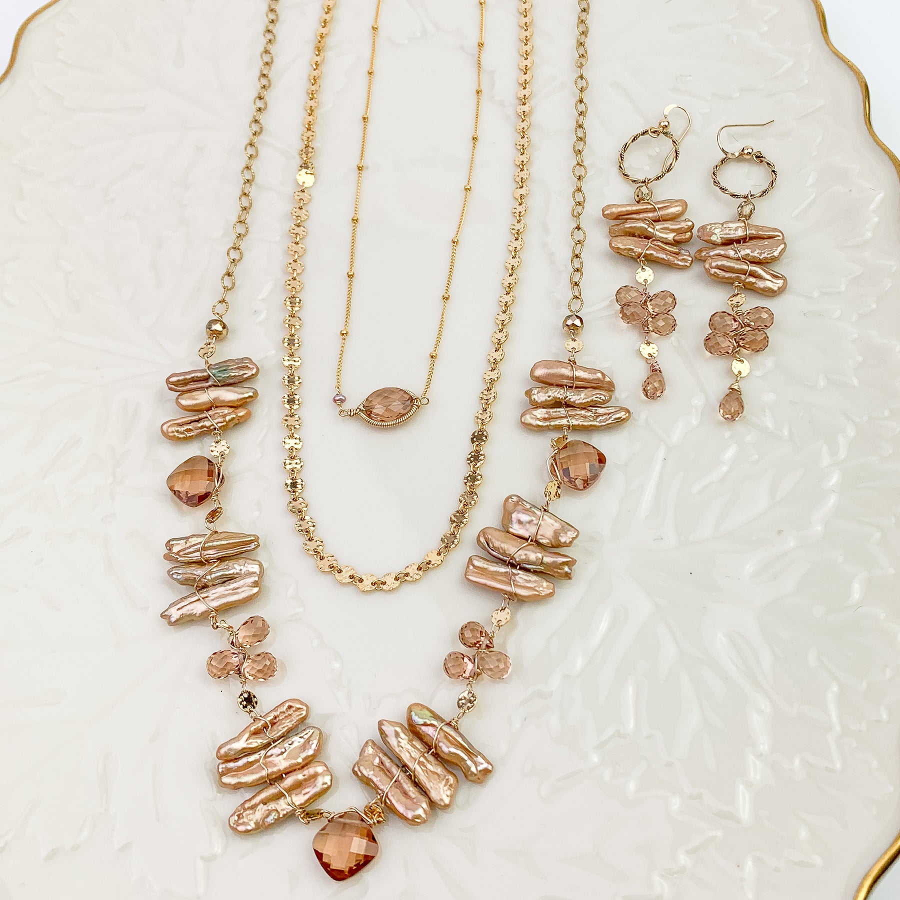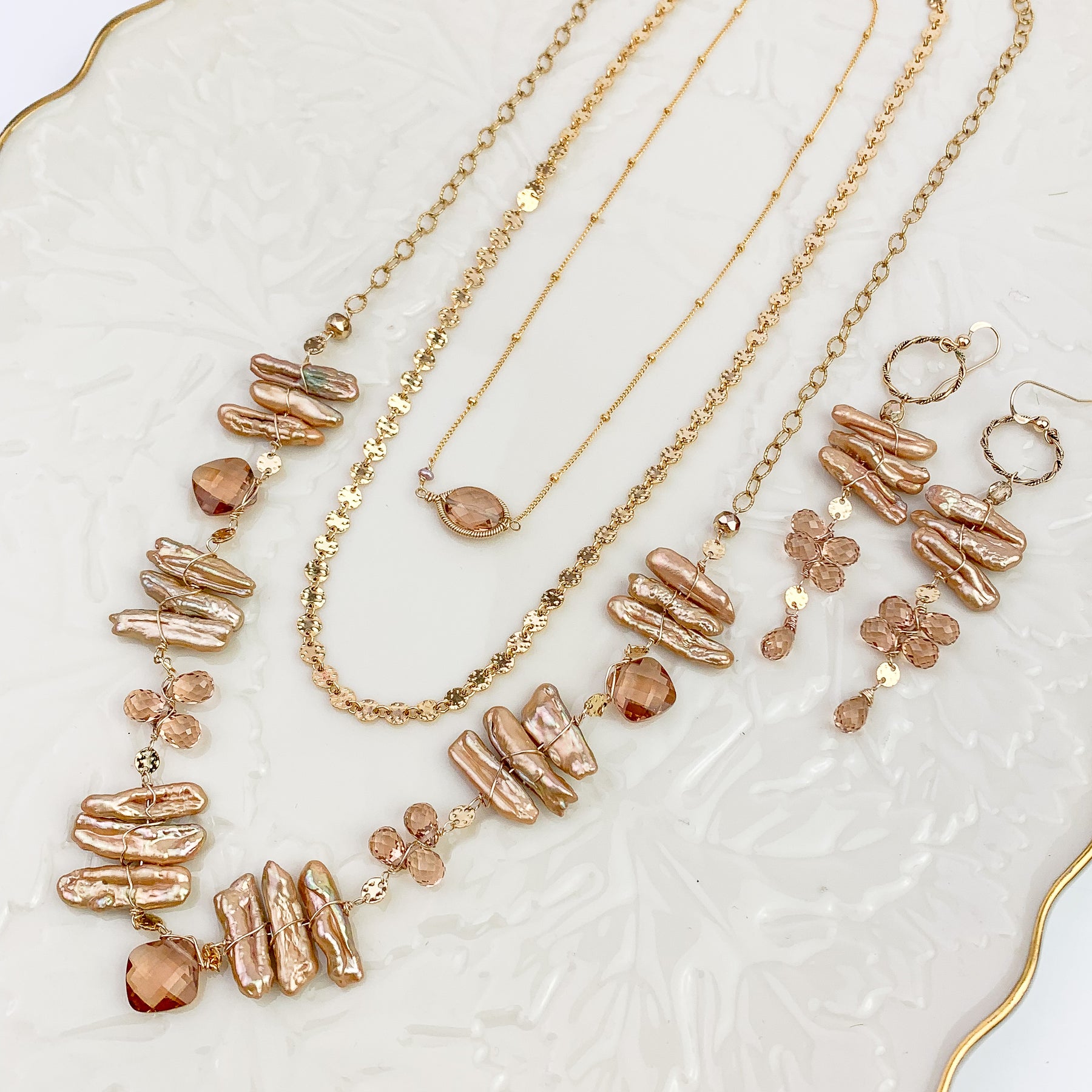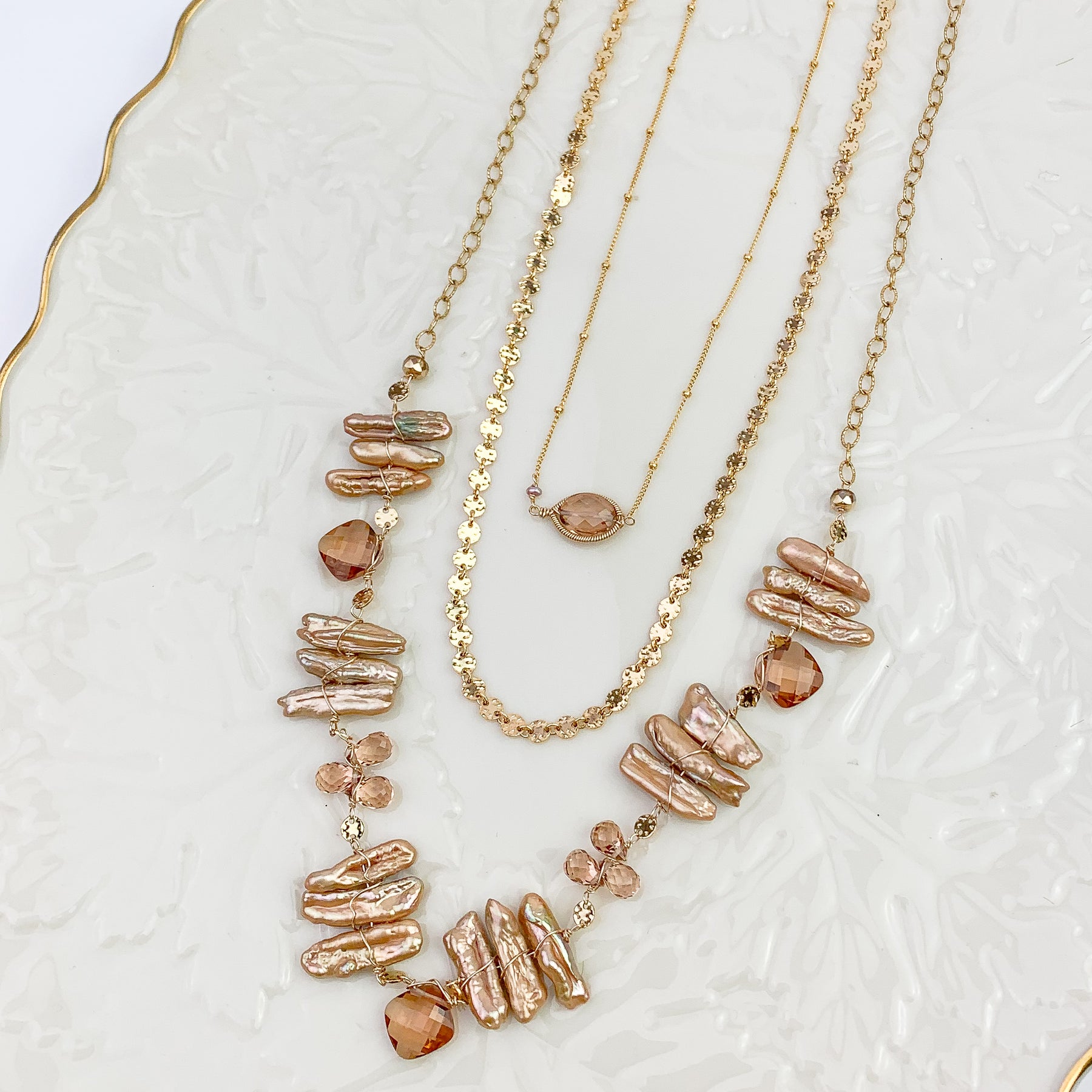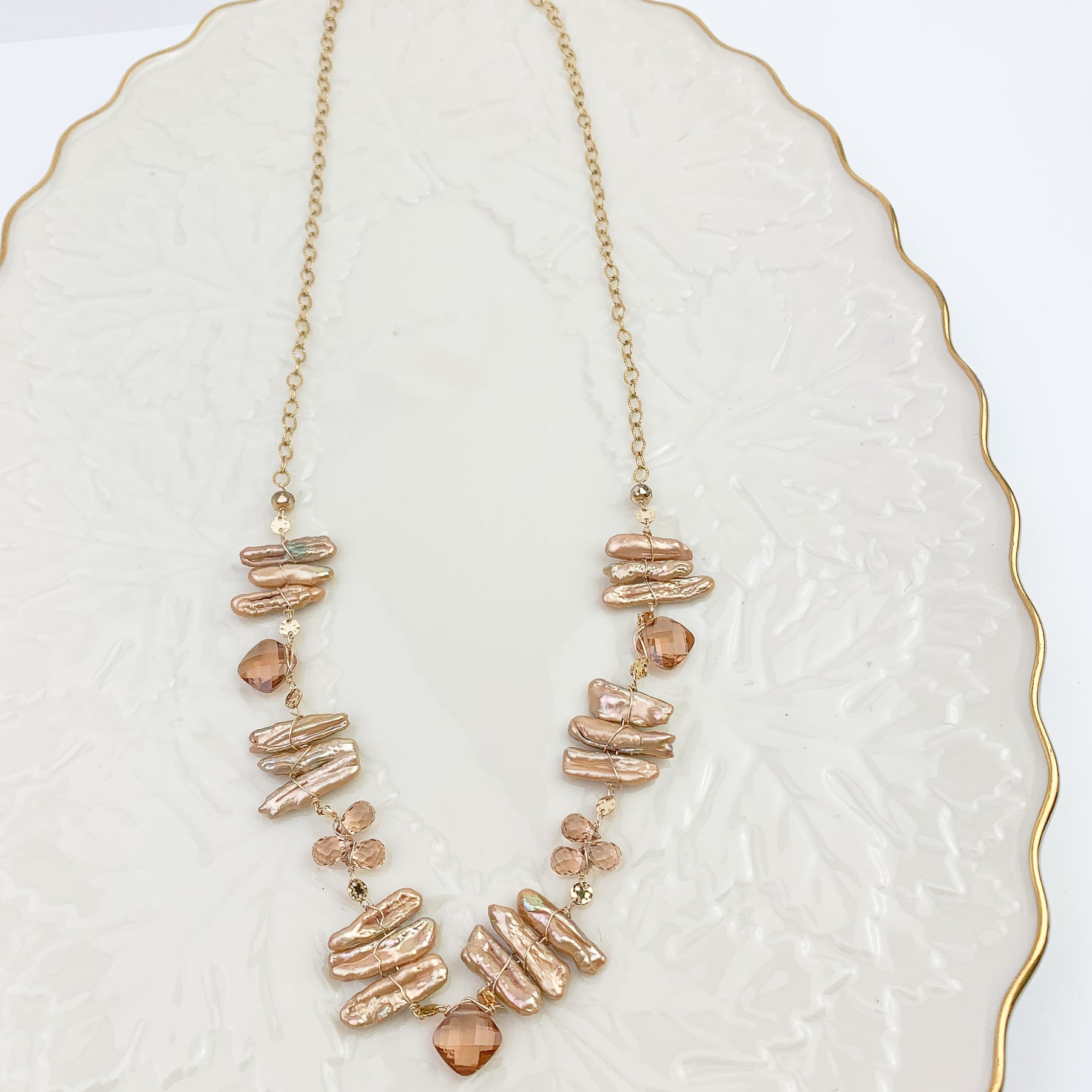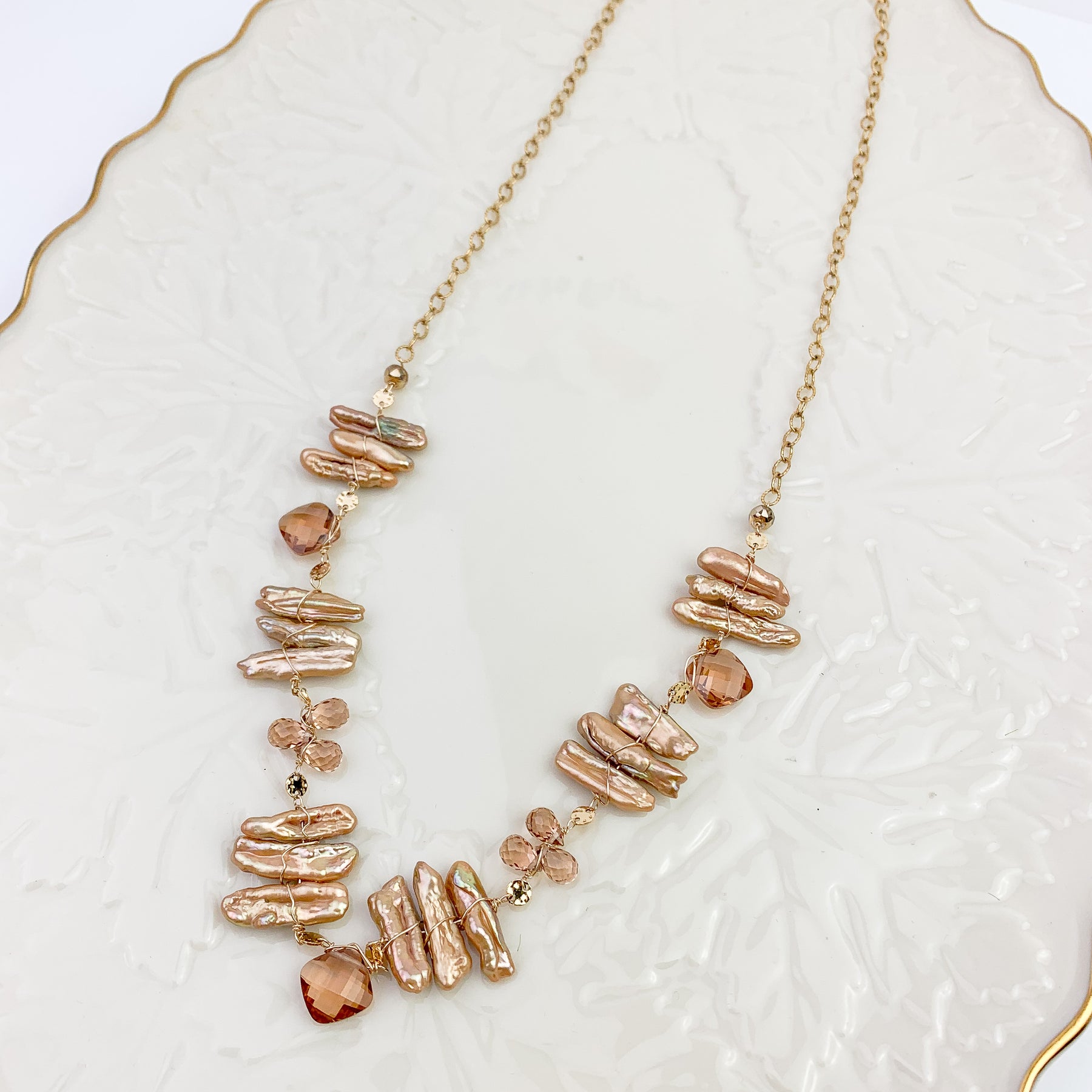 Softly luminous pearls paired with warm Tea Topaz create a quiet, romantic glow. This one-of-a-kind necklace is designed with gentle movement and an elegant filigree chain that adds subtle texture and light-catching detail. The palette is warm, feminine, and timeless—easy to wear on its own or layered with your favorite everyday pieces.
