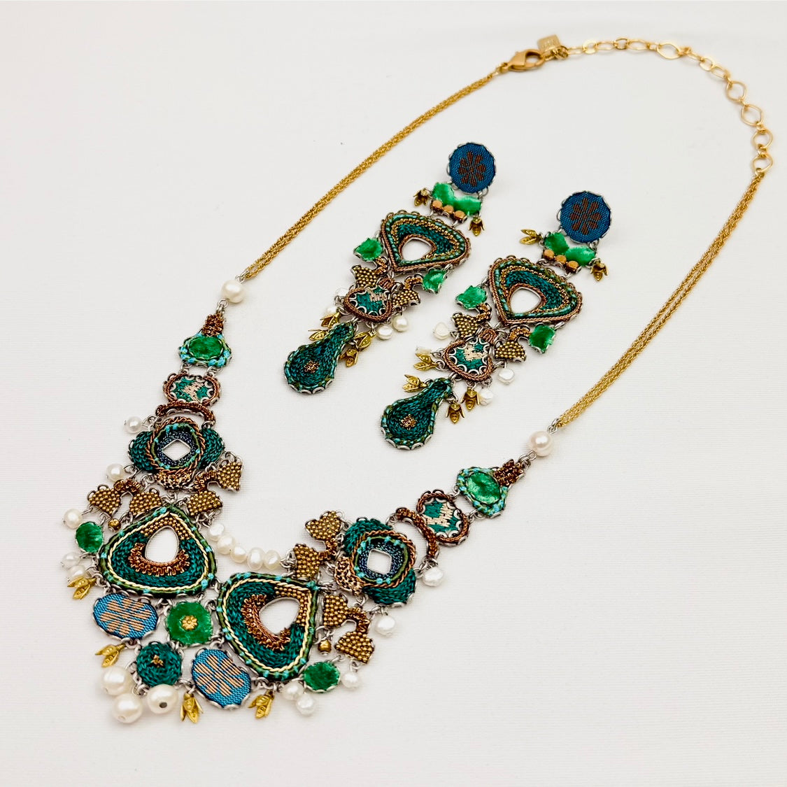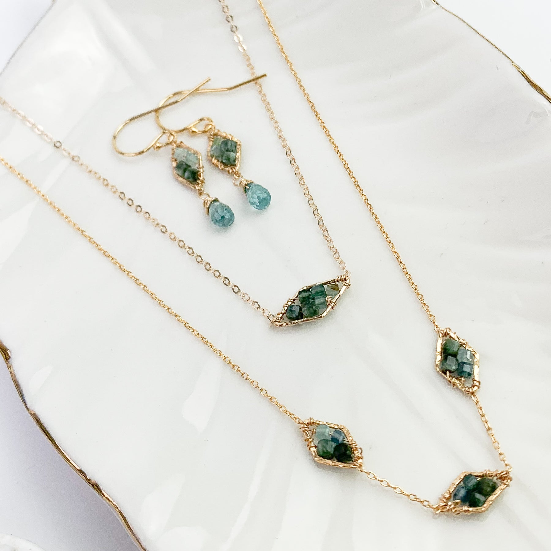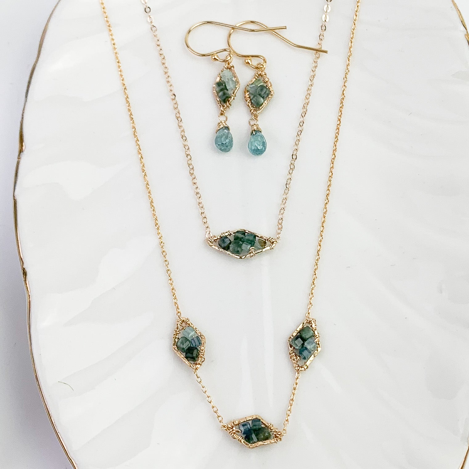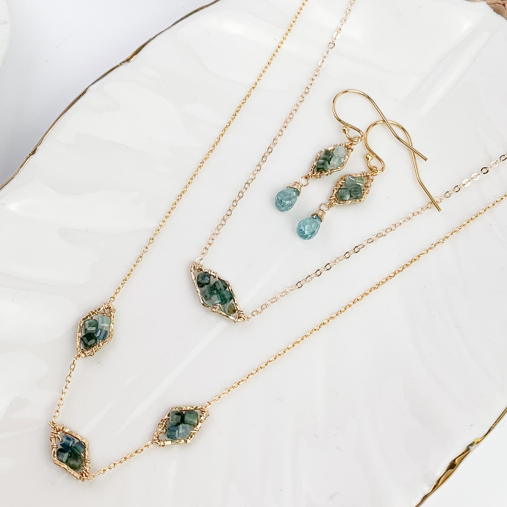 Inspired by deep forest tones and the quiet glow after rain, this handcrafted jewelry set brings together layered shades of blue, green, and inky black. Faceted labradorite, seraphinite, and blue-green tourmaline are woven together in delicate gold filled wire, accented with smooth black onyx for contrast and depth.