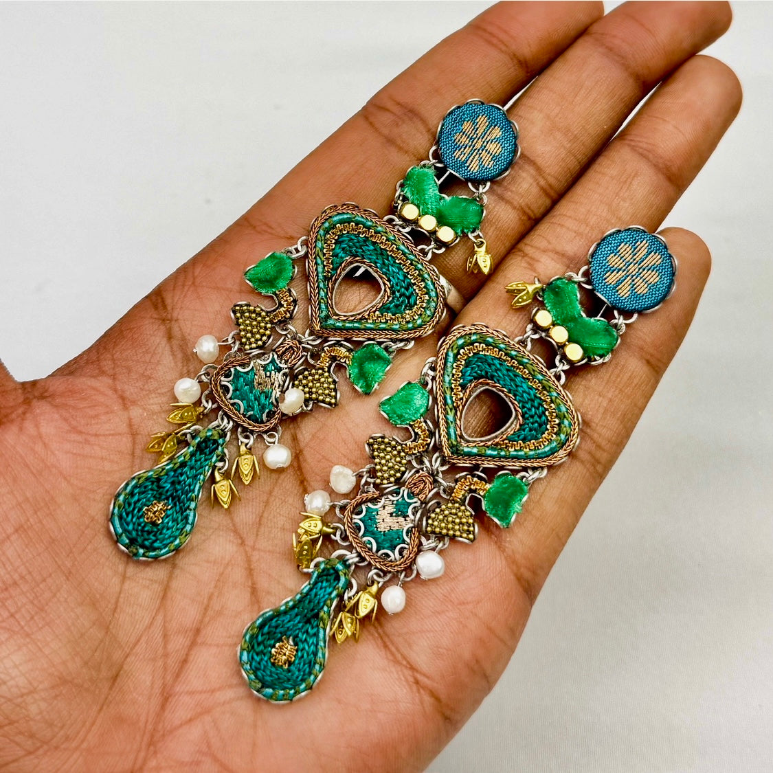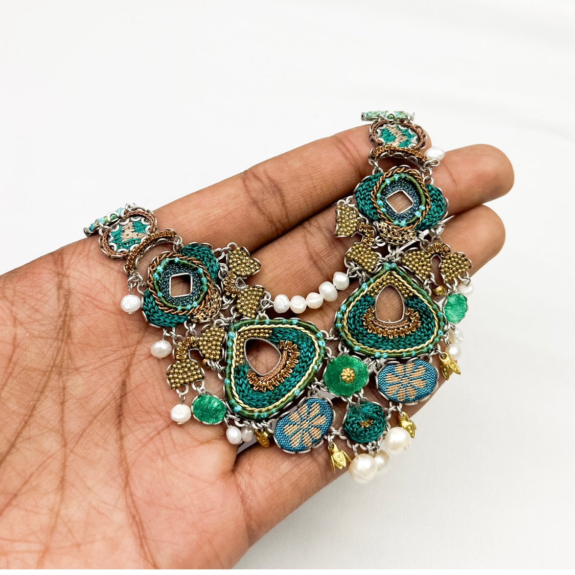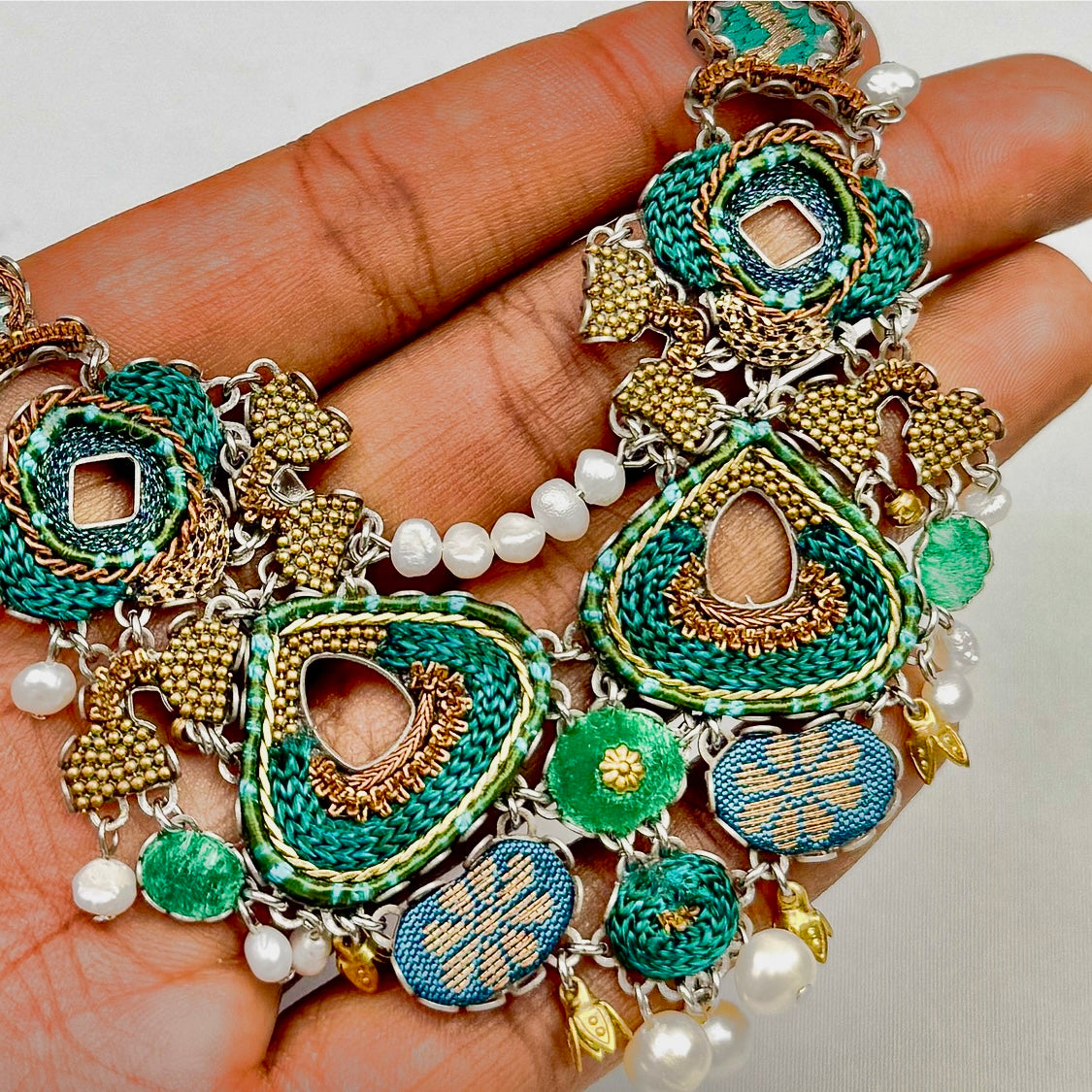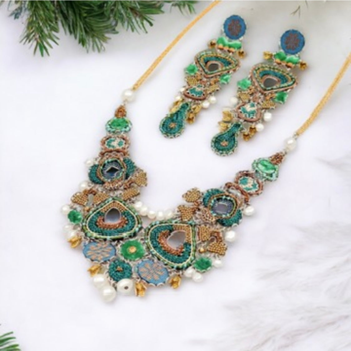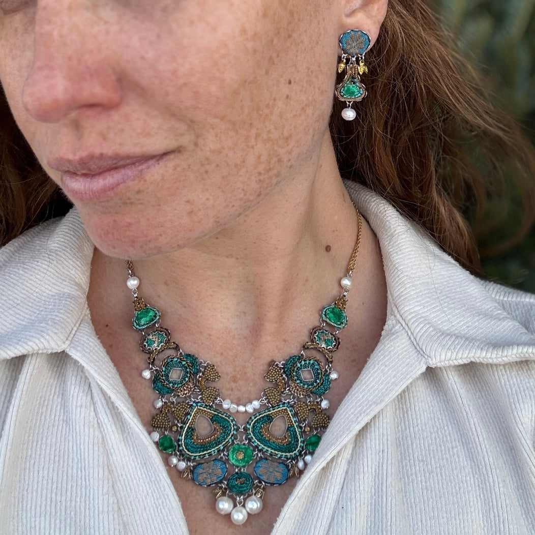 Inspired by deep forest tones and the quiet glow after rain, this handcrafted jewelry set brings together layered shades of blue, green, and inky black. Faceted labradorite, seraphinite, and blue-green tourmaline are woven together in delicate gold filled wire, accented with smooth black onyx for contrast and depth.