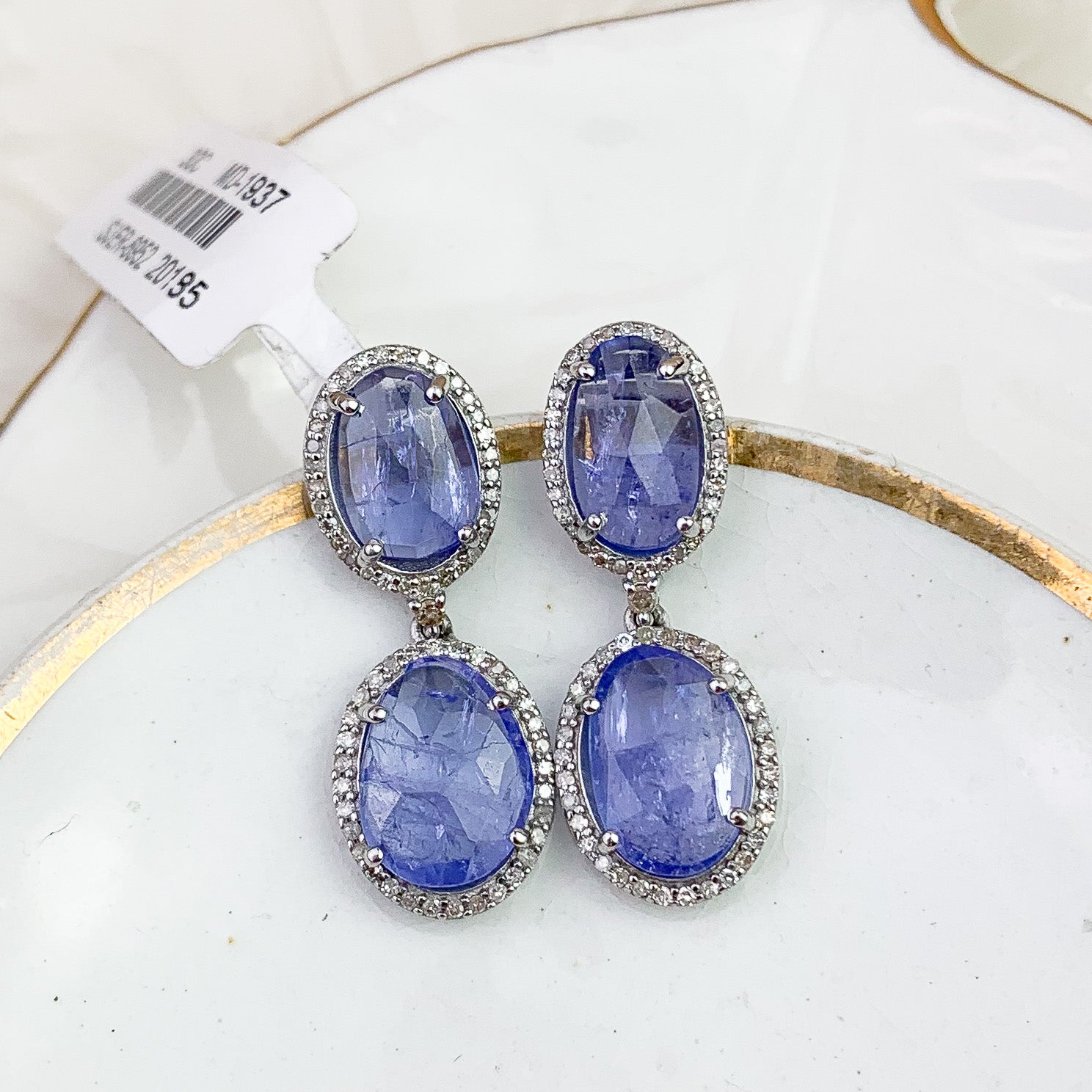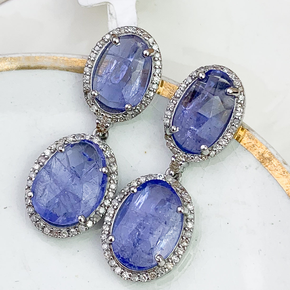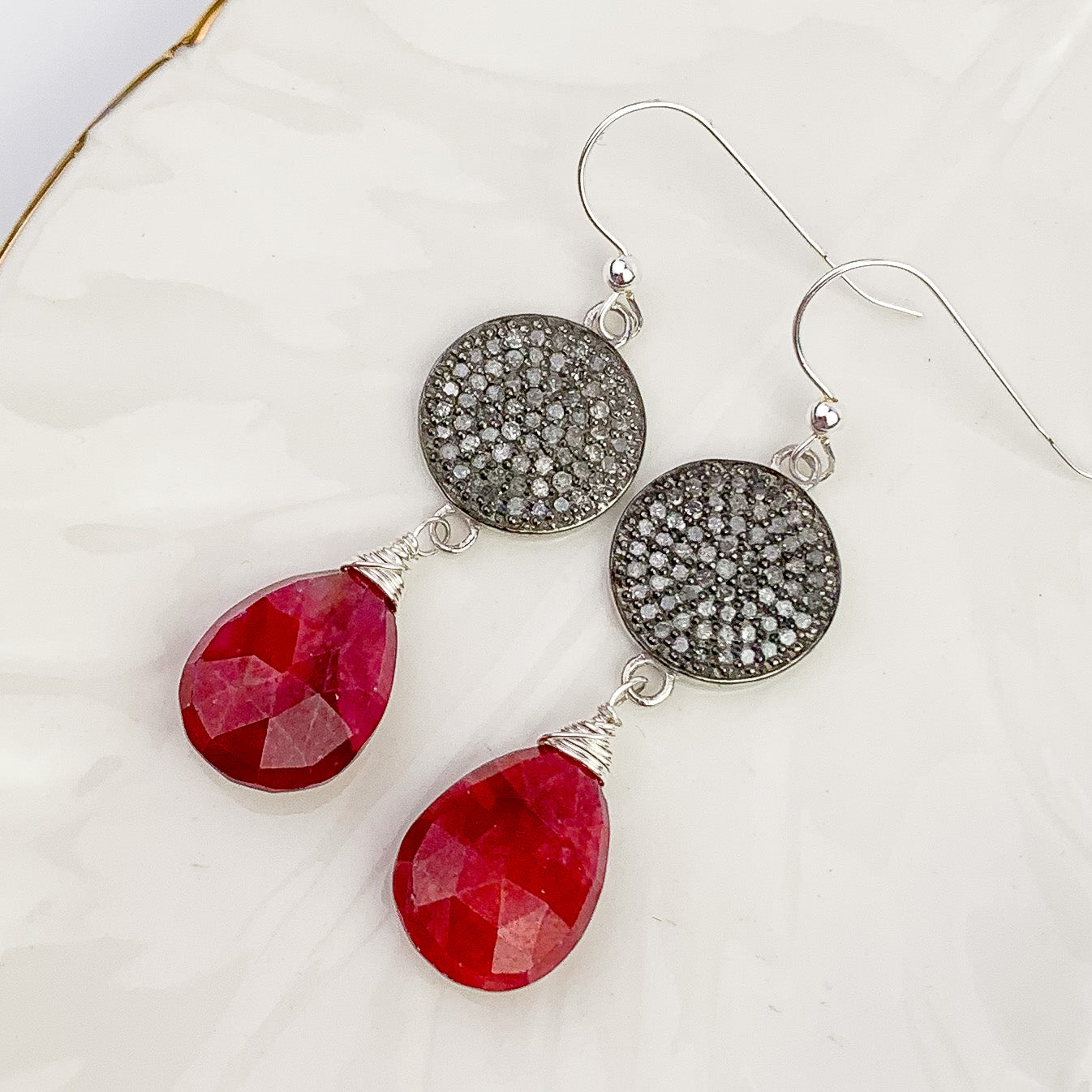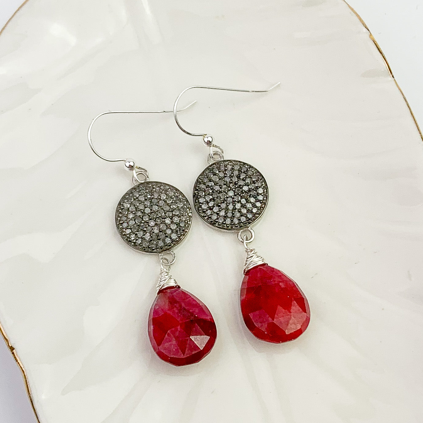 One-of-a-kind sterling silver earrings featuring rich ruby drops paired with pavé diamonds. Bold color, elegant sparkle, and timeless contrast. Approximately 2 inches long.