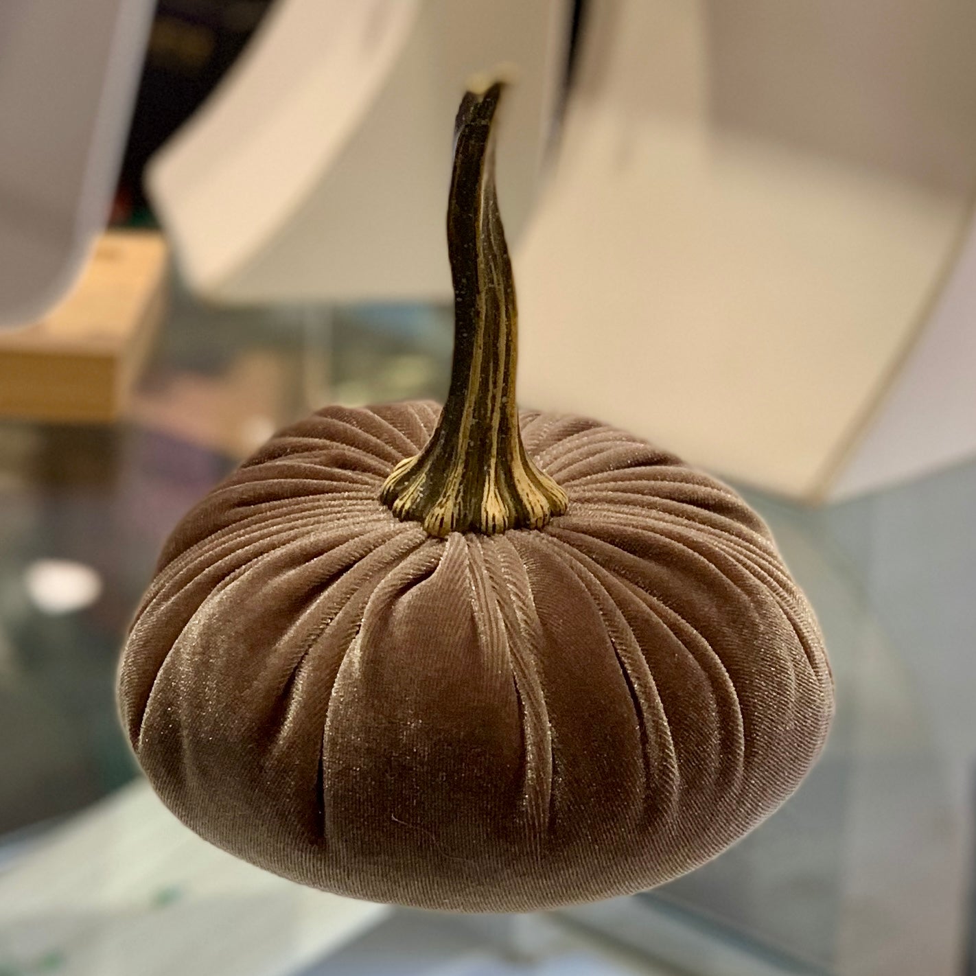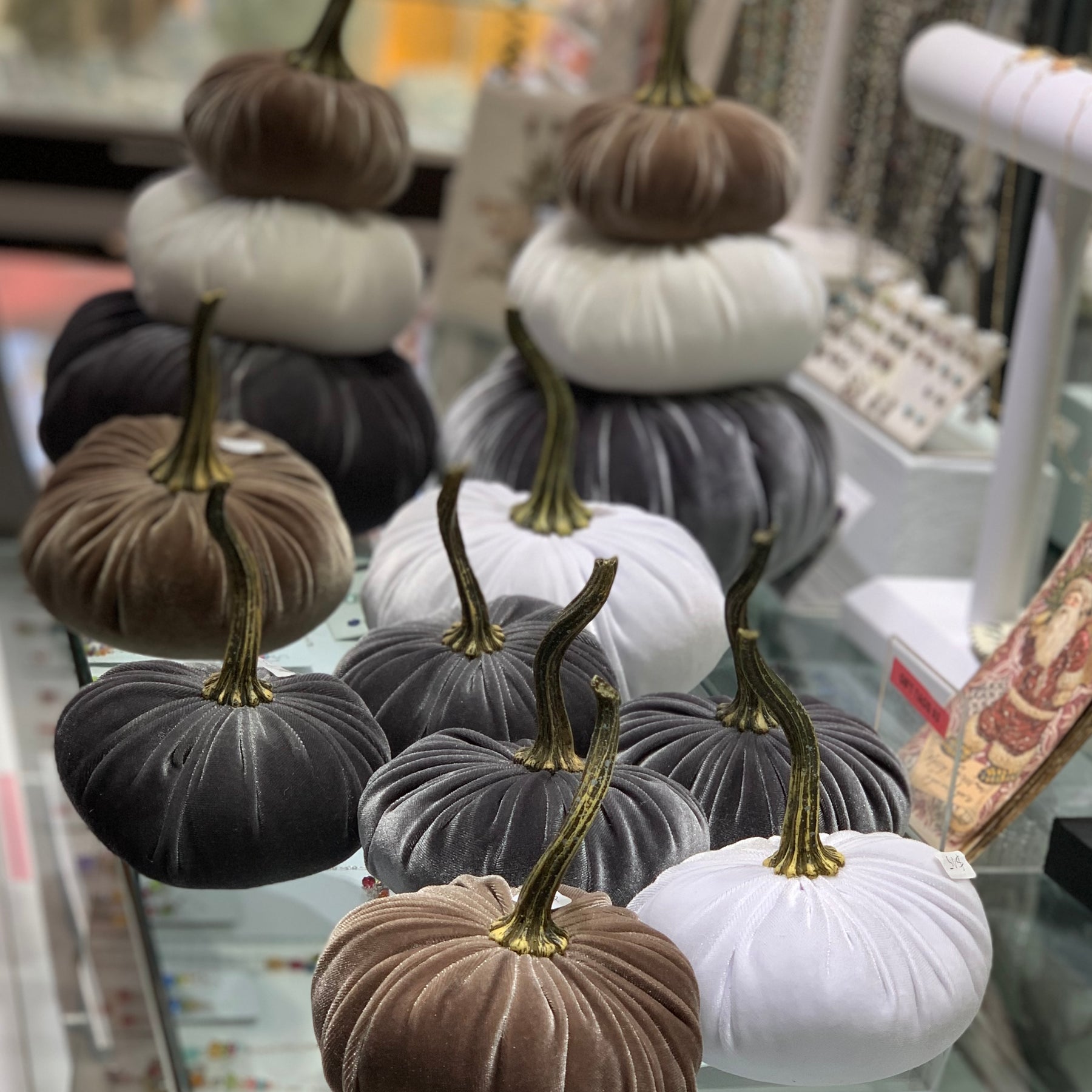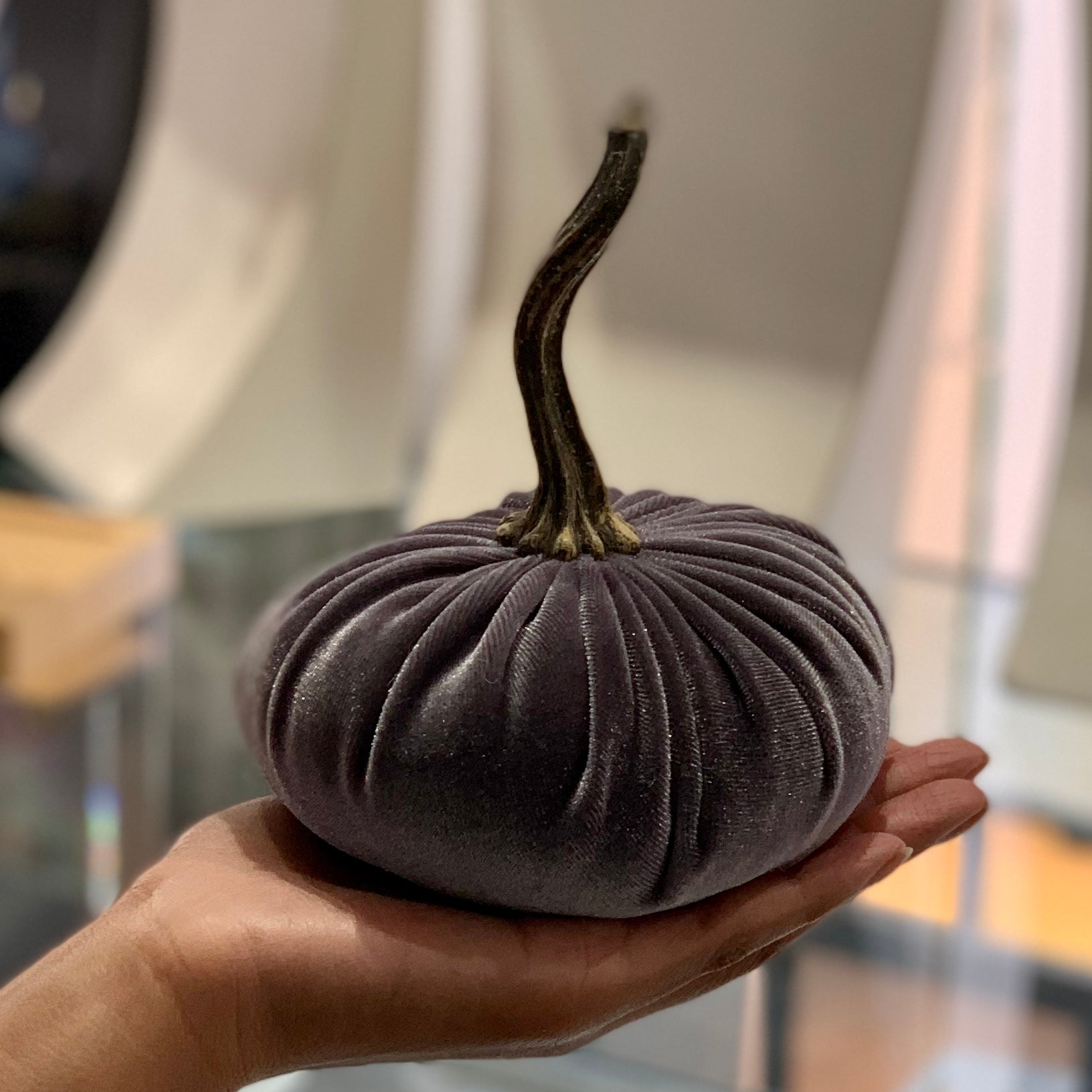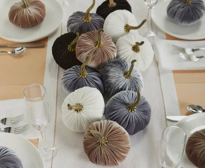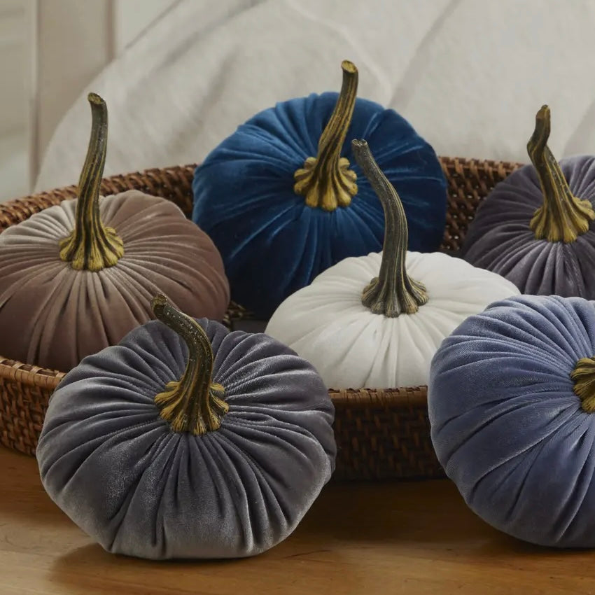 Each pumpkin features a realistic, durable resin stem and luxurious velvet in curated hues of grey, taupe, and ivory. Display them individually or as a trio to bring texture and warmth to your space — imagine your holiday table with these artful accents scattered among candles and greenery.