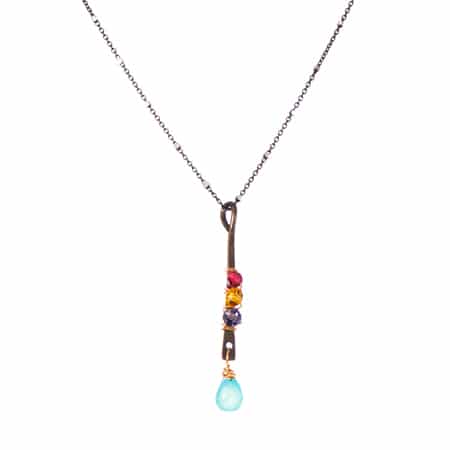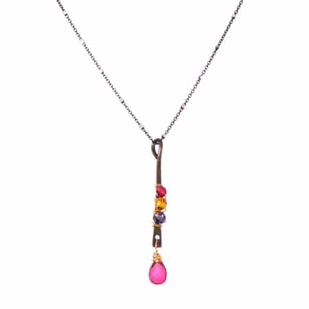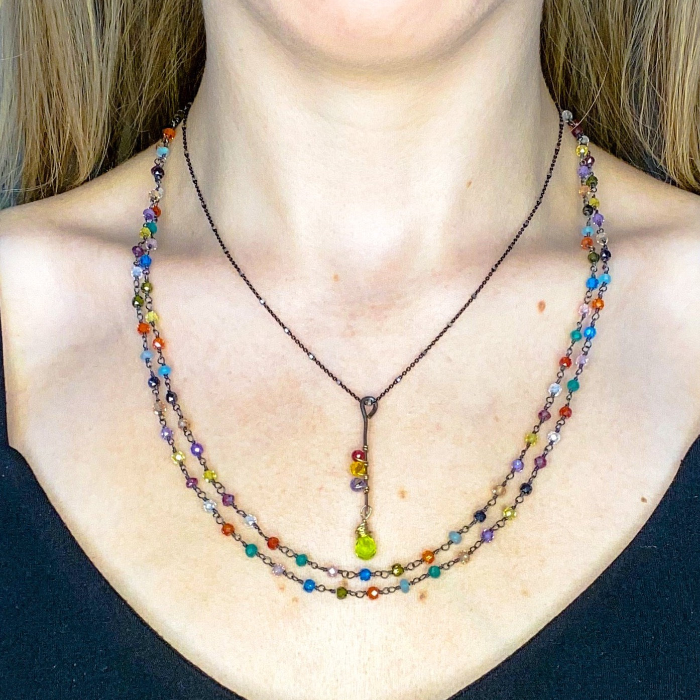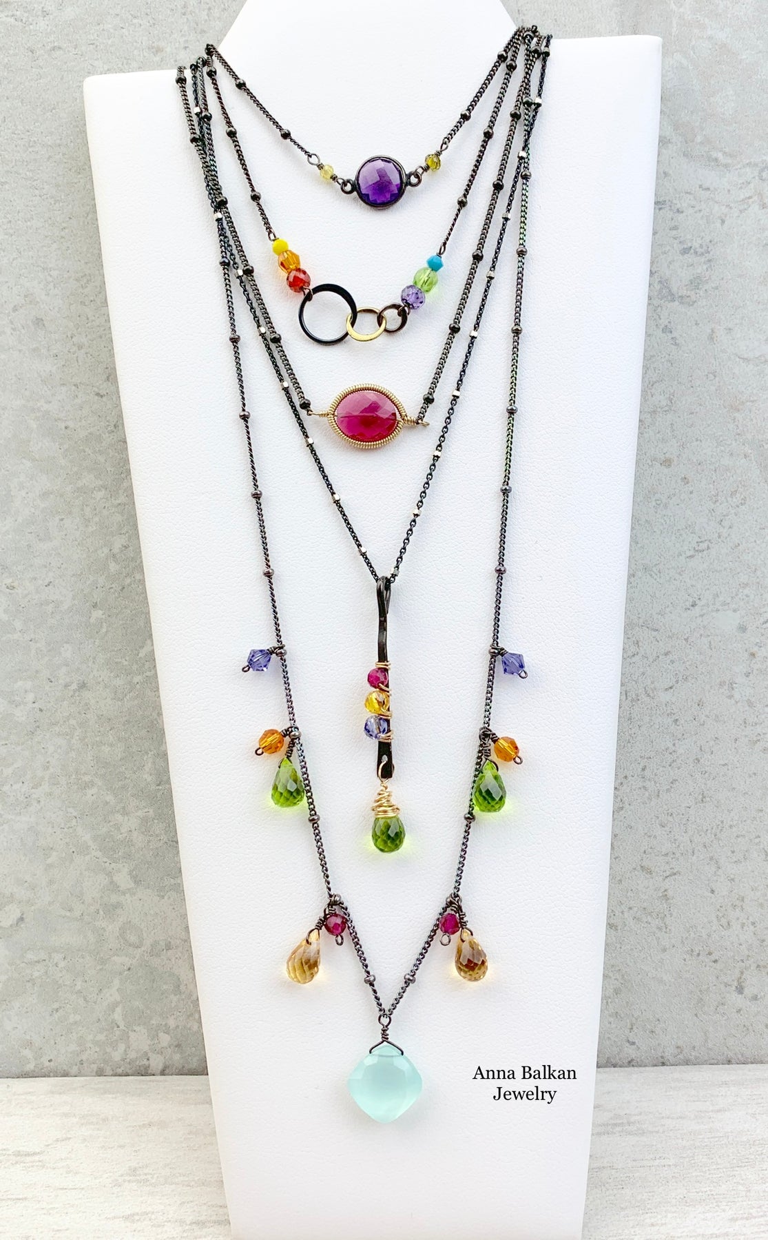 Style Tip: layer with coordinating necklace at the top that is a color you see in the main necklace, but not to match the focal gem color. In this example blue Quartz top necklace picked up blue from the cluster of gems. And earrings match the main necklace focal gem, in this case it’s Ruby Qz.