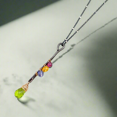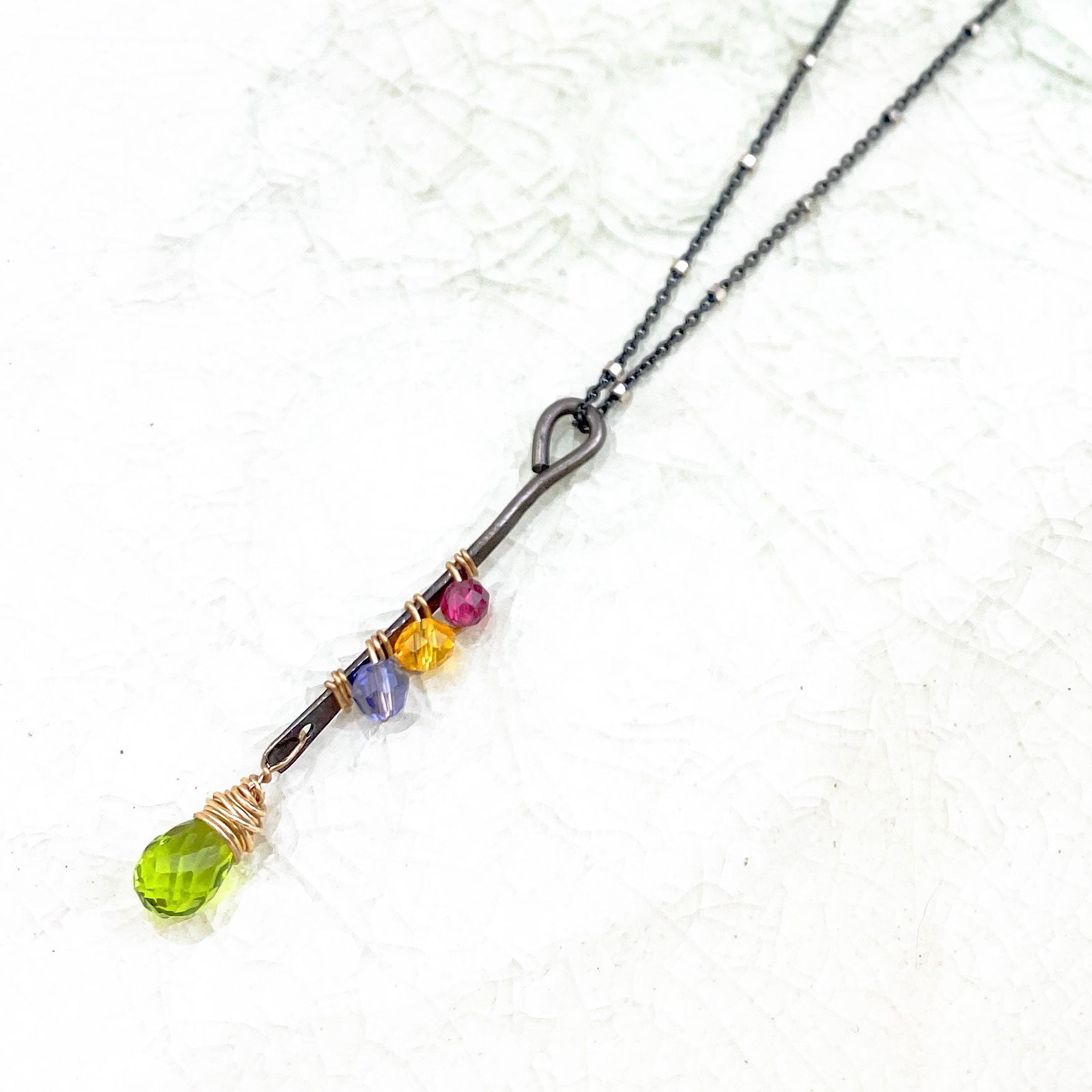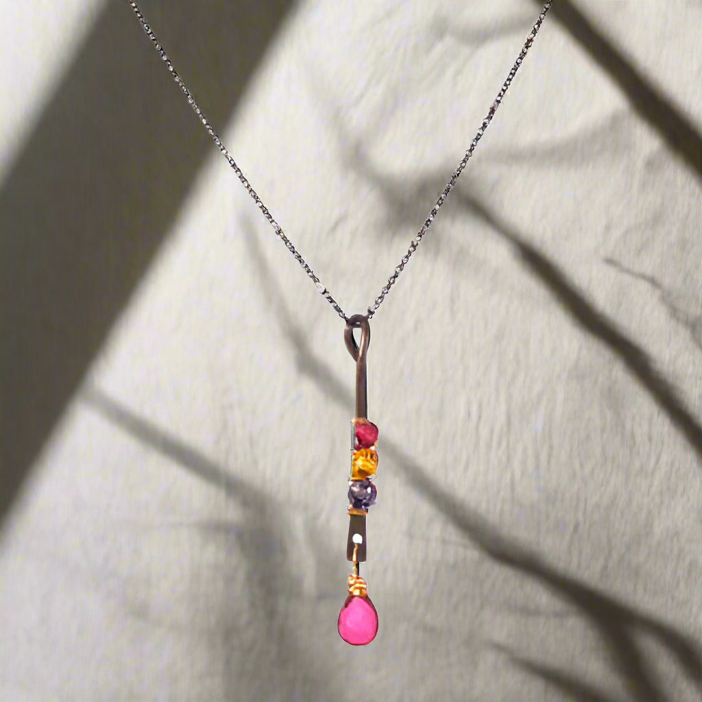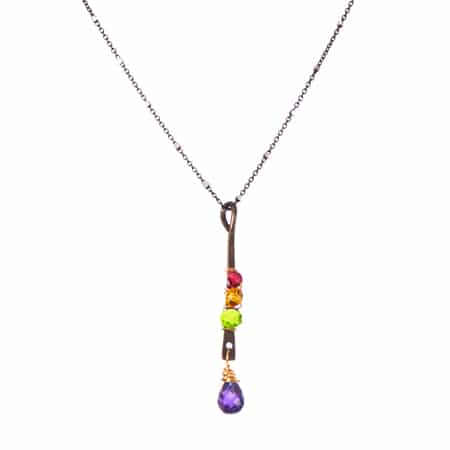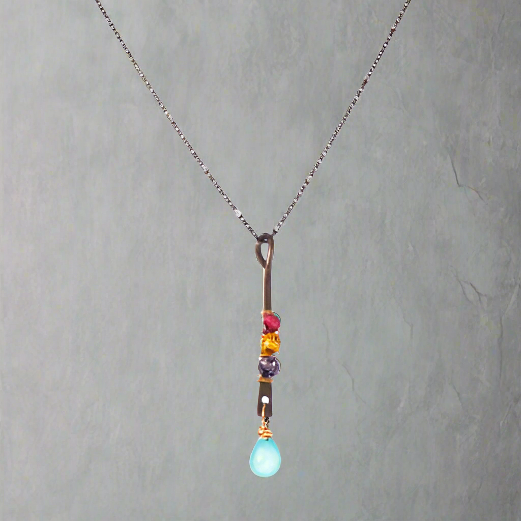 Style Tip: layer with coordinating necklace at the top that is a color you see in the main necklace, but not to match the focal gem color. In this example blue Quartz top necklace picked up blue from the cluster of gems. And earrings match the main necklace focal gem, in this case it’s Ruby Qz.