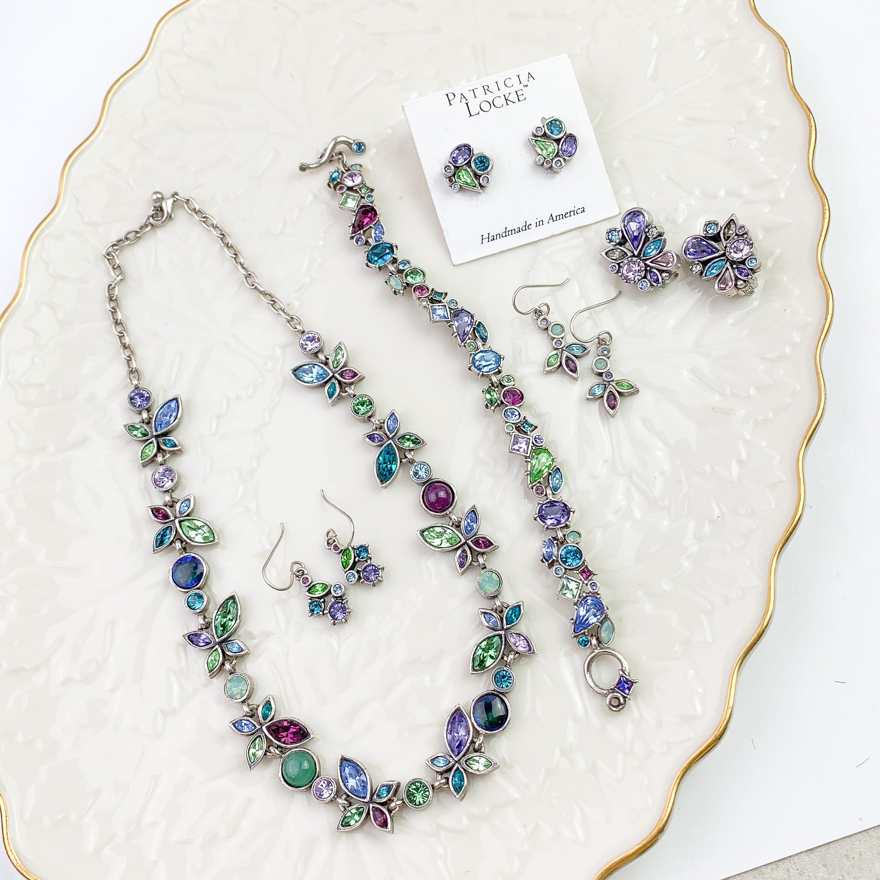 Each piece reflects her signature artistry — crafted in proprietary metal alloys with gold or silver plating and handset Austrian crystals.
