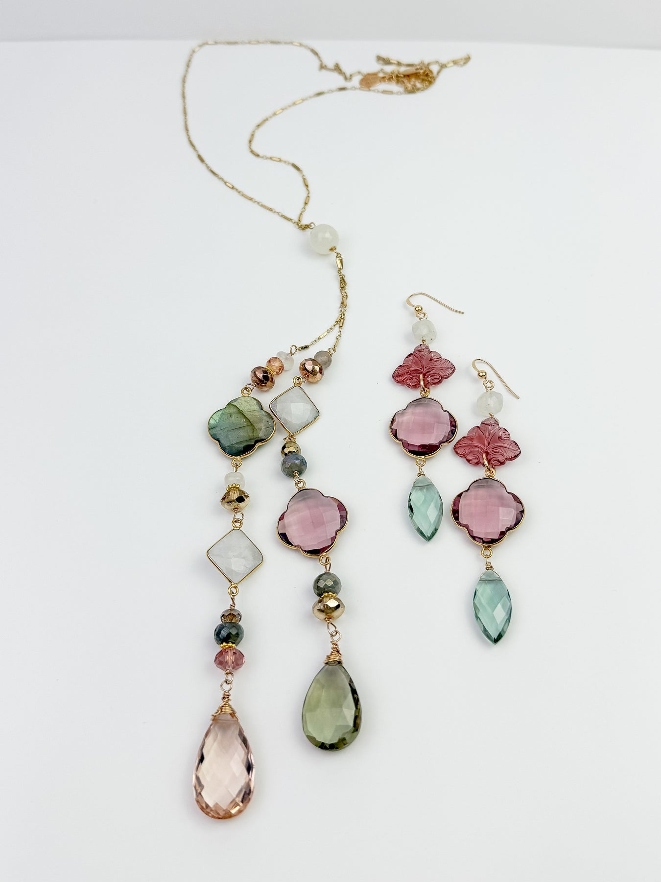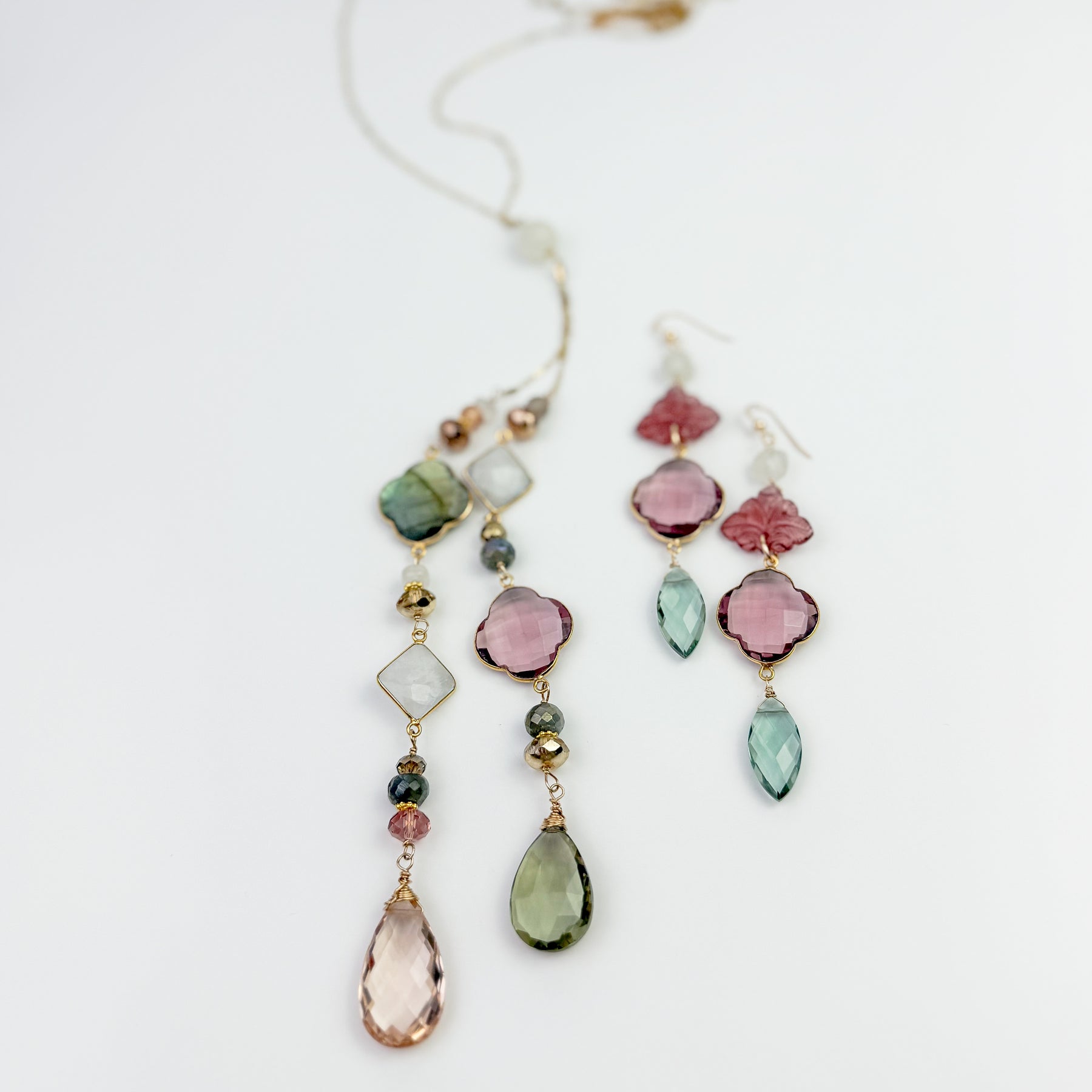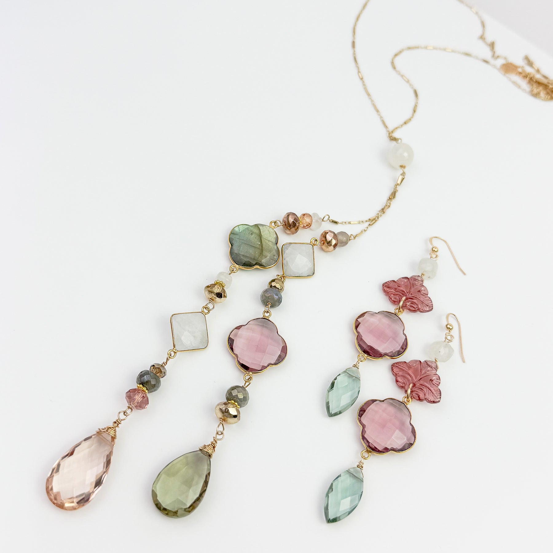 The adjustable lariat necklace offers effortless versatility — wear it long and fluid or adjust for layered styling. The coordinating earrings echo the same gem story, adding gentle movement and elegance with every turn of the head.
