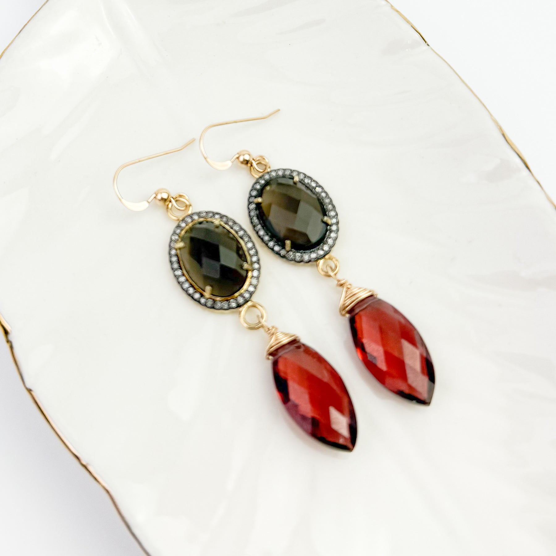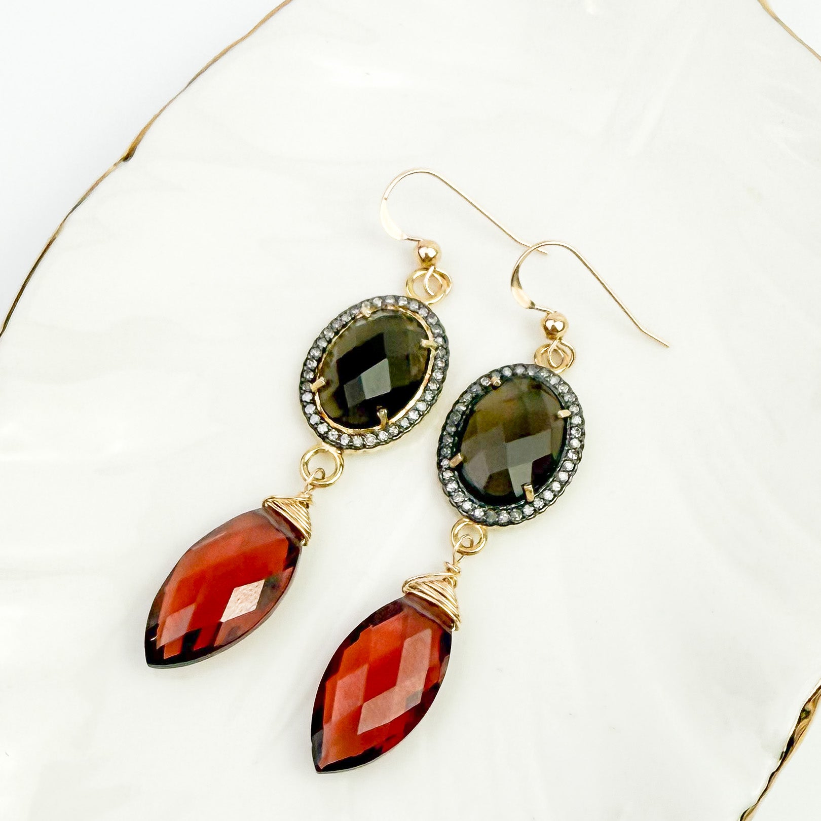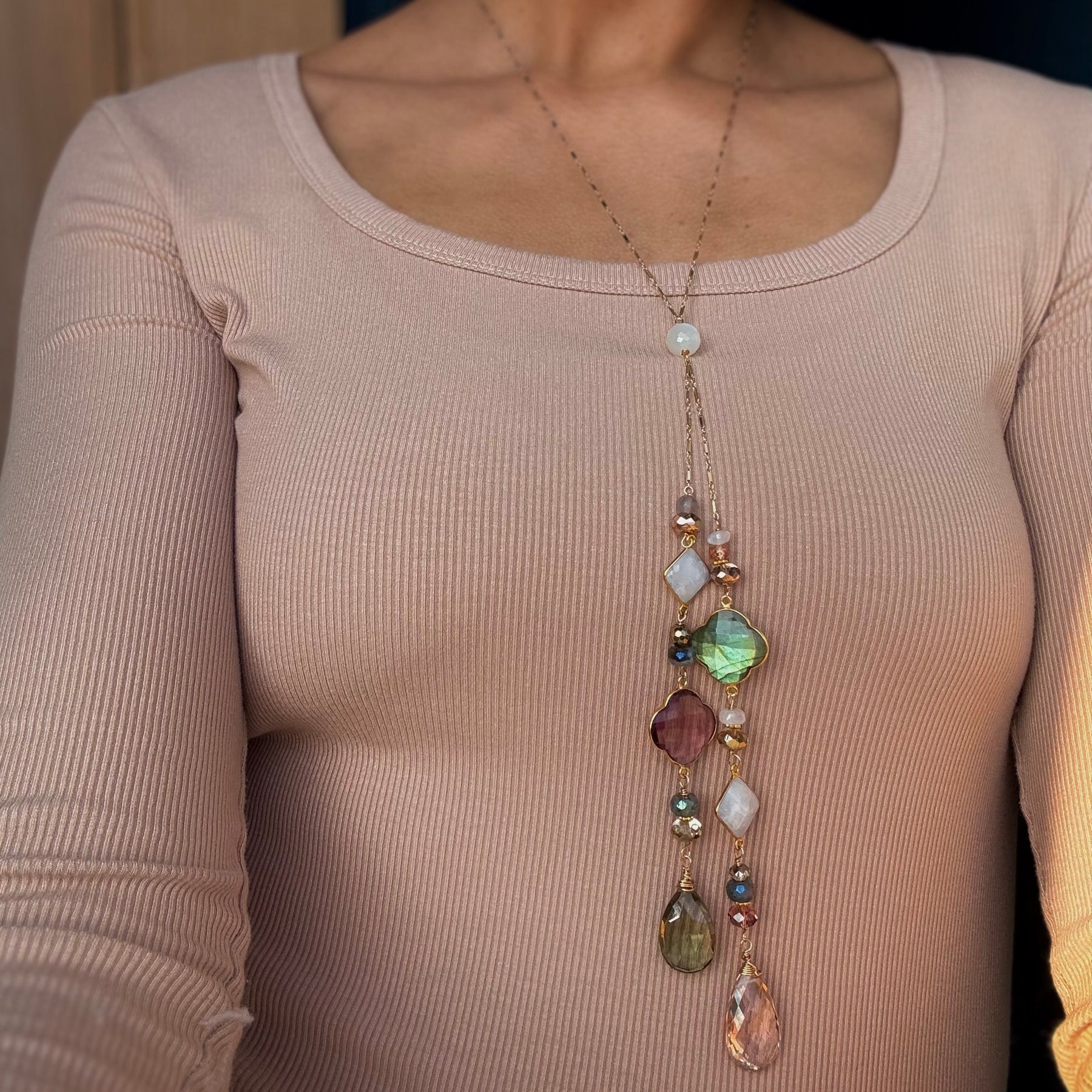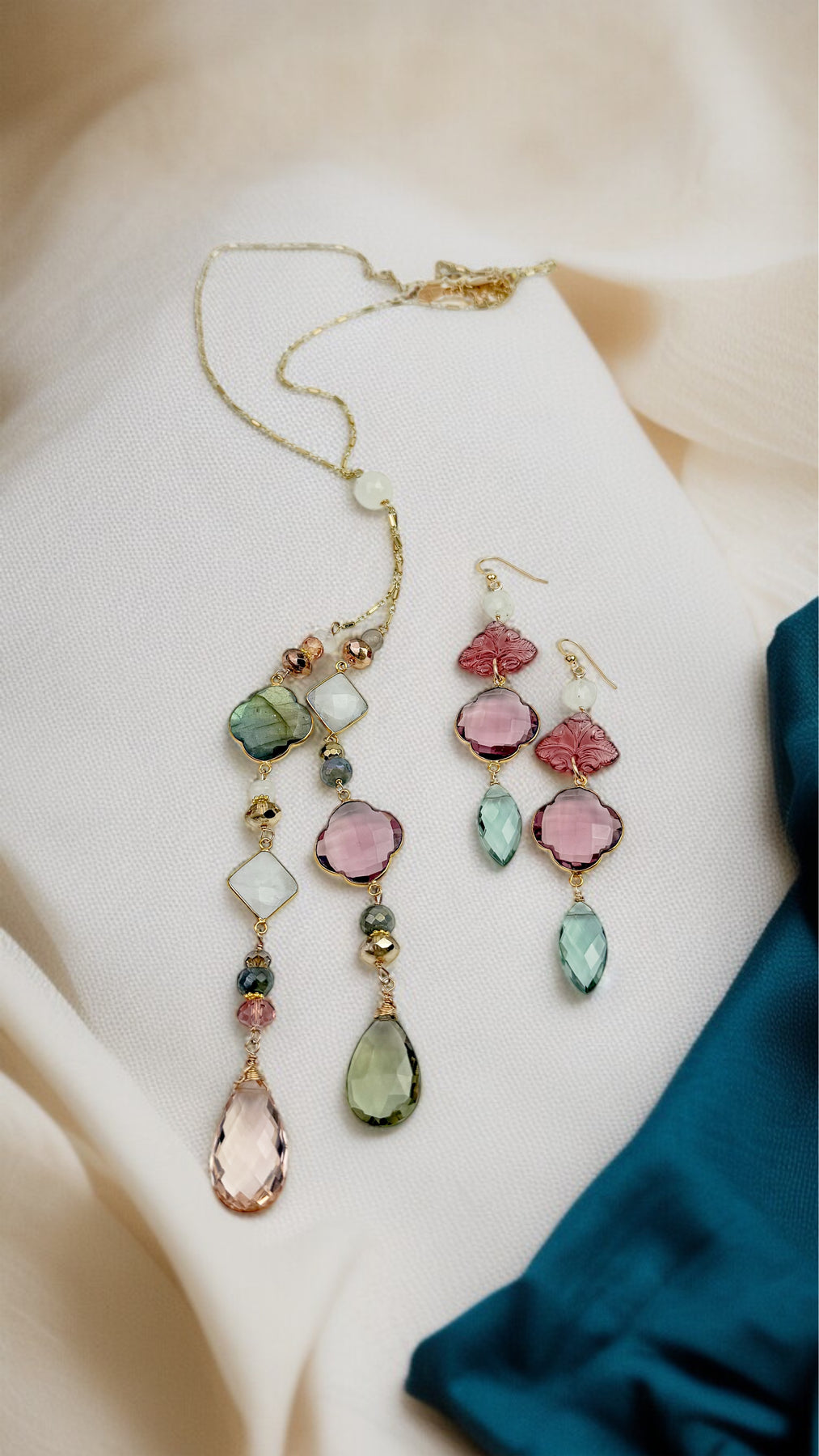 The adjustable lariat necklace offers effortless versatility — wear it long and fluid or adjust for layered styling. The coordinating earrings echo the same gem story, adding gentle movement and elegance with every turn of the head.