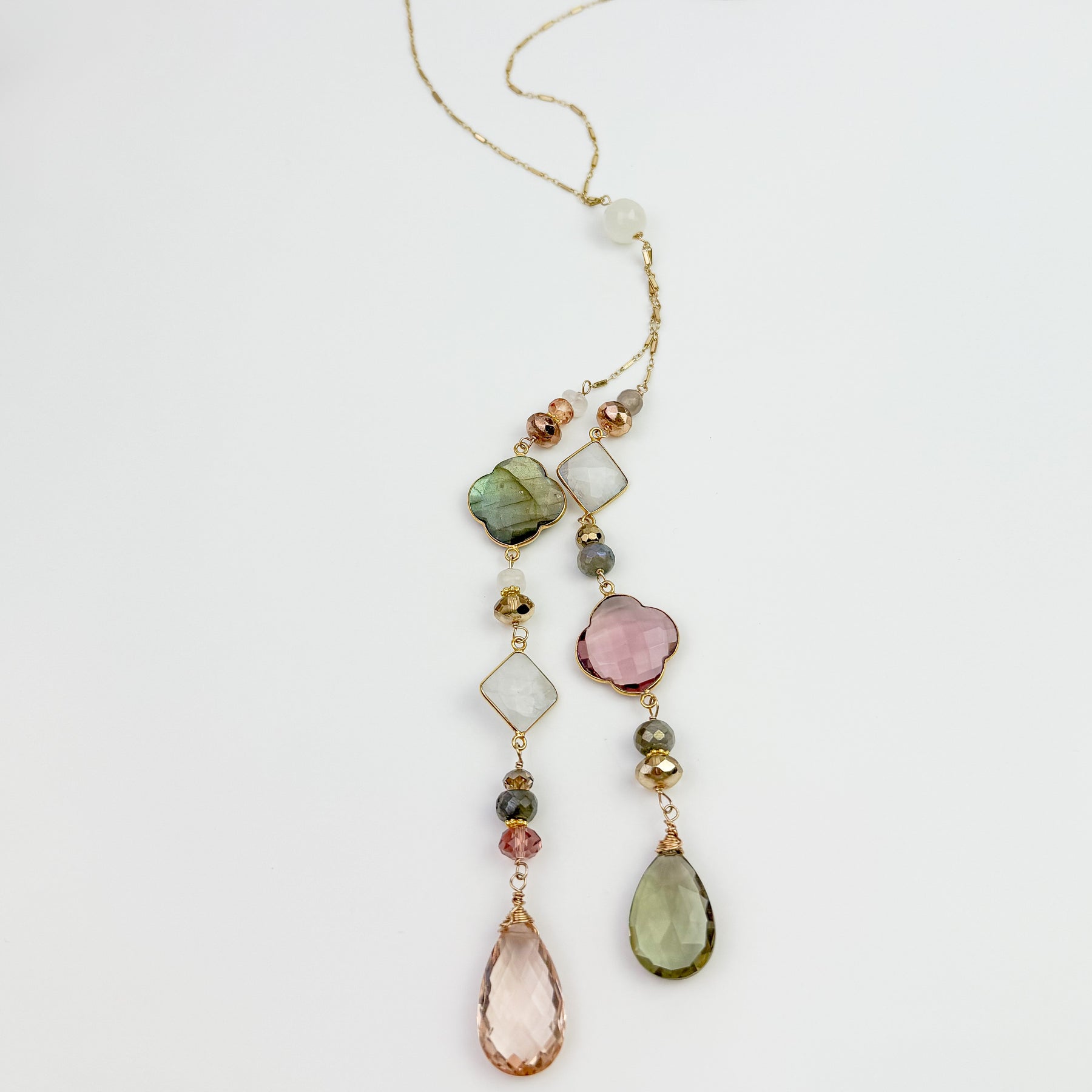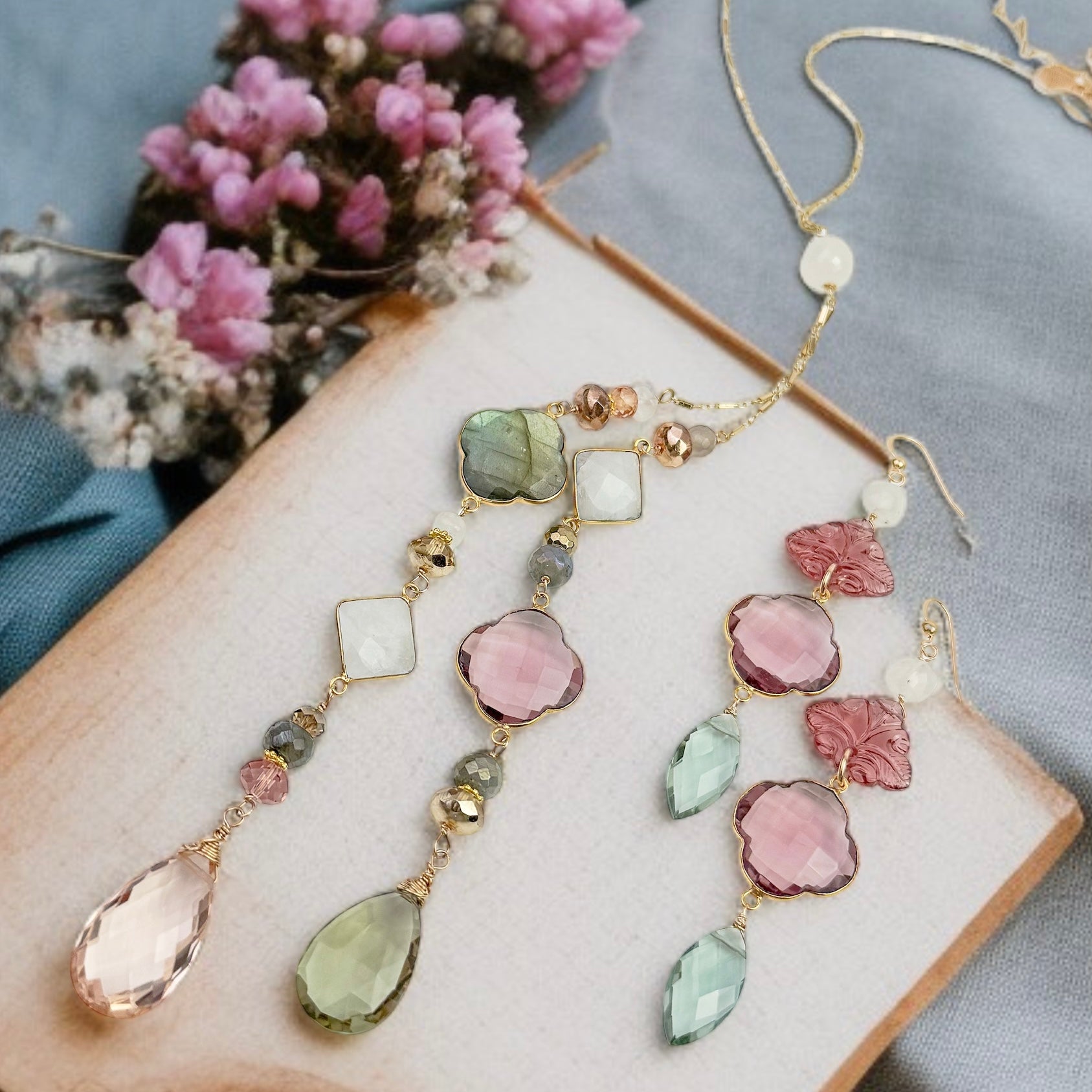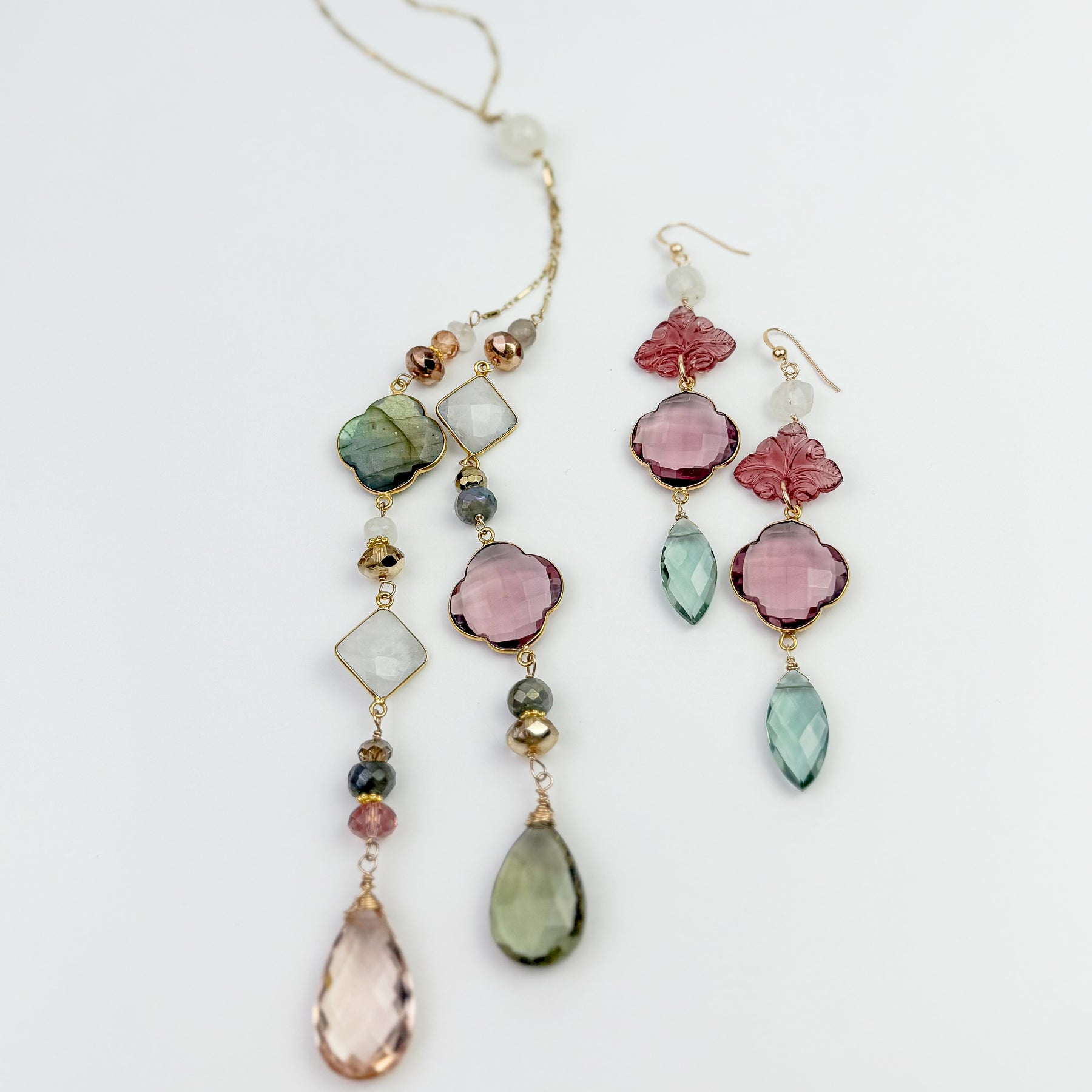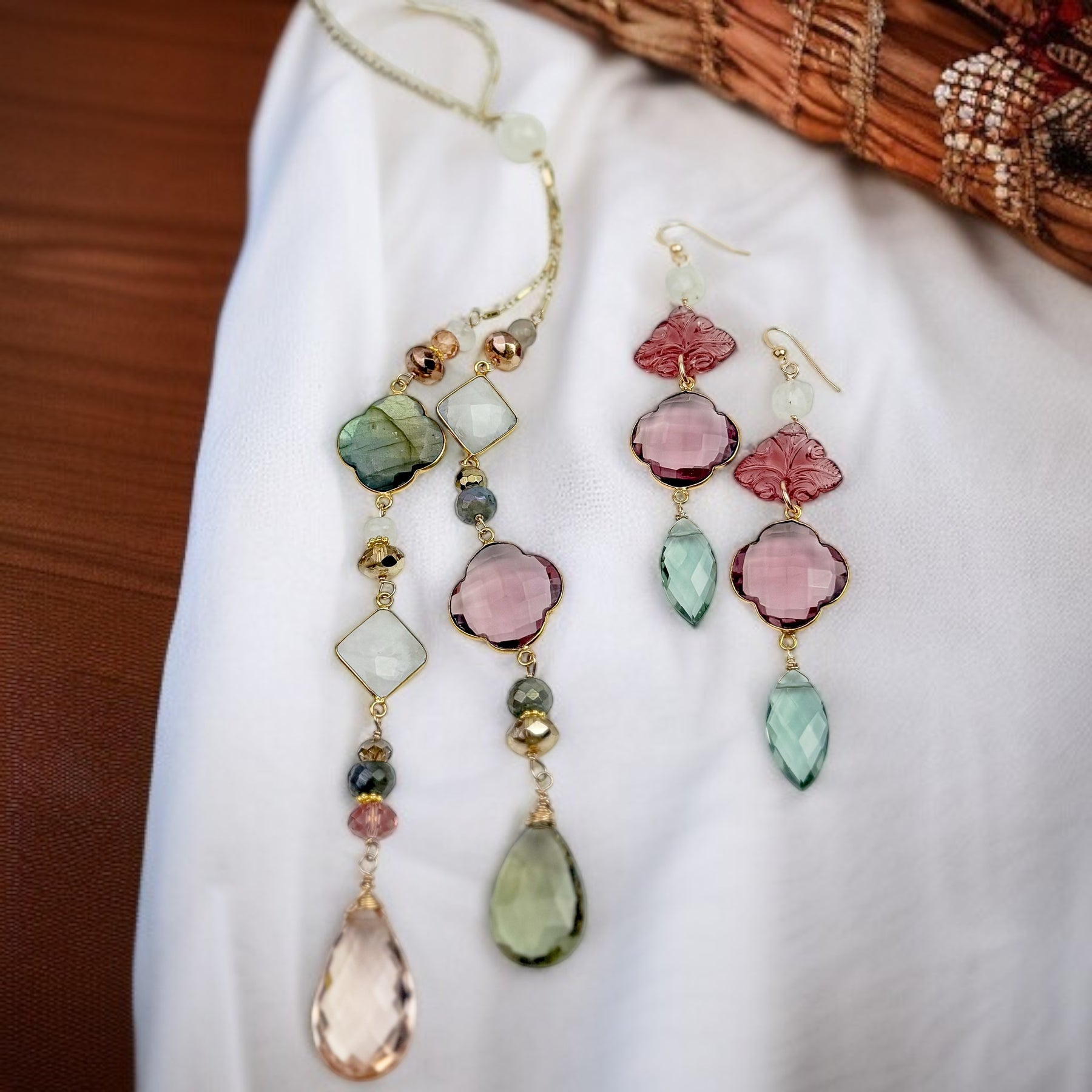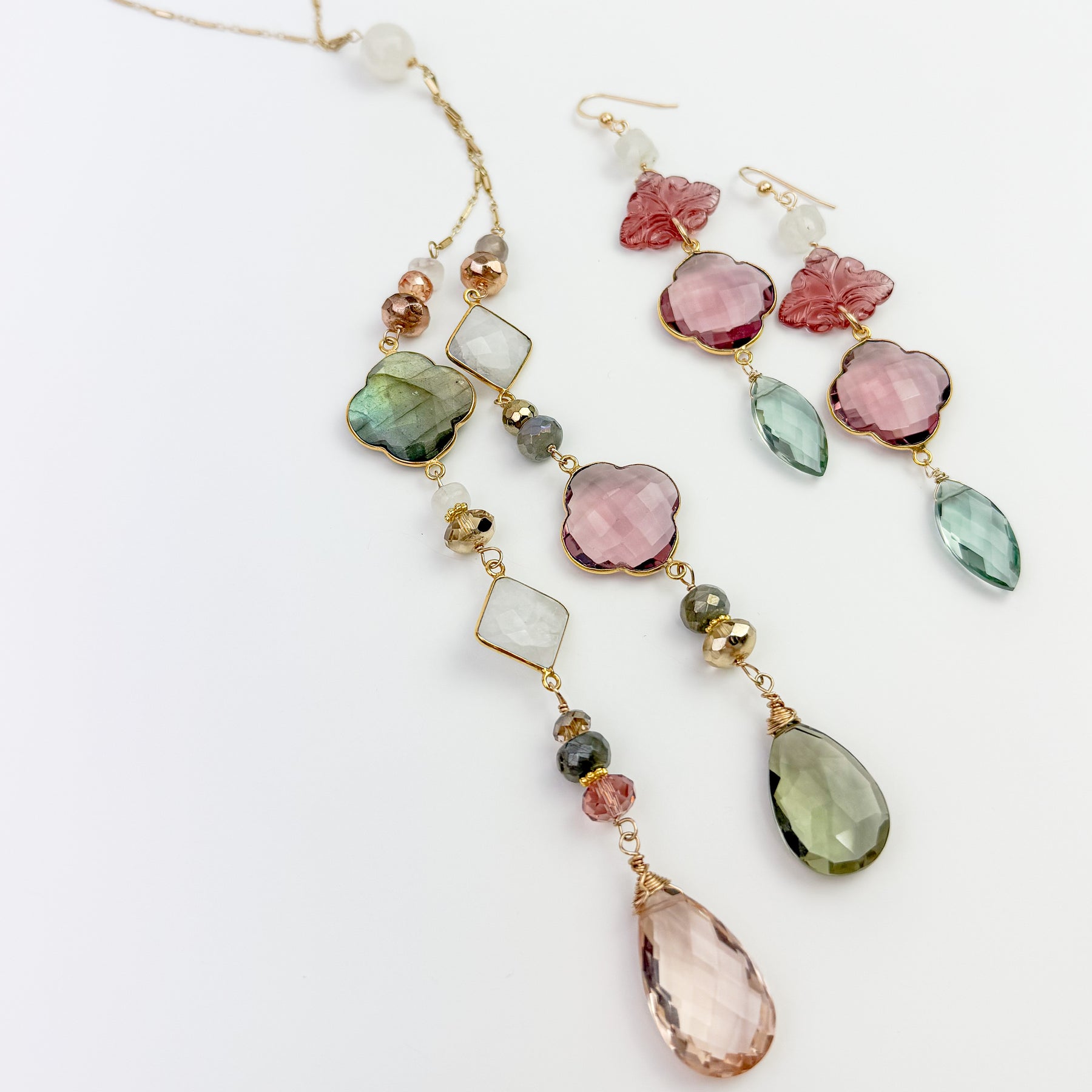 Delicate, expressive, and quietly romantic, the Whispered Petals Lariat & Earring Set is a one-of-a-kind pairing designed to move with grace. Marsala Quartz, Labradorite, Green Amethyst, and Moonstone come together in soft, balanced tones that feel feminine yet grounded.