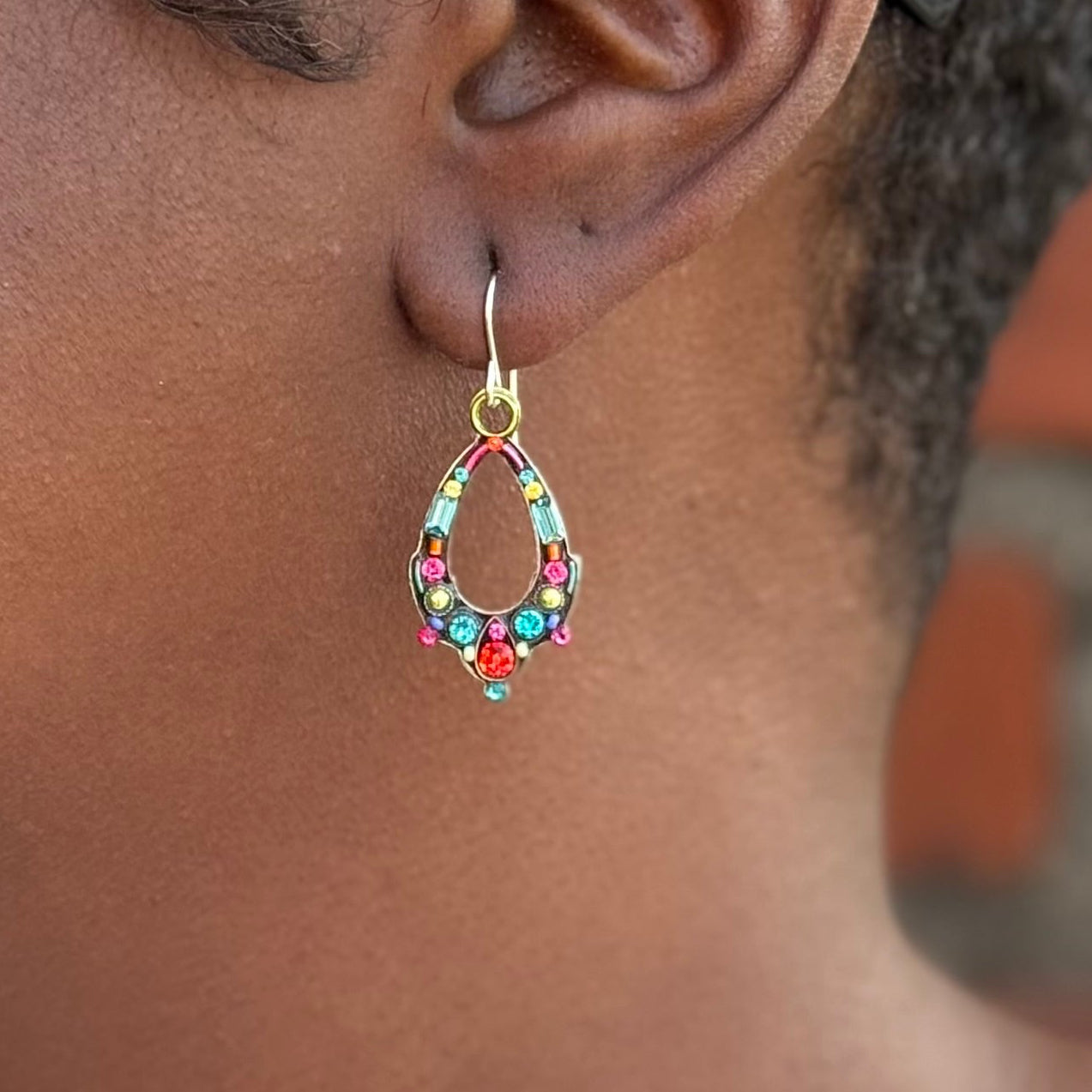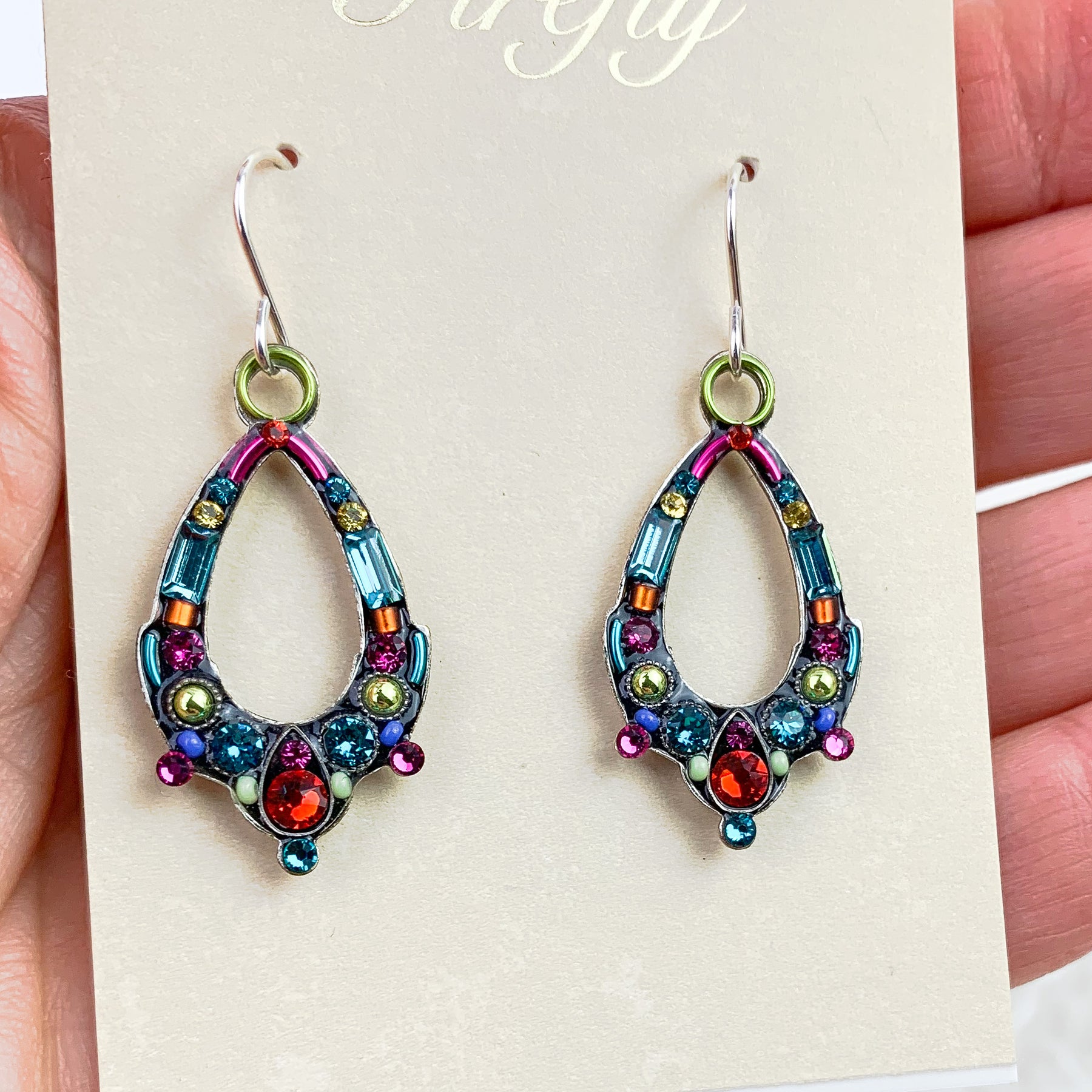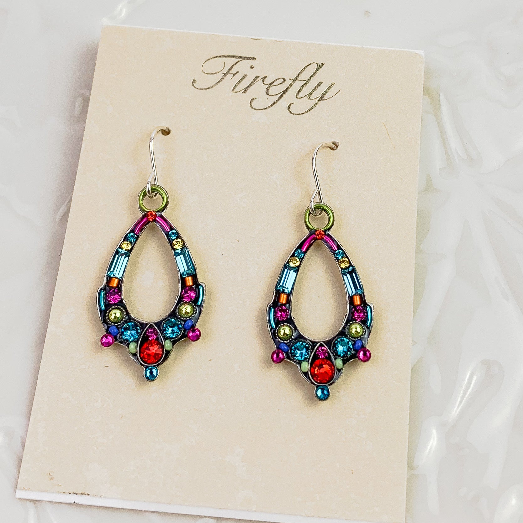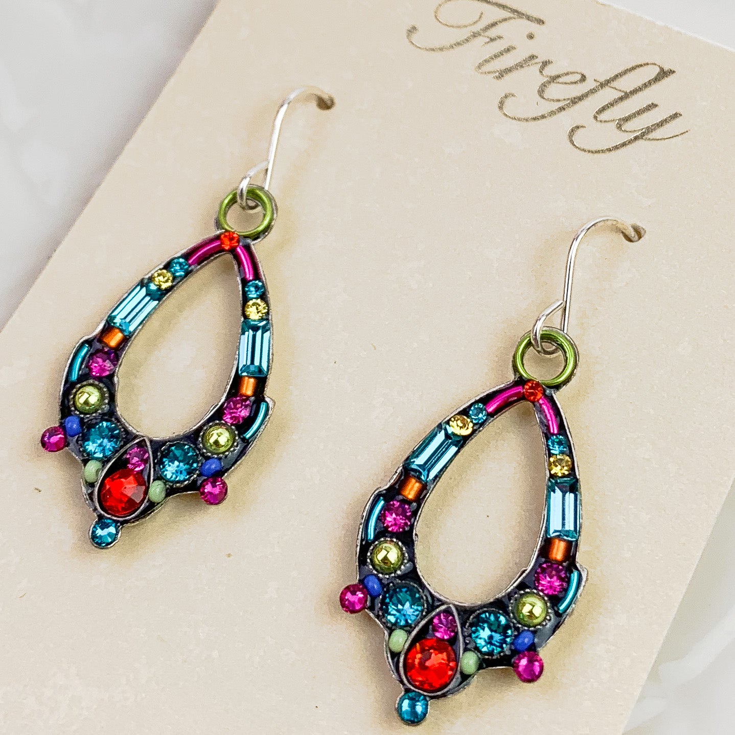 These elegant Firefly teardrop earrings feature a vibrant mix of colorful European crystals set along a graceful open teardrop frame. Bright turquoise, ruby red, fuchsia, and sapphire crystals create a playful mosaic that sparkles beautifully against the antiqued metal setting. Measuring approximately 1.75”, these lightweight earrings offer eye-catching color and artisan detail while remaining comfortable for everyday wear.